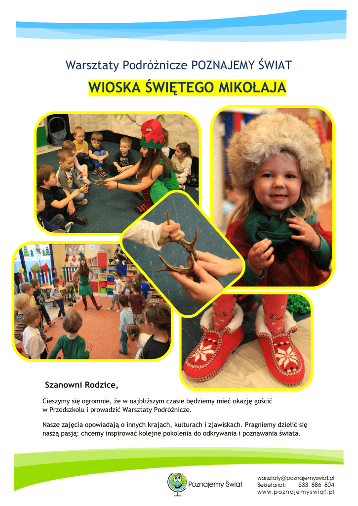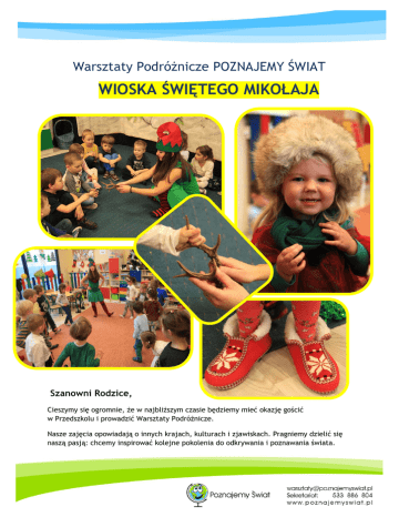 Warsztaty Podróżnicze POZNAJEMY ŚWIAT WIOSKA ŚWIĘTEGO MIKOŁAJA Szanowni Rodzice, Cieszymy się ogromnie, że w najbliższym czasie będziemy mieć okazję gościć w Przedszkolu i prowadzić Warsztaty Podróżnicze. Nasze zajęcia opowiadają o innych krajach, kulturach i zjawiskach. Pragniemy dzielić się naszą pasją: chcemy inspirować kolejne pokolenia do odkrywania i poznawania świata. Mamy potrzebę pokazywać świat takim, jakim on jest naprawdę, bez zniekształceń polityki, mediów i stereotypów. Marzymy o Ziemi bez wojen, zamieszkałej przez ludzi zdolnych do dialogu. Każdy Warsztat prowadzi prawdziwy Podróżnik z wieloletnim doświadczeniem w pracy z dziećmi. Jeśli chcesz poznać naszą Ekipę, zajrzyj na naszą stronę. Na naszych warsztatach „Wioska Świętego Mikołaja”dzieci będą mieć okazję: Poznać krainę zwaną Laponią oraz dowiedzieć się o niej interesujących rzeczy, Odwiedzić Fabrykę Świętego Mikołaja, gdzie powstają prezenty, Zatańczyć wraz z Elfem zimowy taniec, Zdegustować rozgrzewający lapoński napój z przyprawami korzennymi, Poprzebierać się w okolicznościowe stroje. Aby inspirować i ułatwiać pracę w obszarze edukacji międzykulturowej stworzyliśmy „Kufer Pomysłów” dla Rodziców i Wychowawców. W Kufrze są kolorowanki, muzyka, przepisy kulinarne, „zrób to sam” i przykłady zabaw z różnych krańców świata. Zachęcamy do wspólnej zabawy! Organizujemy również Podróżnicze Urodziny w Warszawie, Krakowie oraz Mielcu. Zadzwoń i zamów przyjęcie dla Twojego Dziecka: Marta: +48 533 886 804, [email protected] Przygotowaliśmy dla Ciebie specjalny rabat o wartości 50 zł. Masz pytanie? Napisz [email protected]. Zapraszamy - polub nas na Facebooku, by na bieżąco mieć informacje o nowych warsztatach i promocjach. Z podróżniczym pozdrowieniem, Magda i Marcin Musiałowie i cały zespół POZNAJEMY ŚWIAT www.poznajemyswiat.pl