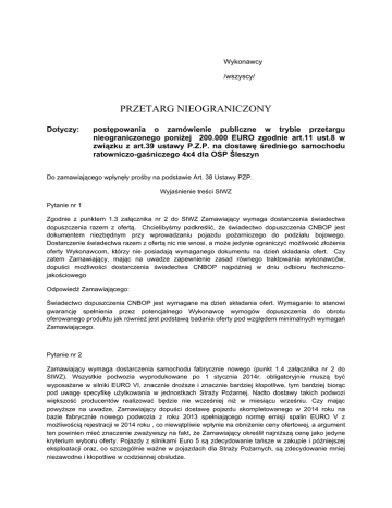 Wykonawcy /wszyscy/ PRZETARG NIEOGRANICZONY Dotyczy: postępowania o zamówienie publiczne w trybie przetargu nieograniczonego poniżej 200.000 EURO zgodnie art.11 ust.8 w związku z art.39 ustawy P.Z.P. na dostawę średniego samochodu ratowniczo-gaśniczego 4x4 dla OSP Śleszyn Do zamawiającego wpłynęły prośby na podstawie Art. 38 Ustawy PZP. Wyjaśnienie treści SIWZ Pytanie nr 1 Zgodnie z punktem 1.3 załącznika nr 2 do SIWZ Zamawiający wymaga dostarczenia świadectwa dopuszczenia razem z ofertą. Chcielibyśmy podkreślić, że świadectwo dopuszczenia CNBOP jest dokumentem niezbędnym przy wprowadzaniu pojazdu pożarniczego do podziału bojowego. Dostarczenie świadectwa razem z ofertą nic nie wnosi, a może jedynie ograniczyć możliwość złożenia oferty Wykonawcom, którzy nie posiadają wymaganego dokumentu na dzień składania ofert. Czy zatem Zamawiający, mając na uwadze zapewnienie zasad równego traktowania wykonawców, dopuści możliwości dostarczenia świadectwa CNBOP najpóźniej w dniu odbioru technicznojakościowego Odpowiedź Zamawiającego: Świadectwo dopuszczenia CNBOP jest wymagane na dzień składania ofert. Wymaganie to stanowi gwarancję spełnienia przez potencjalnego Wykonawcę wymogów dopuszczenia do obrotu oferowanego produktu jak również jest podstawą badania oferty pod względem minimalnych wymagań Zamawiającego. Pytanie nr 2 Zamawiający wymaga dostarczenia samochodu fabrycznie nowego (punkt 1.4 załącznika nr 2 do SIWZ). Wszystkie podwozia wyprodukowane po 1 stycznia 2014r. obligatoryjnie muszą być wyposażane w silniki EURO VI, znacznie droższe i znacznie bardziej kłopotliwe, tym bardziej biorąc pod uwagę specyfikę użytkowania w jednostkach Straży Pożarnej. Nadto dostawy takich podwozi większość producentów realizować będzie nie wcześniej niż w miesiącu wrześniu. Czy mając powyższe na uwadze, Zamawiający dopuści dostawę pojazdu skompletowanego w 2014 roku na bazie fabrycznie nowego podwozia z roku 2013 spełniającego normę emisji spalin EURO V z możliwością rejestracji w 2014 roku , co niewątpliwie wpłynie na obniżenie ceny ofertowej, a argument ten powinien mieć znaczenie zważywszy na fakt, że Zamawiający określił najniższą cenę jako jedyne kryterium wyboru oferty. Pojazdy z silnikami Euro 5 są zdecydowanie tańsze w zakupie i późniejszej eksploatacji oraz, co szczególnie ważne w pojazdach dla Straży Pożarnych, są zdecydowanie mniej niezawodne i kłopotliwe w codziennej obsłudze. Odpowiedź Zamawiającego: Zamawiający nie ogranicza oferowania produktu wg kryterium roku produkcji podwozia ani też norm emisji zanieczyszczeń. Podstawowym i zarazem jedynym kryterium stanowi oferowanie produktu fabrycznie nowego. Pytanie nr 2 Zamawiający wymaga by pojazd posiadał silnik o mocy min. 220 kW (punkt 1.8 załącznika nr 2 do SIWZ). Czy Zmawiający dopuści pojazd z silnikiem o mocy 217kW, a więc różniący się od wymaganego jedynie o 3kW, co nie będzie miało istotnego wpływu na walory użytkowe pojazdu, a pozwoli za to na złożenie ofert przez większą liczbę producentów. Odpowiedź Zamawiającego: Zamawiający określił minimalną moc silnika w jednostkach KM. Zakres mocy przytoczony w pytaniu spełnia wymagania minimalne Zamawiającego. Pytanie nr 3 Zamawiający wymaga układu hamulcowego z hamulcami bębnowymi na wszystkich osiach (punkt 1.30 załącznika nr 2 do SIWZ). Większość opracowań na ten temat jednoznacznie wskazuje, że zastosowanie hamulców tarczowych na obydwu osiach przekłada się bezpośrednio na skuteczność hamowania pojazdu w warunkach drogowych. Ma to bezpośredni wpływ na bezpieczeństwo użytkowników pojazdu oraz innych użytkowników drogi zwłaszcza w trakcie szybkiego dojazdu wozu bojowego do akcji. Zastosowanie hamulców bębnowych na przedniej osi, poprzez wyższą wagę, ma wpływ na pogorszenie kierowalności pojazdem, a w związku z ich zamkniętą konstrukcją hamulce takie wykazują tendencje do przegrzewania się, co z kolei prowadzi do spadku ich skuteczności. Podstawową zaletą hamulców tarczowych jest nieosłonięta struktura. Taka konstrukcja sprawia, że nie pojawia się problem przegrzania hamulców. Ponadto dzięki styczności z opływającymi tarczę powietrzem i wodą ulegają one nie tylko schłodzeniu ale i procesowi samooczyszczania. Czy zatem Zamawiający, mając na uwadze zapewnienie zasad równego traktowania wykonawców i konkurencyjności, dopuści zaproponowanie pojazdów z hamulcami tarczowymi na obu osiach? Odpowiedź Zamawiającego: Zarówno hamulce tarczowe jak i bębnowe w tego typu pojazdach posiadają swoje wady jak i zalety, które w zależności od preferencji użytkownika przewyższają dane rozwiązanie. Po konsultacjach z przyszłymi użytkownikami pojazdu Zamawiający dopuszcza przedmiotowe rozwiązanie, którego wymagania stanowią przedmiot modyfikacji. Pytanie nr 4 Zamawiający wymaga by zbiornik wody był wyposażony we właz rewizyjny- szybko otwierany (punkt 2.14 załącznika nr 2 do SIWZ). Czy Zamawiający dopuści by zbiornik wody posiadał właz rewizyjny, jednakże nie szybko otwierany? Odpowiedź Zamawiającego: Tak Parametr ten jest przedmiotem modyfikacji. Pytanie nr 5 Zamawiający wymaga by autopompa była wyposażona w ręczny dozownik środka pianotwórczego zapewniający uzyskiwanie stężeń 3% i 6% w całym zakresie pracy autopompy (punkt 2.28 załącznika nr 2 do SIWZ). Czy Zamawiający dopuści zaoferowanie autopompy z automatycznym dozownikiem środka pianotwórczego, umożliwiającym uzyskiwanie stężeń 3% i 6% w całym zakresie pracy autopompy, co pozwoli na oszczędność drogiego środka pianotwórczego i czasu w przypadku dołączania kolejnej linii gaśniczej? Odpowiedź Zamawiającego: Zamawiający dopuszcza zaoferowanie autopompy z automatycznym dozownikiem środka pianotwórczego. Parametr jest przedmiotem modyfikacji. Pytanie nr 6 Czy Zamawiający w załączniku nr 