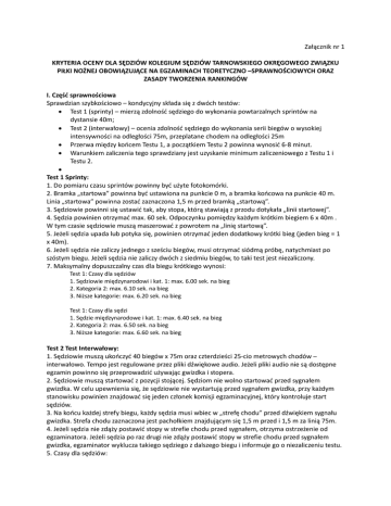 Załącznik nr 1 KRYTERIA OCENY DLA SĘDZIÓW KOLEGIUM SĘDZIÓW TARNOWSKIEGO OKRĘGOWEGO ZWIĄZKU PIŁKI NOŻNEJ OBOWIĄZUJĄCE NA EGZAMINACH TEORETYCZNO –SPRAWNOŚCIOWYCH ORAZ ZASADY TWORZENIA RANKINGÓW I. Część sprawnościowa Sprawdzian szybkościowo – kondycyjny składa się z dwóch testów: Test 1 (sprinty) – mierzą zdolność sędziego do wykonania powtarzalnych sprintów na dystansie 40m; Test 2 (interwałowy) – ocenia zdolność sędziego do wykonania serii biegów o wysokiej intensywności na odległości 75m, przeplatane chodem na odległości 25m Przerwa między końcem Testu 1, a początkiem Testu 2 powinna wynosić 6-8 minut. Warunkiem zaliczenia tego sprawdziany jest uzyskanie minimum zaliczeniowego z Testu 1 i Testu 2. Test 1 Sprinty: 1. Do pomiaru czasu sprintów powinny być użyte fotokomórki. 2. Bramka „startowa” powinna być ustawiona na punkcie 0 m, a bramka końcowa na punkcie 40 m. Linia „startowa” powinna zostać zaznaczona 1,5 m przed bramką „startową”. 3. Sędziowie powinni się ustawić tak, aby stopa, którą stawiają z przodu dotykała „linii startowej”. 4. Sędzia powinien otrzymać max. 60 sek. Odpoczynku pomiędzy każdym krótkim biegiem 6 x 40m . W tym czasie sędziowie muszą maszerować z powrotem na „linię startową”. 5. Jeżeli sędzia upada lub potyka się, powinien otrzymać jeden dodatkowy krótki bieg (jeden bieg = 1 x 40m). 6. Jeżeli sędzia nie zaliczy jednego z sześciu biegów, musi otrzymać siódmą próbę, natychmiast po szóstym biegu. Jeżeli sędzia nie zaliczy dwóch z siedmiu biegów, to taki test jest niezaliczony. 7. Maksymalny dopuszczalny czas dla biegu krótkiego wynosi: Test 1: Czasy dla sędziów 1. Sędziowie międzynarodowi i kat. 1: max. 6.00 sek. na bieg 2. Kategoria 2: max. 6.10 sek. na bieg 3. Niższe kategorie: max. 6.20 sek. na bieg Test 1: Czasy dla sędzi 1. Sędzie międzynarodowe i kat. 1: max. 6.40 sek. na bieg 2. Kategoria 2: max. 6.50 sek. na bieg 3. Niższe kategorie: max. 6.60 sek. na bieg Test 2 Test Interwałowy: 1. Sędziowie muszą ukończyć 40 biegów x 75m oraz czterdzieści 25-cio metrowych chodów – interwałowo. Tempo jest regulowane przez pliki dźwiękowe audio. Jeżeli pliki audio nie są dostępne egzamin powinno się przeprowadzić używając gwizdka i stopera. 2. Sędziowie muszą startować z pozycji stojącej. Sędziom nie wolno startować przed sygnałem gwizdka. W celu upewnienia się, że sędziowie nie wystartują przed sygnałem gwizdka, przy każdym stanowisku powinien znajdować się jeden członek komisji egzaminacyjnej, który kontroluje start sędziów. 3. Na końcu każdej strefy biegu, każdy sędzia musi wbiec w „strefę chodu” przed dźwiękiem sygnału gwizdka. Strefa chodu zaznaczona jest pachołkiem znajdującym się 1,5 m przed i 1,5 m za linią 75m. 4. Jeżeli sędzia nie zdąży postawić stopy w strefie chodu przed sygnałem, otrzyma ostrzeżenie od egzaminatora. Jeżeli sędzia po raz drugi nie zdąży postawić stopy w strefie chodu przed sygnałem gwizdka, egzaminator wyklucza takiego sędziego z dalszego biegu i informuje go o niezaliczeniu testu. 5. Czasy dla sędziów: Test 2: Czasy dla sędziów 1. Sędziowie międzynarodowi i kat. 1: max. 15 sek. / 75 m biegu i 18 sek. / 25 m chodu 2. Kategoria 2: max. 15 sek. / 75 m biegu i 20 sek. / 25 m chodu 3. Niższe kategorie: max. 15 sek. / 75 m biegu i 22 sek. / 25 m chodu. Test 2: Czasy dla sędzi 1. Sędzie międzynarodowe i kat. 1: max. 17 sek. / 75 m biegu i 20 sek. / 25 m chodu 2. Kategoria 2: max. 17 sek. / 75 m biegu i 22 sek. / 25 m chodu 3. Niższe kategorie: max. 17 sek. / 75 m biegu i 24 sek. / 25 chodu. W sezonie 2016/17 limity zaliczeniowe wynoszą: Dla sędziów grupy O – w rundzie jesiennej kategoria 2 dla sędzi(17”/22”), w wiosennej niższe kategorie dla sędziów (15”/22”) Dla sędziów grupy V – w rundzie jesiennej test Coopera (2400 m), w wiosennej niższe kategorie dla sędzi (17”/24”) II. Test teoretyczny 1. Test składa się z 30 pytań. 2. Czas trwania egzaminu – 30 minut. 3. Punktacja: III. Rankingi 1. Każdy obserwator tworzy w trakcie rundy ranking obserwowanych sędziów z grupy O. Osobny ranking jest tworzony w rundzie jesiennej oraz wiosennej. Na koniec sezonu wyciągana jest średnia z obu rankingów. 2. Po każdych zawodów obserwator przesyła wraz z arkuszem obserwacji swój aktualny ranking obserwowanych sędziów. 3. Po zakończeniu rundy Komisja Szkoleniowa podliczy wyniki uzyskane w rankingach poszczególnych obserwatorów wg następujących reguł: a. Za pierwsze miejsce w rankingu przyznaje się 6 pkt, za ostatnie 1 pkt. b. Liczba punktów za pozostałe miejsca jest przyznawana proporcjonalnie do liczby sędziów, którzy znaleźli się w danym rankingu Przykład 1. Ranking liczy 6 sędziów (x=5pkt/5miejsc=1 pkt/miejsce) 1 miejsce – 6 pkt. 2 miejsce – 5 pkt. 3 miejsce – 4 pkt. 4 miejsce – 3 pkt. 5 miejsce – 2 pkt. 6 miejsce – 1 pkt. Przykład 2. Ranking liczy 4 sędziów (x=5pkt/3miejsca=1,667 pkt/miejsce) 1 miejsce – 6 pkt. 2 miejsce – 4,333 pkt. 3 miejsce – 2,666 pkt. 4 miejsce – 1 pkt. Przykład 3. Ranking liczy 8 sędziów (x=5pkt/7miejsc=0,714pkt/miejsce) 1 miejsce – 6 pkt. 2 miejsce – 5,286 pkt. 3 miejsce – 4,572 pkt. 4 miejsce – 3,858 pkt. 5 miejsce – 3,144 pkt. 6 miejsce – 2,430 pkt. 7 miejsce – 1,716 pkt. 8 miejsce – 1 pkt.