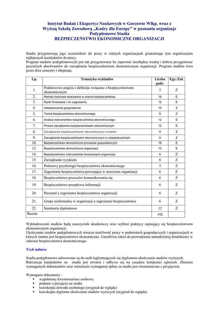 Instytut Badań i Ekspertyz Naukowych w Gorzowie Wlkp. wraz z Wyższą Szkołą Zawodową „Kadry dla Europy” w poznaniu organizuje Podyplomowe Studia BEZPIECZEŃSTWO EKONOMICZNE ORGANIZACJI Studia przygotowują jego uczestników do pracy w różnych organizacjach gwarantując tym organizacjom najlepszych kandydatów do pracy. Program studiów podyplomowych jest tak przygotowany by zapewnić niezbędną wiedzę i dobrze przygotować przyszłych absolwentów do zarządzania bezpieczeństwem ekonomicznym organizacji. Program studiów trwa przez dwa semestry i obejmuje. Tematyka wykładów Lp. Liczba godz. Egz./Zal. Podstawowe pojęcia i definicje związane z bezpieczeństwem ekonomicznym 3 Z 2. 3. Metody ilościowe stosowane w ocenie bezpieczeństwa 18 E Rynki finansowe i ich zagrożenia 12 E 4. Ubezpieczenia gospodarcze 15 Z 5. Teorie bezpieczeństwa ekonomicznego 9 Z 6. Analiza instrumentów bezpieczeństwa ekonomicznego 12 E 7. Proces zarządzania bezpieczeństwem ekonomicznym 12 E 8. Zarządzanie bezpieczeństwem ekonomicznym w banku 9 Z 1. 9. 10. 12. Zarządzanie bezpieczeństwem ekonomicznym w ubezpieczeniach 9 Z Bezpieczeństwo ekonomiczne procesów gospodarczych 18 E Bezpieczeństwo ekonomiczne organizacji 15 E 14. Bezpieczeństwo instrumentów finansowych organizacji 6 Z 15. Zarządzanie ryzykiem 6 Z 16. Podstawy psychologii bezpieczeństwa ekonomicznego 3 Z 17. Zagrożenia bezpieczeństwa powstające w otoczeniu organizacji 6 E 18. Bezpieczeństwo procesów komunikowania się 6 Z 19. Bezpieczeństwo przepływu informacji 6 Z 20. Personel a zagrożenie bezpieczeństwa organizacji 6 Z 21. Grupy nieformalne w organizacji a zagrożenie bezpieczeństwa 6 Z Seminaria dyplomowe 12 Z 22. Razem 192 Wykładowcami studiów będą nauczyciele akademiccy oraz wybitni praktycy zajmujący się bezpieczeństwem ekonomicznym organizacji. Ukończenie studiów podyplomowych stwarza możliwość pracy w podmiotach gospodarczych i organizacjach w których istotne jest bezpieczeństwo ekonomiczne. Umożliwia także do prowadzenia samodzielnej działalności w zakresie bezpieczeństwa ekonomicznego. Tryb naboru Studia podyplomowe adresowane są do osób legitymujących się dyplomem ukończenia studiów wyższych. Rekrutacja kandydatów na studia jest otwarta i odbywa się na zasadzie kolejności zgłoszeń. Złożenie wymaganych dokumentów oraz wniesienie wymaganej opłaty za studia jest równoznaczne z przyjęciem. Wymagane dokumenty : wypełniony kwestionariusz osobowy podanie o przyjęcie na studia kserokopia dowodu osobistego (oryginał do wglądu) kserokopia dyplomu ukończenia studiów wyższych (oryginał do wglądu) 2 fotografie dowód wpłaty czesnego (lub jego raty) na wskazane konto w przypadku płatności ratami – oświadczenie o wpłacie ratalnej Organizacja studiów Studia trwają dwa semestry. Zajęcia odbywać się będą w piątki, soboty i niedziele. Termin rozpoczęcia zajęć: kwiecień 2011 r. Przewidywany termin zakończenia zajęć: styczeń 2012 r. Warunki ukończenia studiów: uzyskanie zaliczenia z przedmiotów zdanie egzaminów z przedmiotów napisanie pracy dyplomowej i jej obrona. Po ukończeniu studiów student otrzymuje świadectwo ukończenia studiów podyplomowych. Czesne Opłatę za studia w wysokości 4.900,00 zł. należy przekazać w terminie do 31 marca 2011 r. na konto Instytutu Badań i Ekspertyz Naukowych w Gorzowie Wlkp.: PKO BP S.A. II Oddział w Gorzowie Wlkp. konto nr 09 1020 1967 0000 8502 0071 7371 Odpłatność za studia może być wnoszona także w ratach – maksymalnie 5 - ciu, które wynoszą: pierwsza w wysokości 2.400,00 zł. płatna do 31.03.2011 r. i cztery raty po 625,00 zł. płatne w terminach do: 30.04.2011, 31.05.2011, 30.09.2011, 30.10.2011r. Opłata za wydanie świadectwa ukończenia studiów podyplomowych wraz z odpisem wynosi 70,00 zł. Sekretariat Studiów Komplet dokumentów należy złożyć do 31 marca 2011 r. w Instytucie Badań i Ekspertyz Naukowych w Gorzowie Wlkp. drogą elektroniczną - e-mail: [email protected] lub [email protected] (Tel.+48957226564) zaś podpisane oryginały dokumentów listem za potwierdzeniem odbioru. Warunkiem uruchomienia studiów jest zgłoszenie minimum 20 kandydatów.