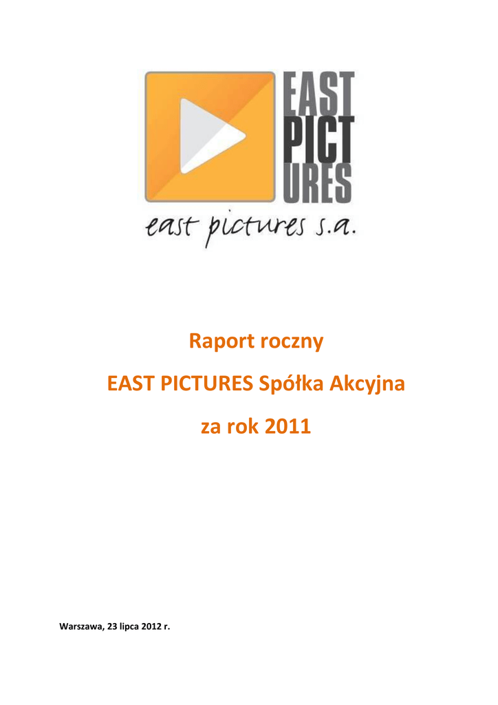 Raport roczny EAST PICTURES Spółka Akcyjna za rok 2011 Warszawa, 23 lipca 2012 r. Raport roczny EAST PICTURES S.A. – Pismo Prezesa Zarządu 2011 Pismo Prezesa Zarządu East Pictures S.A. Szanowni Akcjonariusze, Minął drugi rok działalności operacyjnej East Pictures S.A. W przeciwieństwie do roku 2010, który był dla Spółki, okresem zdobywania doświadczeń, kontaktów, weryfikacji wcześniejszych założeń, a przede okresem szukania rozwiązań, pozwalających na realizację ogólnej koncepcji funkcjonowania Spółki oraz udowodnienie, że można w Polsce pozyskać środki na produkcję filmową, łącząc oczekiwania rynków finansowych z potrzebami rynku filmowego, rok 2011 stał pod znakiem realizacji wszystkich założeń i planów opracowanych w roku 2010. Koncepcja rozwoju Spółki poprzez produkcję relatywnie niewielkich pod względem budżetu projektów okazała się jak najbardziej skuteczna. Inwestorzy pozytywnie zareagowali na przyjęty przez Zarząd model działania, dzięki czemu Spółka pozyskała finansowanie na swoją działalność zarówno poprzez emisje akcji, jak i obligacji. Dzięki przyjętej strategii rozwoju i zaufaniu inwestorów Spółka mogła się skupić na działalności operacyjnej W roku 2011 całkowicie ukończona produkcję dwóch filmów fabularnych – krótkometrażowego filmu w technologii 3D „4:13 do Katowic” z Robertem Więckiewiczem w roli głównej oraz pełnometrażowego filmu dla młodzieży „Sparrow”. Ukończono zdjęcia do filmu dokumentalnego „Six Degrees of Separation” oraz zakończono nagrania dwóch płyt muzycznych zespołów „Nancy Regan” i „Wolny Przedział”. Płyta drugiego zespołu została również wydana i skierowana do sprzedaży. Oddajemy w Państwa ręce Raport Roczny za rok 2011 pełni dumy, że przyjęte założenia rozwoju Spółki okazały się skuteczne oraz optymizmu, co do dalszych perspektyw dla East Pictures. Jesteśmy przekonani, że zaufanie, jakim Państwo obdarzyli naszą Spółkę przełoży się w kolejnych latach na wymierne korzyści. Z wyrazami szacunku Tomasz Tokarski Prezes Zarządu E a s t P i c t u r e s S . A . , Ż u r a w i a 2 2 , 0 0 - 5 1 5 W a r s z a w a Strona 2 Raport roczny EAST PICTURES S.A. – Sprawozdanie Zarządu 2011 Sprawozdanie Zarządu z działalności EAST PICTURES Spółka Akcyjna za rok 2011 Warszawa, 23 lipca 2012 r. E a s t P i c t u r e s S . A . , Ż u r a w i a 2 2 , 0 0 - 5 1 5 W a r s z a w a Strona 3 Raport roczny EAST PICTURES S.A. – Sprawozdanie Zarządu I. 2011 DANE O SPÓŁCE 1. Nazwa i siedziba spółki East Pictures Spółka Akcyjna ul. Żurawia 22 lok.613 00-515 Warszawa REGON: 141971378 NIP: 521-354-53-29 2. Data utworzenia spółki Spółka została zawiązana Aktem Notarialnym (Rep. A nr 2551/2009) z dnia 12 sierpnia 2009 roku. Czas trwania Spółki jest nieograniczony. 3. Założyciele Założycielami Spółki są osoby fizyczne: Aleksandra Ewa Tokarska Izabela Ewa Plucińska Patryk Sebastian Vega 4. Sąd Rejestrowy 6 października 2009 r. Spółka została zarejestrowana w Krajowym Rejestrze Sądowym (Sąd Rejonowy dla M. St. Warszawy w Warszawie, XII Wydział Gospodarczy Krajowego Rejestru Sądowego, sygnatura akt WA.XIII NS-REJ.KRS/30301/09/752) pod numerem KRS: 0000338720. 5. Przedmiot Działalności Spółki Zgodnie z zapisem w Krajowym Rejestrze Sądowym przedmiotem działalności Spółki jest: 1. Działalność związana z filmami, nagraniami wideo i programami telewizyjnymi (PKD 59.1); E a s t P i c t u r e s S . A . , Ż u r a w i a 2 2 , 0 0 - 5 1 5 W a r s z a w a Strona 4 Raport roczny EAST PICTURES S.A. – Sprawozdanie Zarządu 2011 2. Działalność w zakresie nagrań dźwiękowych i muzycznych (PKD 59.2); 3. Działalność związana z oprogramowaniem i doradztwem w zakresie informatyki oraz działalność powiązana (PKD 62); 4. Działalność usługowa w zakresie informacji (PKD 63); 5. Reklama, badanie rynku i opinii publicznej (PKD 73); 6. Pozostała działalność profesjonalna, naukowa i techniczna (PKD 74); 7. Działalność twórcza związana z kulturą i rozrywką (PKD 90); 6. Kapitał Spółki Kapitał zakładowy Spółki na koniec roku 2011 wynosił 330.000,00 (słownie: trzysta trzydzieści tysięcy) złotych polskich i dzielił się na: - 1.000.000 (jeden milion) akcji na okaziciela serii A o wartości nominalnej 0,20 zł (dwadzieścia groszy) każda. - 50.000 (pięćdziesiąt tysięcy) akcji na okaziciela serii B o wartości nominalnej 0,20 zł (dwadzieścia groszy) każda. - 300.000 (trzysta tysięcy) akcji na okaziciela serii C o wartości nominalnej 0,20 zł (dwadzieścia groszy) każda. - 300.000 (trzysta tysięcy) akcji na okaziciela serii D o wartości nominalnej 0,20 zł (dwadzieścia groszy) każda. II. DANE O OSOBACH ZARZĄDZAJĄCYCH Zarząd Spółki Według Umowy Spółki w brzmieniu na dzień sporządzenia sprawozdania Zarząd składa się od jednej do dwóch osób. Członków Zarządu powołuje i odwołuje Rada Nadzorcza, Prezesa Zarządu powołują i odwołują Założyciele Spółki oświadczeniem składanym na piśmie Radzie Nadzorczej. Kadencja Zarządu trwa 5 lat i jest wspólna dla wszystkich Członków Zarządu, co oznacza, że mandaty Członków Zarządu powołanych w trakcie trwania kadencji wygasają równocześnie z mandatami pozostałych Członków Zarządu. E a s t P i c t u r e s S . A . , Ż u r a w i a 2 2 , 0 0 - 5 1 5 W a r s z a w a Strona 5 Raport roczny EAST PICTURES S.A. – Sprawozdanie Zarządu 2011 Wynagrodzenie Zarządu ustala Rada Nadzorcza, która może również przyznać dodatkowe wynagrodzenie w postaci opcji na akcje Spółki. Zarząd prowadzi sprawy Spółki i reprezentuje Spółkę we wszystkich czynnościach sądowych i pozasądowych oraz jest uprawniony do podejmowania wszelkich decyzji wymaganych dla prawidłowej działalności Spółki niezastrzeżonych do kompetencji Rady Nadzorczej i Walnego Zgromadzenia. W roku 2011 Spółkę jednoosobowo reprezen