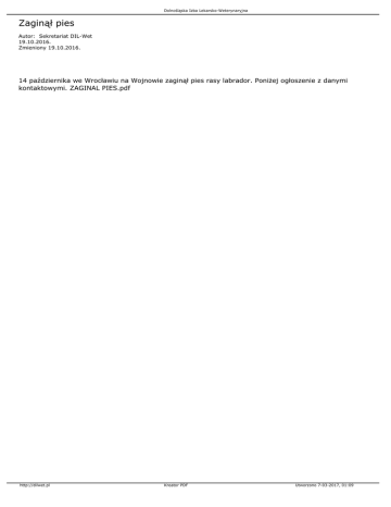 Dolnośląska Izba Lekarsko-Weterynaryjna Zaginął pies Autor: Sekretariat DIL-Wet 19.10.2016. Zmieniony 19.10.2016. 14 października we Wrocławiu na Wojnowie zaginął pies rasy labrador. Poniżej ogłoszenie z danymi kontaktowymi. ZAGINAL PIES.pdf http://dilwet.pl Kreator PDF Utworzono 7-03-2017, 01:09
