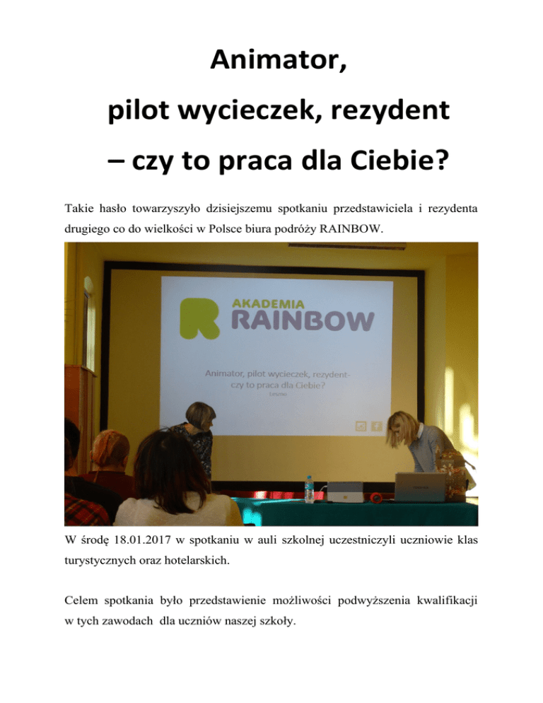 Animator, pilot wycieczek, rezydent – czy to praca dla Ciebie? Takie hasło towarzyszyło dzisiejszemu spotkaniu przedstawiciela i rezydenta drugiego co do wielkości w Polsce biura podróży RAINBOW. W środę 18.01.2017 w spotkaniu w auli szkolnej uczestniczyli uczniowie klas turystycznych oraz hotelarskich. Celem spotkania było przedstawienie możliwości podwyższenia kwalifikacji w tych zawodach dla uczniów naszej szkoły. Uczniowie zapoznali się z szeroką ofertą szkoleń i kursów w zawodach takich jak: animator czasu wolnego, pilot wycieczek, rezydent turystyczny. Mamy nadzieję, że pierwszy kurs dla animatorów odbędzie się już wkrótce w naszej szkole. Prowadzone są również działania w celu objęcia patronatem uczniów kierunku turystycznego przez goszczące dzisiaj u nas biuro RAINBOW. Ewa Steyer