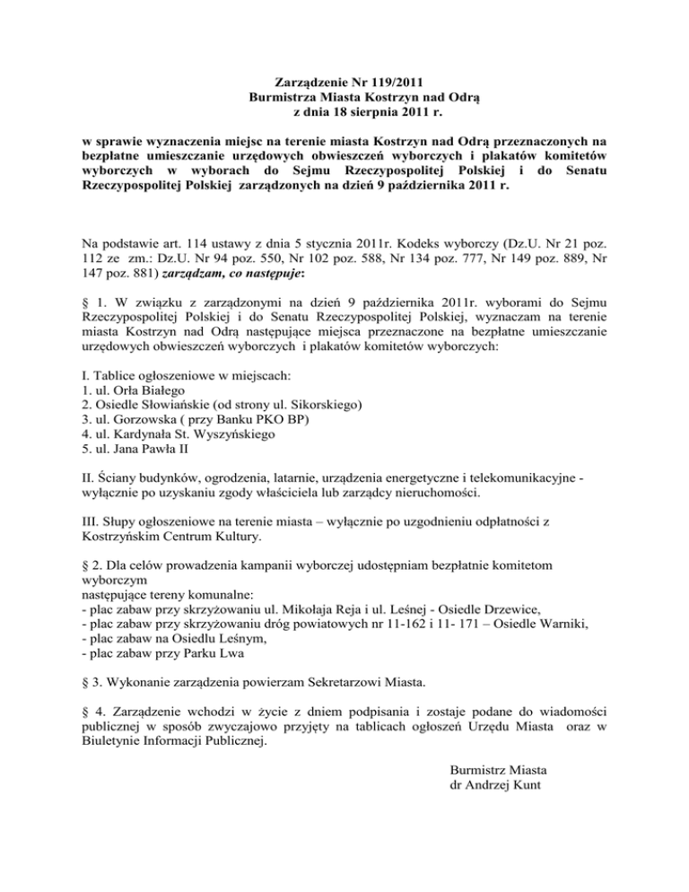 Zarządzenie Nr 119/2011 Burmistrza Miasta Kostrzyn nad Odrą z dnia 18 sierpnia 2011 r. w sprawie wyznaczenia miejsc na terenie miasta Kostrzyn nad Odrą przeznaczonych na bezpłatne umieszczanie urzędowych obwieszczeń wyborczych i plakatów komitetów wyborczych w wyborach do Sejmu Rzeczypospolitej Polskiej i do Senatu Rzeczypospolitej Polskiej zarządzonych na dzień 9 października 2011 r. Na podstawie art. 114 ustawy z dnia 5 stycznia 2011r. Kodeks wyborczy (Dz.U. Nr 21 poz. 112 ze zm.: Dz.U. Nr 94 poz. 550, Nr 102 poz. 588, Nr 134 poz. 777, Nr 149 poz. 889, Nr 147 poz. 881) zarządzam, co następuje: § 1. W związku z zarządzonymi na dzień 9 października 2011r. wyborami do Sejmu Rzeczypospolitej Polskiej i do Senatu Rzeczypospolitej Polskiej, wyznaczam na terenie miasta Kostrzyn nad Odrą następujące miejsca przeznaczone na bezpłatne umieszczanie urzędowych obwieszczeń wyborczych i plakatów komitetów wyborczych: I. Tablice ogłoszeniowe w miejscach: 1. ul. Orła Białego 2. Osiedle Słowiańskie (od strony ul. Sikorskiego) 3. ul. Gorzowska ( przy Banku PKO BP) 4. ul. Kardynała St. Wyszyńskiego 5. ul. Jana Pawła II II. Ściany budynków, ogrodzenia, latarnie, urządzenia energetyczne i telekomunikacyjne wyłącznie po uzyskaniu zgody właściciela lub zarządcy nieruchomości. III. Słupy ogłoszeniowe na terenie miasta – wyłącznie po uzgodnieniu odpłatności z Kostrzyńskim Centrum Kultury. § 2. Dla celów prowadzenia kampanii wyborczej udostępniam bezpłatnie komitetom wyborczym następujące tereny komunalne: - plac zabaw przy skrzyżowaniu ul. Mikołaja Reja i ul. Leśnej - Osiedle Drzewice, - plac zabaw przy skrzyżowaniu dróg powiatowych nr 11-162 i 11- 171 – Osiedle Warniki, - plac zabaw na Osiedlu Leśnym, - plac zabaw przy Parku Lwa § 3. Wykonanie zarządzenia powierzam Sekretarzowi Miasta. § 4. Zarządzenie wchodzi w życie z dniem podpisania i zostaje podane do wiadomości publicznej w sposób zwyczajowo przyjęty na tablicach ogłoszeń Urzędu Miasta oraz w Biuletynie Informacji Publicznej. Burmistrz Miasta dr Andrzej Kunt