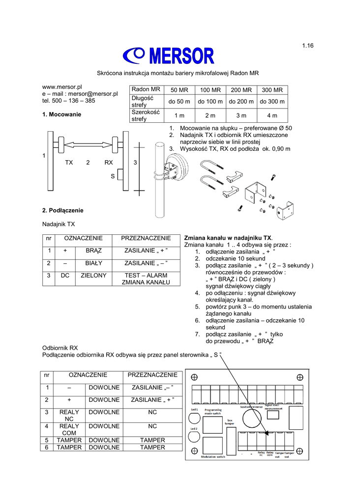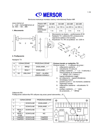 1.16 Skrócona instrukcja montażu bariery mikrofalowej Radon MR www.mersor.pl e – mail : [email protected] tel. 500 – 136 – 385 1. Mocowanie Radon MR Długość strefy Szerokość strefy 50 MR 100 MR 200 MR 300 MR do 50 m do 100 m do 200 m do 300 m 1m 2m 3m 4m 1. Mocowanie na słupku – preferowane Ø 50 2. Nadajnik TX i odbiornik RX umieszczone naprzeciw siebie w linii prostej 3. Wysokość TX, RX od podłoża ok. 0,90 m 1 TX 2 RX 3 S 2. Podłączenie Nadajnik TX nr OZNACZENIE PRZEZNACZENIE 1 + BRĄZ ZASILANIE „ + ” 2 – BIAŁY ZASILANIE „ – ” 3 DC ZIELONY TEST – ALARM ZMIANA KANAŁU Zmiana kanału w nadajniku TX. Zmiana kanału 1 .. 4 odbywa się przez : 1. odłączenie zasilania „ + ” 2. odczekanie 10 sekund 3. podłącz zasilanie „ + ” ( 2 – 3 sekundy ) równocześnie do przewodów : „ + ” BRĄZ i DC ( zielony ) sygnał dźwiękowy ciągły 4. po odłączeniu : sygnał dźwiękowy określający kanał. 5. powtórz punk 3 – do momentu ustalenia żądanego kanału 6. odłączenie zasilania – odczekanie 10 sekund 7. podłącz zasilanie „ + ” tylko do przewodu „ + ” BRĄZ Odbiornik RX Podłączenie odbiornika RX odbywa się przez panel sterownika „ S ” nr OZNACZENIE PRZEZNACZENIE 1 – DOWOLNE ZASILANIE „– ” 2 + DOWOLNE ZASILANIE „ + ” 3 REALY NC REALY COM TAMPER TAMPER DOWOLNE NC DOWOLNE NC DOWOLNE DOWOLNE TAMPER TAMPER 4 5 6 3. Mierzenie i ustalanie poziomu sygnału. 1. Podłącz miernik do zacisku pomiarowego ( kabel dołączony do zestawu ). 2. Ustaw miernik na pomiar 20 VDC. 3. Naciśnij przycisk trybu programowania jedna sekunda : wejście 4. Ustalanie poziomu sygnału, dioda mruga Ustaw odbiornik RX i nadajnik TX tak aby uzyskać jak najwyższy poziom sygnału. ( prawidłowy poziom wynosi : 0,5 do 4,8 VDC ). 5. Naciśnij przycisk trybu programowania – jedna sekunda : wyjście Uwaga : Poziom sygnału można ustawić : odbiornik RX i nadajnik TX są zsynchronizowane ( ustawiony mają taki sam kanał ) 4. Zmiana kanału w odbiorniku RX – modulacja częstotliwości ( 1 .. 4 ). 1. Przy odłączonym zasilaniu : – naciśnij przycisk zmiany kanału 2. Podłącz zasilanie : dioda LED szybko mruga 3. Zwolnij przycisk, kiedy dioda szybko mruga : dioda LED mruga, wskazuje ustawiony kanał 4. Naciśnij przycisk, zwolnij przycisk ( punk 3 ): – powtarzaj czynność do momentu ustalenia żądanego kanału 5. Odłącz zasilanie na 10 sekund. 6. Podłącz zasilanie, nie trzymając przycisku – dioda LED mruga – wskazuje ustawiony kanał + – Uwaga : Odbiornik RX i nadajnik TX muszą mieć ustawiony taki sam kanał. 5. Regulacja czułości bariery mikrofalowej Radon MR Regulacja czułości bariery jest manualna - panel sterowania 1. Strefa detekcji, wykrywania przejścia musi być wolna od przeszkód takich jak drzewa, krzewy, murki, rowy, elementy metalowe itp. – idealny jest płaski, równy, wolny od przeszkód teren ( uwaga – praktyczna wskazówka : np.: hydrant, lampa może znajdować się w strefie detekcji, lecz nie bliżej niż 0,7 m od osi strefy detekcji, żadna przeszkoda nie może znajdować się w osi strefy ) 2. Regulacja polega na powtarzaniu czynności : przejścia człowieka przez strefę detekcji z równoczesnym regulowaniem czułości ( + / – ) . 3. Człowiek przechodzi w pozycji wyprostowanej ( np.: w trzech miejscach ) przez strefę detekcji. Przeprowadzamy regulację. 4. Człowiek przechodzi w pozycji skulonej, zgiętej ( np. : w trzech miejscach ) przez strefę detekcji. Regulujemy czułość ( + / – ) do uzyskania alarmu. 5. Po wyregulowaniu ( uzyskaniu alarmu ) lekko zwiększamy czułość. Uwaga : Tak wyregulowana bariera mikrofalowa Radon MR gwarantuje wykrycie sprawcy przekraczającego strefę detekcji, oraz sprawia iż bariera mikrofalowa jest odporna na zakłócenia i nie generuje fałszywych alarmów. 6. Włączenie i wyłączenie strefy detekcji ( strefy alarmowej ). Bariery mikrofalowe Radon MR można podłączyć do dowolnej centrali alarmowej. Czujnik stanowi integralną część systemu alarmowego. Ustawienie strefy alarmowej w dowolnej centrali alarmowej umożliwia wykorzystanie pełnej gamy możliwości wyłączania i włączenia strefy : • Pilot • Klawiatura zewnętrzna • Telefon ( mobilne wykorzystanie, np.: zdalne zarządzanie pozwala na pełną kontrolę dostępu do posesji, placu, składu ) • Karta • Domofon • i wiele innych rozwiązań oferowanych przez producentów systemów alarmowych. Uwaga : Nowoczesne systemy alarmowe posiadają wiele rozwiązań radiolinii, umożliwiają łatwe i szybkie podłączenie barier mikrofalowych Radon MR, rozwiązanie takie pozwala na znaczne ograniczenie kosztów instalacji. 7. Utrzymanie sprawności systemu alarmowego. Systematyczne przeglądy i konserwacja systemu alarmowego gwarantują najwyższą jakość i sprawność w wykrywaniu intruza. Szczególną uwagę należy zwrócić na porastające krzewy, gałęzie drzew oraz na zaśmiecanie strefy detekcji. Zestaw zawiera : 1. Nadajnik TX 2. Odbiornik RX + panel sterowania 3. Mocowanie odbiornika TX i nadajnika RX 4. Kabel do zacisku pomiarowego Niniejsza skrócona instrukcja obsługi zawiera informację dotyczące montażu i obsługi bariery mikrofalowej Radon MR. Firma Mersor zastrzega sobie prawo do zmiany informacji zawartej w tej instrukcji bez jakichkolwiek konsekwencji prawnych. Opracował Grzegorz Czapp