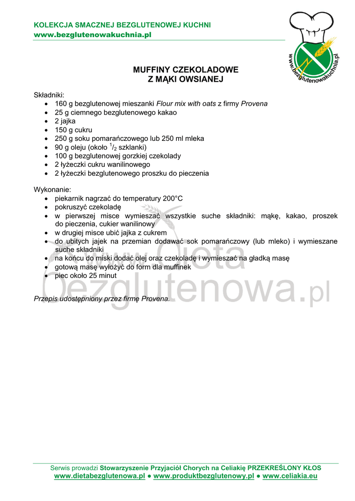 KOLEKCJA SMACZNEJ BEZGLUTENOWEJ KUCHNI www.bezglutenowakuchnia.pl MUFFINY CZEKOLADOWE Z MĄKI OWSIANEJ Składniki: 160 g bezglutenowej mieszanki Flour mix with oats z firmy Provena 25 g ciemnego bezglutenowego kakao 2 jajka 150 g cukru 250 g soku pomarańczowego lub 250 ml mleka 90 g oleju (około 1/2 szklanki) 100 g bezglutenowej gorzkiej czekolady 2 łyżeczki cukru wanilinowego 2 łyżeczki bezglutenowego proszku do pieczenia Wykonanie: piekarnik nagrzać do temperatury 200°C pokruszyć czekoladę w pierwszej misce wymieszać wszystkie suche składniki: mąkę, kakao, proszek do pieczenia, cukier wanilinowy w drugiej misce ubić jajka z cukrem do ubitych jajek na przemian dodawać sok pomarańczowy (lub mleko) i wymieszane suche składniki na końcu do miski dodać olej oraz czekoladę i wymieszać na gładką masę gotową masę wyłożyć do form dla muffinek piec około 25 minut Przepis udostępniony przez firmę Provena. Serwis prowadzi Stowarzyszenie Przyjaciół Chorych na Celiakię PRZEKREŚLONY KŁOS www.dietabezglutenowa.pl ● www.produktbezglutenowy.pl ● www.celiakia.eu