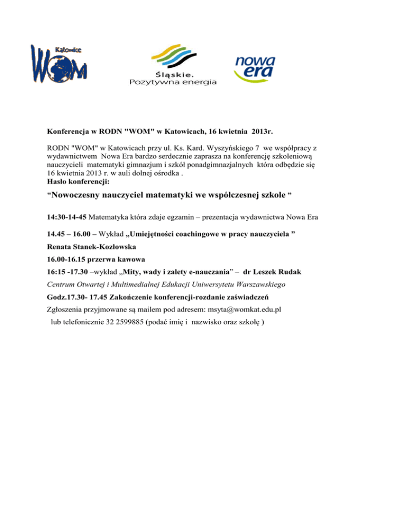 Konferencja w RODN "WOM" w Katowicach, 16 kwietnia 2013r. RODN "WOM" w Katowicach przy ul. Ks. Kard. Wyszyńskiego 7 we współpracy z wydawnictwem Nowa Era bardzo serdecznie zaprasza na konferencję szkoleniową nauczycieli matematyki gimnazjum i szkół ponadgimnazjalnych która odbędzie się 16 kwietnia 2013 r. w auli dolnej ośrodka . Hasło konferencji: "Nowoczesny nauczyciel matematyki we współczesnej szkole ” 14:30-14-45 Matematyka która zdaje egzamin – prezentacja wydawnictwa Nowa Era 14.45 – 16.00 – Wykład „Umiejętności coachingowe w pracy nauczyciela ” Renata Stanek-Kozłowska 16.00-16.15 przerwa kawowa 16:15 -17.30 –wykład „Mity, wady i zalety e-nauczania” – dr Leszek Rudak Centrum Otwartej i Multimedialnej Edukacji Uniwersytetu Warszawskiego Godz.17.30- 17.45 Zakończenie konferencji-rozdanie zaświadczeń Zgłoszenia przyjmowane są mailem pod adresem: [email protected] lub telefonicznie 32 2599885 (podać imię i nazwisko oraz szkołę )