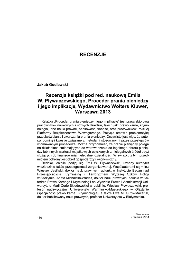 J. Godlewski RECENZJE Jakub Godlewski Recenzja ksiąŜki pod red. naukową Emila W. Pływaczewskiego, Proceder prania pieniędzy i jego implikacje, Wydawnictwo Wolters Kluwer, Warszawa 2013 KsiąŜka „Proceder prania pieniędzy i jego implikacje” jest pracą zbiorową pracowników naukowych z róŜnych dziedzin, takich jak: prawo karne, kryminologia, inne nauki prawne, bankowość, finanse, oraz pracowników Polskiej Platformy Bezpieczeństwa Wewnętrznego. Pozycja omawia problematykę przeciwdziałania i zwalczania prania pieniędzy. Oczywiste jest więc, Ŝe autorzy pominęli kwestie związane z metodami stosowanymi przez przestępców w omawianym procederze. MoŜna przypomnieć, Ŝe pranie pieniędzy polega na działaniach zmierzających do wprowadzenia do legalnego obrotu pieniędzy lub innych wartości majątkowych uzyskanych z nielegalnych źródeł bądź słuŜących do finansowania nielegalnej działalności. W związku z tym przedmiotem ochrony jest obrót gospodarczy i ekonomiczny. Redakcji całości podjął się Emil W. Pływaczewski, uznany autorytet w dziedzinie takŜe przestępczości zorganizowanej. Współautorami są m.in.: Wiesław Jasiński, doktor nauk prawnych, adiunkt w Instytucie Badań nad Przestępczością Kryminalną i Terroryzmem WyŜszej Szkoły Policji w Szczytnie, Aneta Michalska-Warias, doktor nauk prawnych, adiunkt w Katedrze Prawa Karnego i Kryminologii na Wydziale Prawa i Administracji Uniwersytetu Marii Curie-Skłodowskiej w Lublinie, Wiesław Pływaczewski, profesor nadzwyczajny Uniwersytetu Warmińsko-Mazurskiego w Olsztynie (specjalność prawo karne i kryminologia), a takŜe Ewa M. Guzik-Makaruk, doktor habilitowany nauk prawnych, profesor Uniwersytetu w Białymstoku. 166 Prokuratura i Prawo 9, 2014 Recenzja ksiąŜki pod red. naukową Emila W. Pływaczewskiego… Istotnym walorem ksiąŜki jest omówienie orzecznictwa, interesujący sposób prezentacji tematyki, merytoryczne ujęcie i bogaty wykaz literatury przedmiotu. KaŜdy rozdział przynosi kompleksowe ujęcie omawianego zagadnienia i ciekawy komentarz odautorski. Cenne jest teŜ dąŜenie do sprecyzowania uŜywanych pojęć, jak na przykład „art banking” w rozdziale „Pranie pieniędzy oraz inne nielegalne transakcje finansowe z perspektywy międzynarodowego rynku dzieł sztuki”. Autorzy rozdziałów nie pomijają teŜ przepisów intertemporalnych, waŜnych w tej dziedzinie, przy czym konkretne przepisy są bezpośrednio cytowane co ułatwia lekturę. Na początku ksiąŜki, dla ukazania kierunków rozwoju ustawodawstwa w zakresie przeciwdziałania i zwalczania prania pieniędzy, niezwykle pomocne jest chronologiczne ich usystematyzowanie oraz omówienie poszczególnych aktów prawnych i inicjatyw organizacji ponadnarodowych. Jednocześnie jednak wydaje się, Ŝe podział treści na rozdziały „Geneza strategii przeciwdziałania i kontroli procederu prania pieniędzy” i „Pranie pieniędzy w prawie międzynarodowym i prawie Unii Europejskiej” nie jest dobrym posunięciem. Czytając kolejno wskazane rozdziały, ze względu na ich podobieństwo i powiązanie, czytelnik moŜe odnieść wraŜenie, Ŝe treść w nich zaprezentowana powtarza się. Dla pełnego zrozumienia działania systemu przeciwdziałania i zwalczania prania brudnych pieniędzy pomocne jest natomiast przedstawienie i przeanalizowanie aktualnych aktów prawnych (art. 299 k.k. oraz ustawa o przeciwdziałaniu praniu pieniędzy i finansowaniu terroryzmu) regulujących ten proceder w Polsce. Autorka rozdziału pt. „Charakterystyka przestępstwa prania brudnych pieniędzy na tle kodeksu karnego z 1997 r.”, Emilia Jurgielewicz, w przejrzysty sposób omawia analizowane przestępstwo, wskazując jego istotne elementy, takie jak: przedmiot ochrony, podmiot, stronę przedmiotową, podmiotową oraz sankcje, przy jednoczesnym rozróŜnieniu podmiotu przestępstwa w art. 299 ust. 1 i 2 oraz strony przedmiotowej w ust. 1, 2, 5, 6. W podobny sposób autorka omówiła poszczególne elementy wspomnianej ustawy. W innym z rozdziałów Ewa M. Guzik-Makaruk omawia, ale i zwraca uwagę na ubogość orzecznictwa polskich sądów w odniesieniu do przestępstwa prania pieniędzy. Wskazuje takŜe na trudności interpretacyjne, z jakimi zmagały się sądy w takich kwestiach, jak przypisanie odpowiedzialności za przestępstwo prania brudnych pieniędzy określone w art. 299 § 1 k.k. osobie, która współdziałała w popełnieniu przestępstwa źródłowego, oraz wykładnia pojęcia „korzyści związanych z popełnieniem czynu zabronionego”. Omówienie istniejących wyroków oraz przedstawienie poglądów doktryny w tym aspekcie pełni kluczową rolę dla zrozumienia znamion czynu zabronionego penalizowanego w art. 299 k.k., czyli przestępstwa prania brudnych pieniędzy, w tym jego typu podstawowego w § 1, pomocnictwa w § 2 oraz typów kwalifikowanych określonych w § 5 i 6. Autor, pomimo niezbyt boga- Prokuratura i Prawo 9, 2014 167 J. Godlewski tego orzecznictwa, w oparciu o przytoczone tezy komentatorskie, kompleksowo realizuje omawiany temat. Niewątpliwym walorem ksiąŜki jest przedstawienie nie tylko teoretycznej wiedzy, ale i działalności organów państwowych zajmujących się przeciwdziałaniem i zwalczaniem prania pieniędzy. Szczególnie ciekawy jest rozdział autorstwa Wiesława Jasińskiego, dotyczący m.in. wybranych aspektów prawnych i kryminalistycznych w zakresie czynności operacyjno-rozpoznawczych oraz postępowania dowodowego w sprawach o pranie pieniędzy. Autor analizuje tutaj takie czynności, jak: kontrola operacyjna, dostawy kontrolowane i operacje pod przykryciem, natomiast w ramach postępowania dowodowego poruszone są kwestie związane m.in. z przesłuchaniem, rolą biegłego, przeszukaniem i zatrzymaniem sprawcy przestępstwa oraz zabezpieczeniem majątkowym w sprawach o pranie pieniędzy. Wiesław Jasiński przybliŜa m.in. działalność takich organów, jak: ABW, CBŚ i śandarmeria 