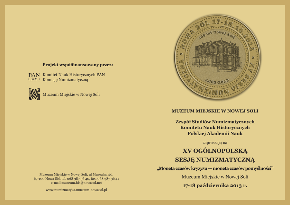 Projekt współfinansowany przez: Komitet Nauk Historycznych PAN Komisję Numizmatyczną Muzeum Miejskie w Nowej Soli MUZEUM MIEJSKIE W NOWEJ SOLI Zespół Studiów Numizmatycznych Komitetu Nauk Historycznych Polskiej Akademii Nauk zapraszają na XV OGÓLNOPOLSKĄ SESJĘ NUMIZMATYCZNĄ „Moneta czasów kryzysu — moneta czasów pomyślności” Muzeum Miejskie w Nowej Soli, ul Muzealna 20, 67-100 Nowa Sól, tel. 068 387 36 40, fax. 068 387 36 41 e-mail:[email protected] www.numizmatyka.muzeum-nowasol.pl Muzeum Miejskie w Nowej Soli 17-18 października 2013 r. Program konferencji Dzień I Początek: 17 października, godz. 9:00 1. dr hab. Agata Kluczek – (Nie)moc obrazów? Moneta jako świadek czasów pomyślności i czasów kryzysu Cesarstwa Rzymskiego. 1. Adam Degler – Uwagi na temat monet epoki Sewerów (193-235) w zbiorach muzealnych na przykładzie Ossolineum. 10:30-10:45 - przerwa na kawę 2. dr Eliza Walczak – „Wiek złota” i „wiek spiżu” w mennictwie północnych wybrzeży Morza Czarnego. 3. prof. Barbara Lichocka – Inflacja, konieczność, przestępstwo; trzy punkty widzenia na zjawisko kopiowania monet diecezji Egiptu w prefekturze Orientu w schyłkowym okresie cesarstwa rzymskiego. 12:15-12:30 - przerwa na kawę 4. Dariusz Adamczyk – Koniunkturalne cykle czy strukturalne załamania? Przyczyny i skutki fluktuacji w imporcie srebra do Europy Środkowej i Wschodniej w IX-XI wieku. 5. Piotr Chabrzyk, Halina Młodecka – Echa niemieckich kryzysów w Polsce. Zmiany siły nabywczej srebra w 2. połowie XI wieku na podstawie wybranych depozytów. 14:00-15:30 - przerwa obiadowa 6. Witold Nakielski – Polskie emisje denarów krzyżowych — reakcją na kryzys polityczno-gospodarczy w Cesarstwie w 2. połowie XI wieku. Następne typy polskich krzyżówek w świetle depozytu ze Środy Wielkopolskiej. 7. Piotr Łozowski – Monety bogaczy, czyli obce waluty w Starej Warszawie pierwszej połowy XV stulecia. 8. dr Piotr Guzowski – Wpływ kryzysów monetarnych na praktykę życia gospodarczego zwykłych ludzi w późnośredniowiecznej Polsce. 17:30-17:45 - przerwa na kawę 9. Bogdan Miłosz — Grossfenig czy szeląg kołobrzeski? 10. Zbigniew Bartkowiak – Formy w kryzysie — kryzys formy. 19:00 - koniec pierwszego dnia obrad Dzień II Początek 2. dnia obrad: godz. 9:00 11. prof. Petr Vorel - Drobná mince v česko-rakousko-slezském teritoriu jako objekt mincovní podnikatelské činnosti hrabat z Hardeka v Kladsku na počátku 16. století. 12. Robert Pieńkowski – Inflacja czasów Kipper i Wipper a mennictwo książąt legnicko-brzesko-wołowskich w początkach wojny trzydziestoletniej. 10:30-10:45 - przerwa na kawę 13. dr Jarosław Dutkowski - Spektakularny upadek mennicy w Poznaniu za panowania Jana Kazimierza. 14. dr Bartosz Dziewanowski-Stefańczyk — Analiza porównawcza kryzysów monetarnych w Rzeczpospolitej w czasach Zygmunta III i Jana Kazimierza. 15. Iwan Sinczuk - Финансовый эпизод войны шестой коалиции: июльсентябрь 1813 г. 13:00 - zakończenie obrad