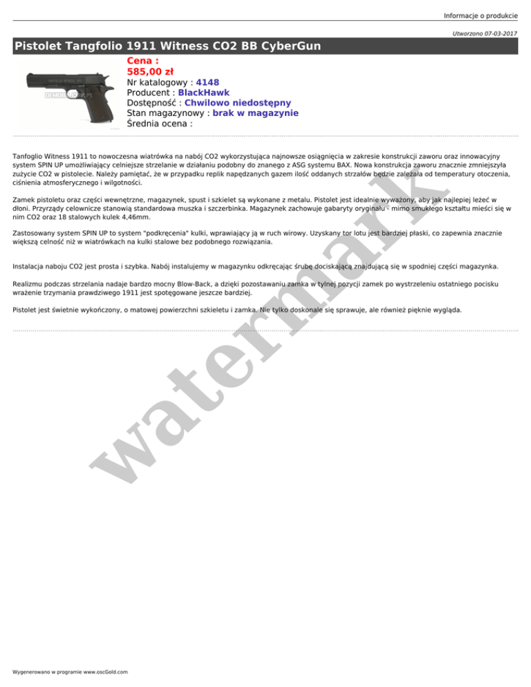 Informacje o produkcie Utworzono 07-03-2017 Pistolet Tangfolio 1911 Witness CO2 BB CyberGun Cena : 585,00 zł Nr katalogowy : 4148 Producent : BlackHawk Dostępność : Chwilowo niedostępny Stan magazynowy : brak w magazynie Średnia ocena : er m ar k Tanfoglio Witness 1911 to nowoczesna wiatrówka na nabój CO2 wykorzystująca najnowsze osiągnięcia w zakresie konstrukcji zaworu oraz innowacyjny system SPIN UP umożliwiający celniejsze strzelanie w działaniu podobny do znanego z ASG systemu BAX. Nowa konstrukcja zaworu znacznie zmniejszyła zużycie CO2 w pistolecie. Należy pamiętać, że w przypadku replik napędzanych gazem ilość oddanych strzałów będzie zależała od temperatury otoczenia, ciśnienia atmosferycznego i wilgotności. Zamek pistoletu oraz części wewnętrzne, magazynek, spust i szkielet są wykonane z metalu. Pistolet jest idealnie wyważony, aby jak najlepiej leżeć w dłoni. Przyrządy celownicze stanowią standardowa muszka i szczerbinka. Magazynek zachowuje gabaryty oryginału - mimo smukłego kształtu mieści się w nim CO2 oraz 18 stalowych kulek 4,46mm. Zastosowany system SPIN UP to system "podkręcenia" kulki, wprawiający ją w ruch wirowy. Uzyskany tor lotu jest bardziej płaski, co zapewnia znacznie większą celność niż w wiatrówkach na kulki stalowe bez podobnego rozwiązania. Instalacja naboju CO2 jest prosta i szybka. Nabój instalujemy w magazynku odkręcając śrubę dociskającą znajdującą się w spodniej części magazynka. Realizmu podczas strzelania nadaje bardzo mocny Blow-Back, a dzięki pozostawaniu zamka w tylnej pozycji zamek po wystrzeleniu ostatniego pocisku wrażenie trzymania prawdziwego 1911 jest spotęgowane jeszcze bardziej. w at Pistolet jest świetnie wykończony, o matowej powierzchni szkieletu i zamka. Nie tylko doskonale się sprawuje, ale również pięknie wygląda. Wygenerowano w programie www.oscGold.com