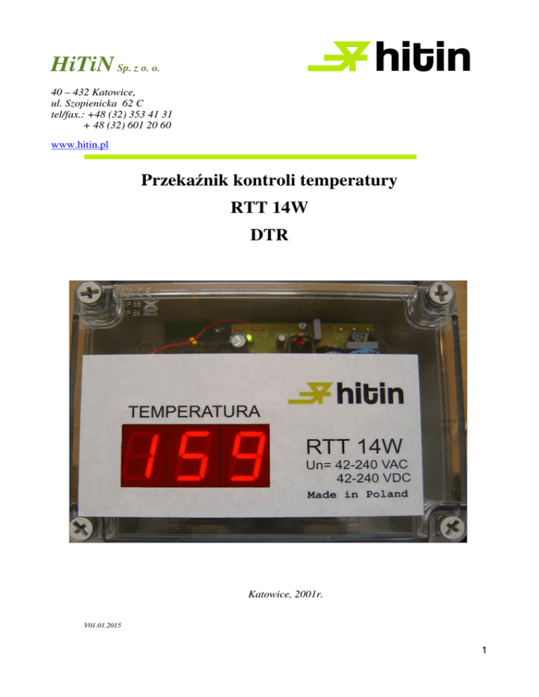 HiTiN Sp. z o. o. 40 – 432 Katowice, ul. Szopienicka 62 C tel/fax.: +48 (32) 353 41 31 + 48 (32) 601 20 60 www.hitin.pl Przekaźnik kontroli temperatury RTT 14W DTR Katowice, 2001r. V01.01.2015 1 2 1. Wstęp. Przekażnik elektroniczny RTT-14W jest przeznaczony do wykrywania przekroczenia temperatury przez transformatory wyposażone w czujniki typu PTC lub NTC. 2. Zastosowanie. Układ RTT-14W przeznaczony jest do nadzorowania temperatury transformatorów suchych i żywicznych oraz silników wyposażonych w czujniki typu PTC lub NTC. Układ kontroluje maksymalnie trzy progi temperatur. Wyjściem układu dla każdego z czujników temperatury jest przekaźnik ze stykiem przełącznym. Czwarty przekaźnik pracuje jako układ czasowy załączający się ze zwłoką 5 sekund od podania napięcia zasilania na układ. 3. Dane techniczne: Napięcie znamionowe zasilania: Maksymalna moc pobierana: Ilość wejść: Oporność nominalna przełączenia: Zwłoka na załączenie toru C (t1): Zwłoka na wyłączenie toru C (t2): Ilość wyjść: Maksymalne napięcie przełączane styków: Maksymalna zdolność łączeniowa AC: Obciążalność znamionowa styków: Temp.otoczenia (praca): Temp.otoczenia (przechowywanie): Ochrona: Wytrzymałość elektryczna izolacji Stopień ochrony: Dodatkowe wyjście zasilania wskaźnika: Gabaryty: szerokość: długość: wysokość: Waga: Dławiki kablowe: 42-240 VAC lub 42-240 VDC bez przełączeń 6 VA 3 (do każdego można dołączyć max. 3 czujniki PTC lub NTC połączone szeregowo, o łącznej rezystancji nominalnej < 1kΩ) i układ czasowy 1kΩ 5 sek min 0,2 sek 4 przełączne 400 VAC 2000 VA 250 VAC/8 A -25 do 55 °C -25 do 80 °C samoczynne wyłączenie zasilania > 2,5 kV, 50 Hz , 1 min IP 56 12 VDC / 200 mA 190 mm 140 + 22 mm dławiki kablowe 75 mm + 22 mm dławiki kablowe ok. 0,5 kg 3 x PG16 4. Instalowanie. Układ należy zamocować mechanicznie do podstawy czterema wkrętami M4 lub M5 przez otwory w dolnej części obudowy (wymiary na rysunku gabarytowym nr 1). W zależności od typu zastosowanych czujników ustawić odpowiednio zwory na płytce drukowanej zgodnie z opisem podanym niżej. Podłączyć ochronę, zasilanie i czujniki. Styki przełączne połączyć według potrzeb. Układ nie wymaga regulacji. Położenie pracy dowolne. Zaciski przyłączeniowe o średnicy max 2,5mm2, zalecane przyłączenie linką 1 lub 1,5 mm2. Układ nie wymaga konserwacji. Producent udziela na wyrób 2 letniej gwarancji od daty sprzedaży na ogólnie obowiązujących zasadach pod warunkiem eksploatacji zgodnej z przeznaczeniem oraz obowiązującymi przepisami. Dla ułatwienia montażu schemat blokowy RTT-14W i jego wyprowadzenia przedstawione są na rysunku wewnątrz obudowy. 3 5. Budowa. Do wejść pomiarowych urządzenia można przyłączyć maksymalnie trzy czujniki o rezystancji 1kom dla temperatury nominalnej. Każdy z czujników jest sprawdzany w układzie mostkowym przez własny komparator z histerezą. Komparator uruchamia bądź wyłącza odpowiedni element wykonawczy. Elementami wykonawczymi są przekaźniki RM96P. Tor D załącza się po czasie 5 sekund od podania zasilania na układ . Zastosowany w urządzeniu zasilacz impulsowy pozwala na poprawną pracę przy zasilaniu napięciem z zakresu 42-240 VDC/AC. bez jakichkolwiek przełączeń. Rozwiązanie zastosowane w układzie jest zastrzeżone. Schemat podłączeń zewnętrznych przedstawiono na rysunku wewnątrz obudowy i poniżej. 6. Programowanie. Do ustawiania rodzaju pracy układu RTT-14W służą dwie zworki umieszczone na przełącznikch Z1 i Z2. Przełaczniki Z1 i Z2 umożliwiają konfigurowanie rodzaju pracy czujników. Możliwe są następujące kombinacje. Dla czujników typu PTC: Zwarcie zworą pierwszą złącza Z1 a drugą złącza Z2 - w pozycji tej przekaźniki są załączone gdy temperatura jest prawidłowa. Przekaźniki wyłączają się po przekroczeniu temperatury progowej. Kombinacja ta powoduje, że po zaniku napięcia zasilającego przekaźniki przechodzą w stan taki jak po przekroczeniu temperatury, co chroni transformator w wypadku awarii zasilania układu. Zwarcie zworami odpowiednio zacisku Z1:1 z Z2:1 i Z1:2 z Z2:2 - w pozycji tej przekaźniki są wyłączone gdy temperatura nie przekracza progów. Przekaźniki załączają się gdy temperatura przekroczy progi czujników. W pozycji tej układ przy braku napięcia zasilającego nie kontroluje temperatury. Dla czujników typu NTC: Zwarcie zworami odpowiednio zacisku Z1:1 z Z2:1 i Z1:2 z Z2:2 - w pozycji tej przekaźniki są załączone gdy temperatura jest prawidłowa. Przekaźniki wyłączają się po przekroczeniu temperatury progowej. Kombinacja ta powoduje, że po zaniku napięcia zasilającego przekaźniki przechodzą w stan taki jak po przekroczeniu temperatury, co chroni transformator w wypadku awarii zasilania układu. Zwarcie zworą pierwszą złącza Z1 a drugą złącza Z2 - w pozycji tej przekaźniki są wyłączone gdy temperatura nie przekracza progów. Przekaźniki załączają się gdy temperatura przekroczy progi czujników. W pozycji tej układ przy braku napięcia zasilającego nie kontroluje temperatury. 4 Rys. 1 - Szkic wymiarowy układu RTT-14W wraz z rozstawem otworów mocujących. A, B i C przekaźniki wykonawcze torów kontroli temperatury, D- przekaźnik wyjściowy układu czasowego 5 7. Stany awaryjne: przekaźniki nie załączają się mimo prawidłowego stanu czujników: − sprawdzić zasilanie układu - powinna się świecić lampka na zasilaczu wewnątrz układu, − sprawdzić czy są prawidłowo założone zworki na układzie kodującym, jeżeli objaw nie ustępuje należy skonsultować się z producentem.Objawy takie mogą wystąpić jeżeli układ został zniszczony lub zablokowany został zasilacz. Przyczyną może być wystąpienie wysokich potencjałów pomiędzy czujnikami lub pojawienie się w napięciu zasilającym serii impulsów napięciowych o energii umożliwiającej przepalenie wewnę