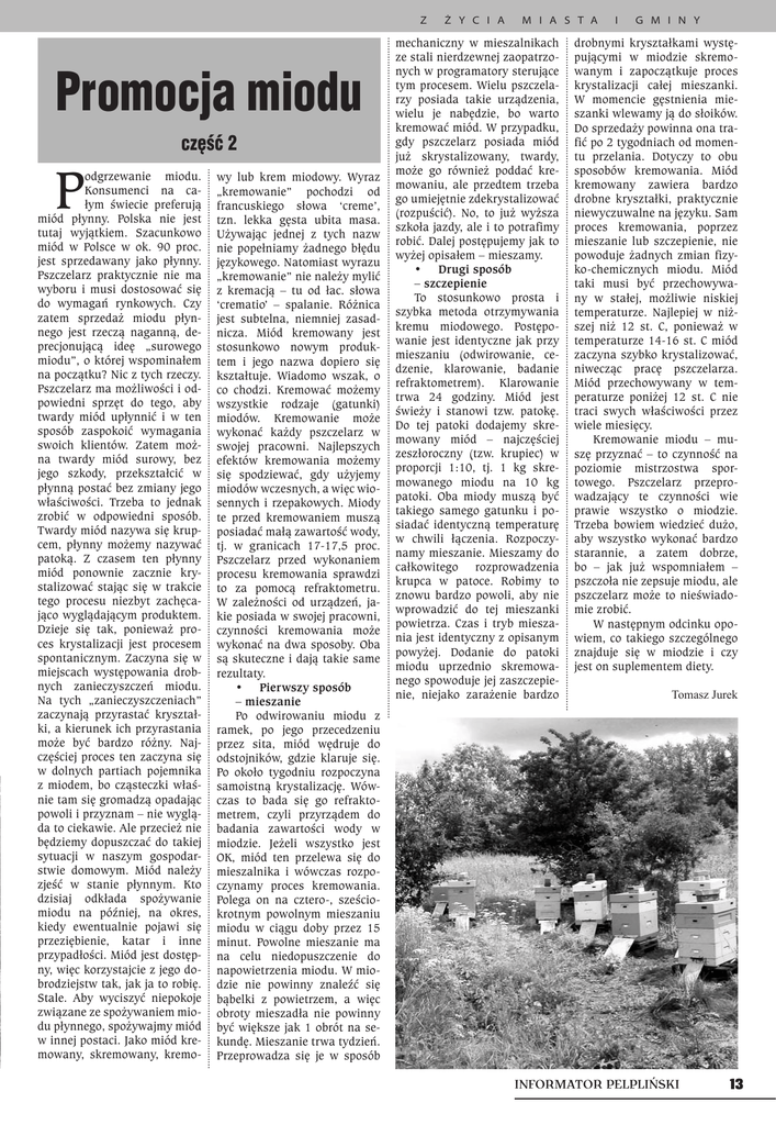 Z Promocja miodu część 2 P odgrzewanie miodu. Konsumenci na całym świecie preferują miód płynny. Polska nie jest tutaj wyjątkiem. Szacunkowo miód w Polsce w ok. 90 proc. jest sprzedawany jako płynny. Pszczelarz praktycznie nie ma wyboru i musi dostosować się do wymagań rynkowych. Czy zatem sprzedaż miodu płynnego jest rzeczą naganną, deprecjonującą ideę „surowego miodu”, o której wspominałem na początku? Nic z tych rzeczy. Pszczelarz ma możliwości i odpowiedni sprzęt do tego, aby twardy miód upłynnić i w ten sposób zaspokoić wymagania swoich klientów. Zatem można twardy miód surowy, bez jego szkody, przekształcić w płynną postać bez zmiany jego właściwości. Trzeba to jednak zrobić w odpowiedni sposób. Twardy miód nazywa się krupcem, płynny możemy nazywać patoką. Z czasem ten płynny miód ponownie zacznie krystalizować stając się w trakcie tego procesu niezbyt zachęcająco wyglądającym produktem. Dzieje się tak, ponieważ proces krystalizacji jest procesem spontanicznym. Zaczyna się w miejscach występowania drobnych zanieczyszczeń miodu. Na tych „zanieczyszczeniach” zaczynają przyrastać kryształki, a kierunek ich przyrastania może być bardzo różny. Najczęściej proces ten zaczyna się w dolnych partiach pojemnika z miodem, bo cząsteczki właśnie tam się gromadzą opadając powoli i przyznam – nie wygląda to ciekawie. Ale przecież nie będziemy dopuszczać do takiej sytuacji w naszym gospodarstwie domowym. Miód należy zjeść w stanie płynnym. Kto dzisiaj odkłada spożywanie miodu na później, na okres, kiedy ewentualnie pojawi się przeziębienie, katar i inne przypadłości. Miód jest dostępny, więc korzystajcie z jego dobrodziejstw tak, jak ja to robię. Stale. Aby wyciszyć niepokoje związane ze spożywaniem miodu płynnego, spożywajmy miód w innej postaci. Jako miód kremowany, skremowany, kremo- wy lub krem miodowy. Wyraz „kremowanie” pochodzi od francuskiego słowa ‘creme’, tzn. lekka gęsta ubita masa. Używając jednej z tych nazw nie popełniamy żadnego błędu językowego. Natomiast wyrazu „kremowanie” nie należy mylić z kremacją – tu od łac. słowa ‘crematio’ – spalanie. Różnica jest subtelna, niemniej zasadnicza. Miód kremowany jest stosunkowo nowym produktem i jego nazwa dopiero się kształtuje. Wiadomo wszak, o co chodzi. Kremować możemy wszystkie rodzaje (gatunki) miodów. Kremowanie może wykonać każdy pszczelarz w swojej pracowni. Najlepszych efektów kremowania możemy się spodziewać, gdy użyjemy miodów wczesnych, a więc wiosennych i rzepakowych. Miody te przed kremowaniem muszą posiadać małą zawartość wody, tj. w granicach 17-17,5 proc. Pszczelarz przed wykonaniem procesu kremowania sprawdzi to za pomocą refraktometru. W zależności od urządzeń, jakie posiada w swojej pracowni, czynności kremowania może wykonać na dwa sposoby. Oba są skuteczne i dają takie same rezultaty. • Pierwszy sposób – mieszanie Po odwirowaniu miodu z ramek, po jego przecedzeniu przez sita, miód wędruje do odstojników, gdzie klaruje się. Po około tygodniu rozpoczyna samoistną krystalizację. Wówczas to bada się go refraktometrem, czyli przyrządem do badania zawartości wody w miodzie. Jeżeli wszystko jest OK, miód ten przelewa się do mieszalnika i wówczas rozpoczynamy proces kremowania. Polega on na cztero-, sześciokrotnym powolnym mieszaniu miodu w ciągu doby przez 15 minut. Powolne mieszanie ma na celu niedopuszczenie do napowietrzenia miodu. W miodzie nie powinny znaleźć się bąbelki z powietrzem, a więc obroty mieszadła nie powinny być większe jak 1 obrót na sekundę. Mieszanie trwa tydzień. Przeprowadza się je w sposób Ż Y C I A M I A S T A mechaniczny w mieszalnikach ze stali nierdzewnej zaopatrzonych w programatory sterujące tym procesem. Wielu pszczelarzy posiada takie urządzenia, wielu je nabędzie, bo warto kremować miód. W przypadku, gdy pszczelarz posiada miód już skrystalizowany, twardy, może go również poddać kremowaniu, ale przedtem trzeba go umiejętnie zdekrystalizować (rozpuścić). No, to już wyższa szkoła jazdy, ale i to potrafimy robić. Dalej postępujemy jak to wyżej opisałem – mieszamy. • Drugi sposób – szczepienie To stosunkowo prosta i szybka metoda otrzymywania kremu miodowego. Postępowanie jest identyczne jak przy mieszaniu (odwirowanie, cedzenie, klarowanie, badanie refraktometrem). Klarowanie trwa 24 godziny. Miód jest świeży i stanowi tzw. patokę. Do tej patoki dodajemy skremowany miód – najczęściej zeszłoroczny (tzw. krupiec) w proporcji 1:10, tj. 1 kg skremowanego miodu na 10 kg patoki. Oba miody muszą być takiego samego gatunku i posiadać identyczną temperaturę w chwili łączenia. Rozpoczynamy mieszanie. Mieszamy do całkowitego rozprowadzenia krupca w patoce. Robimy to znowu bardzo powoli, aby nie wprowadzić do tej mieszanki powietrza. Czas i tryb mieszania jest identyczny z opisanym powyżej. Dodanie do patoki miodu uprzednio skremowanego spowoduje jej zaszczepienie, niejako zarażenie bardzo I G M I N Y drobnymi kryształkami występującymi w miodzie skremowanym i zapoczątkuje proces krystalizacji całej mieszanki. W momencie gęstnienia mieszanki wlewamy ją do słoików. Do sprzedaży powinna ona trafić po 2 tygodniach od momentu przelania. Dotyczy to obu sposobów kremowania. Miód kremowany zawiera bardzo drobne kryształki, praktycznie niewyczuwalne na języku. Sam proces kremowania, poprzez mieszanie lub szczepienie, nie powoduje żadnych zmian fizyko-chemicznych miodu. Miód taki musi być przechowywany w stałej, możliwie niskiej temperaturze. Najlepiej w niższej niż 12 st. C, ponieważ w temperaturze 14-16 st. C miód zaczyna szybko krystalizować, niwecząc pracę pszczelarza. Miód przechowywany w temperaturze poniżej 12 st. C nie traci swych właściwości przez wiele miesięcy. Kremowanie miodu – muszę przyznać – to c