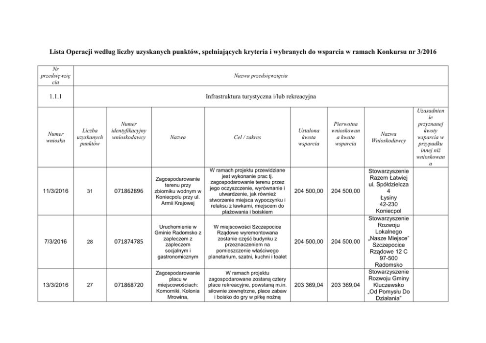 Lista Operacji według liczby uzyskanych punktów, spełniających kryteria i wybranych do wsparcia w ramach Konkursu nr 3/2016 Nr przedsięwzię cia Nazwa przedsięwzięcia 1.1.1 Infrastruktura turystyczna i/lub rekreacyjna Numer wniosku 11/3/2016 7/3/2016 13/3/2016 Liczba uzyskanych punktów 31 28 27 Numer identyfikacyjny wnioskodawcy Ustalona kwota wsparcia Pierwotna wnioskowan a kwota wsparcia Nazwa Cel / zakres 071862896 Zagospodarowanie terenu przy zbiorniku wodnym w Koniecpolu przy ul. Armii Krajowej W ramach projektu przewidziane jest wykonanie prac tj. zagospodarowanie terenu przez jego oczyszczenie, wyrównanie i utwardzenie, jak również stworzenie miejsca wypoczynku i relaksu z ławkami, miejscem do plażowania i boiskiem 204 500,00 204 500,00 071874785 Uruchomienie w Gminie Radomsko z zapleczem z zapleczem socjalnym i gastronomicznym W miejscowości Szczepocice Rządowe wyremontowana zostanie część budynku z przeznaczeniem na pomieszczenie właściwego planetarium, szatni, kuchni i toalet 204 500,00 204 500,00 071868720 Zagospodarowanie placu w miejscowościach: Komorniki, Kolonia Mrowina, W ramach projektu zagospodarowane zostaną cztery place rekreacyjne, powstaną m.in. siłownie zewnętrzne, place zabaw i boisko do gry w piłkę nożną 203 369,04 203 369,04 Nazwa Wnioskodawcy Stowarzyszenie Razem Łatwiej ul. Spółdzielcza 4 Łysiny 42-230 Koniecpol Stowarzyszenie Rozwoju Lokalnego „Nasze Miejsce” Szczepocice Rządowe 12 C 97-500 Radomsko Stowarzyszenie Rozwoju Gminy Kluczewsko „Od Pomysłu Do Działania” Uzasadnien ie przyznanej kwoty wsparcia w przypadku innej niż wnioskowan a Jakubowice, Łapczyna Wola na cele turystycznorekreacyjne 8/3/2016 12/3/2016 2/3/2016 4/3/2016 9/3/2016 25 25 24 24 24 071878423 071876103 071829476 071759616 071821435 Modernizacja obiektów infrastruktury rekreacyjnej tj. budynków świetlic wiejskich w miejscowościach: Bieganów, Chycza i Kossów Budowa placu zabaw w miejscowości Czaryż oraz remont świetlicy wiejskiej w miejscowości Kluczyce Świetlica w miejscowości Borowa jako centrum kultury lokalne ul. Spółdzielcza 12 29-120 Kluczewsko nasadzona zostanie również zieleń Operacja będzie polegać na modernizacji budynków świetlic wiejskich w zakresie wymiany pokrycia dachowego z eternitu na blachę Przedmiotem operacji jest remont budynku świetlicy wiejskiej wraz z niezbędną infrastrukturą techniczną w miejscowości Kluczyce oraz budowa placu zabaw w miejscowości Czaryż Wybudowanie świetlicy wiejskiej we wsi Borowa zakres inwestycji obejmuje wykonanie robót budowlanych związanych z budową świetlicy 204 550,00 204 000,00 204 250,00 204 550,00 Stowarzyszenie „JESTEŚMY RAZEM” w Radkowie Radków 99 29-135 Radków 204 000,00 Stowarzyszenie Inicjatyw SPINACZ ul. Struga 2 29-145 Secemin 204 250,00 Budowa świetlicy wiejskiej w Nieznanowicach Operacja polega na budowie świetlicy wiejskiej w miejscowości Nieznanowice 204 545,00 204 545,00 Budowa centrum rekreacyjnoturystycznego na terenie Gminy Moskorzew Operacja polega na budowie nowego obiektu centrum rekreacyjno-turystycznego zaplanowano budowę punktów rekreacyjno-turystycznych, placów zabaw i siłowni zewnętrznych w 4 lokalizacjach na terenie Moskorzewa i Chlewic 204 550,00 204 550,00 Stowarzyszenie Rozwoju Wsi Borowa Borowa 3 97-540 Gidle Stowarzyszenie Nieznanowice.pl Nieznanowice 45A 29-100 Włoszczowa Stowarzyszenie Wędkarskie „KARPIK” w Moskorzewie Moskorzew 96 29-130 Moskorzew 10/3/2016 1/3/2016 3/3/2016 24 24 22 wniosek Budowa boiska sportowego Przedmiotem operacji jest budowa wielofunkcyjnego boiska sportowego wraz z niezbędnym wyposarzeniem na działce w Radziechowicach Drugich 067674970 Budowa świetlicy w miejscowości Silniczka Celem jest budowa świetlicy wiejskiej zakres inwestycji obejmuje wykonanie robót budowlanych związanych z budową świetlicy 071838565 Budowa placów zabaw w miejscowościach: Huta Drewniana, Karsy, Wola Rożkowa, Nowy Widok, Biestrzyków Wielki Gmina Kobiele Wielkie Przedmiotem operacji jest budowa placów zabaw dla dzieci z urządzeniami do ćwiczeń tzn. siłowni zewnętrznych 204 550,00 204 550,00 206 200,00 206 200,00 204 967,09 204 967,09 Stowarzyszenie na Rzecz Rozwoju i Gminy Ładzice ul. Wyzwolenia 36 97-651 Ładzice Stowarzyszenie na Rzecz Rozwoju Gminy Żytno Maluszyn ul. Wolności 5 97-532 Żytno Stowarzyszenie na Rzecz Rozwoju Gminy Kobiele Wielkie „W Kolebce Reymonta” ul. Reymonta 75 97-524 Kobiele Wielkie