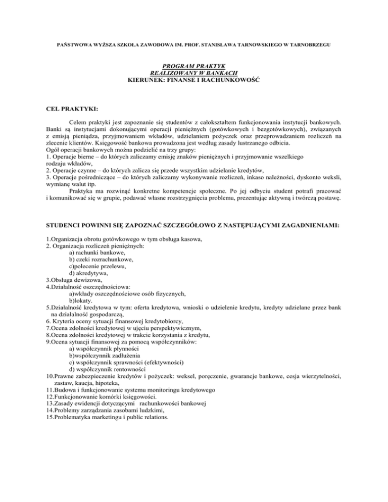 PAŃSTWOWA WYŻSZA SZKOŁA ZAWODOWA IM. PROF. STANISŁAWA TARNOWSKIEGO W TARNOBRZEGU PROGRAM PRAKTYK REALIZOWANY W BANKACH KIERUNEK: FINANSE I RACHUNKOWOŚĆ CEL PRAKTYKI: Celem praktyki jest zapoznanie się studentów z całokształtem funkcjonowania instytucji bankowych. Banki są instytucjami dokonującymi operacji pieniężnych (gotówkowych i bezgotówkowych), związanych z emisją pieniądza, przyjmowaniem wkładów, udzielaniem pożyczek oraz przeprowadzaniem rozliczeń na zlecenie klientów. Księgowość bankowa prowadzona jest według zasady lustrzanego odbicia. Ogół operacji bankowych można podzielić na trzy grupy: 1. Operacje bierne – do których zaliczamy emisję znaków pieniężnych i przyjmowanie wszelkiego rodzaju wkładów, 2. Operacje czynne – do których zalicza się przede wszystkim udzielanie kredytów, 3. Operacje pośredniczące – do których zaliczamy wykonywanie rozliczeń, inkaso należności, dyskonto weksli, wymianę walut itp. Praktyka ma rozwinąć konkretne kompetencje społeczne. Po jej odbyciu student potrafi pracować i komunikować się w grupie, podawać własne rozstrzygnięcia problemu, prezentując aktywną i twórczą postawę. STUDENCI POWINNI SIĘ ZAPOZNAĆ SZCZEGÓŁOWO Z NASTĘPUJĄCYMI ZAGADNIENIAMI: 1.Organizacja obrotu gotówkowego w tym obsługa kasowa, 2. Organizacja rozliczeń pieniężnych: a) rachunki bankowe, b) czeki rozrachunkowe, c)polecenie przelewu, d) akredytywa, 3.Obsługa dewizowa, 4.Działalność oszczędnościowa: a)wkłady oszczędnościowe osób fizycznych, b)lokaty. 5.Działalność kredytowa w tym: oferta kredytowa, wnioski o udzielenie kredytu, kredyty udzielane przez bank na działalność gospodarczą, 6. Kryteria oceny sytuacji finansowej kredytobiorcy, 7.Ocena zdolności kredytowej w ujęciu perspektywicznym, 8.Ocena zdolności kredytowej w trakcie korzystania z kredytu, 9.Ocena sytuacji finansowej za pomocą współczynników: a) współczynnik płynności b)współczynnik zadłużenia c) współczynnik sprawności (efektywności) d) współczynnik rentowności 10.Prawne zabezpieczenie kredytów i pożyczek: weksel, poręczenie, gwarancje bankowe, cesja wierzytelności, zastaw, kaucja, hipoteka, 11.Budowa i funkcjonowanie systemu monitoringu kredytowego 12.Funkcjonowanie komórki księgowości. 13.Zasady ewidencji dotyczącymi rachunkowości bankowej 14.Problemy zarządzania zasobami ludzkimi, 15.Problematyka marketingu i public relations.