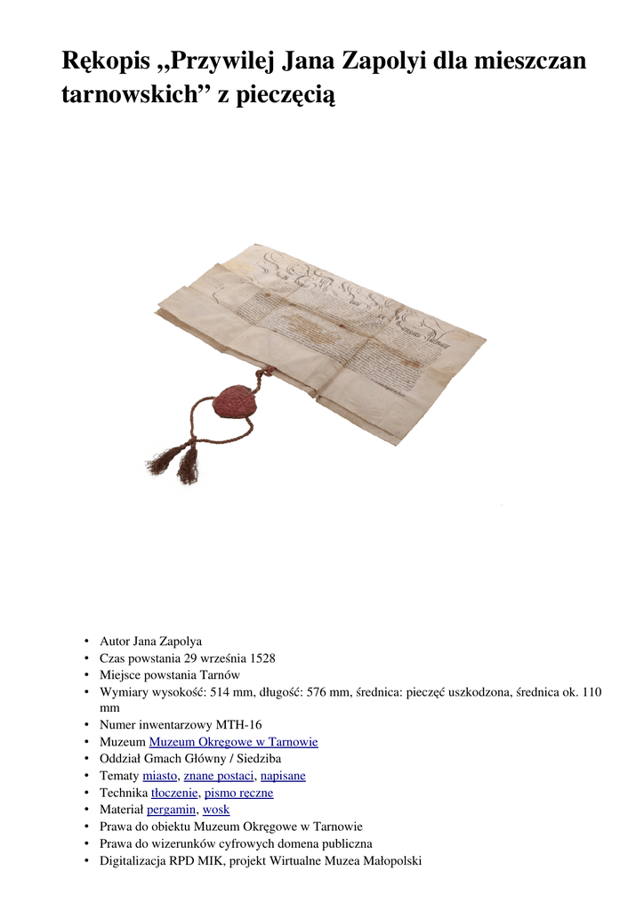 Rękopis „Przywilej Jana Zapolyi dla mieszczan tarnowskich” z pieczęcią • • • • • • • • • • • • • Autor Jana Zapolya Czas powstania 29 września 1528 Miejsce powstania Tarnów Wymiary wysokość: 514 mm, długość: 576 mm, średnica: pieczęć uszkodzona, średnica ok. 110 mm Numer inwentarzowy MTH16 Muzeum Muzeum Okręgowe w Tarnowie Oddział Gmach Główny / Siedziba Tematy miasto, znane postaci, napisane Technika tłoczenie, pismo ręczne Materiał pergamin, wosk Prawa do obiektu Muzeum Okręgowe w Tarnowie Prawa do wizerunków cyfrowych domena publiczna Digitalizacja RPD MIK, projekt Wirtualne Muzea Małopolski • Tagi herb, magnateria, pieczęć, rękopis, 2D 29 września 1528 roku na zamku w Tarnowie Jan król Węgier, Dalmacji, Kroacji, margrabia morawski, łużycki, książę obojga Śląsków w zamian za gościnność udzieloną przez Jana hrabiego na Tarnowie, wojewodę ruskiego nadaje miastu Tarnowowi 500 florenów dochodu rocznego czerpanych z koszyckiej tricesimy, czyli opłat od kupców przybywających do Królestwa Węgierskiego. Dokument o wymiarach 575 x 320,80 milimetrów został sporządzony w języku łacińskim. Na jedwabnym sznurze barwy czerwonej przywiązana jest pieczęć woskowa okrągła, barwy czerwonej, z wyobrażeniem herbu Królestwa Węgierskiego, na tarczy sercowej herb Jana Zapolyi, z niestety zniszczoną legendą. Tarnów, mimo że dzięki potężnemu rodowi Tarnowskich wyraźnie obecny na mapie politycznej XVI wiecznej Polski, nie był z pewnością miejscem, skąd sprawować można i należało królewską władzę na Węgrzech. Skąd zatem Jan Zapolya w Tarnowie? W 1526 roku, po śmierci Ludwika II Jagiellończyka w bitwie pod Mohaczem, Jan Zapolya został wybrany na króla Węgier przez zgromadzenia szlacheckie. Tymczasem sejm węgierski, na mocy układu wiedeńskiego z 1515 roku, powołał na tron Ferdynanda Habsburgskiego — młodszego brata cesarza Karola V. Rozpoczęła się wojna domowa. Jan Zapolya, obawiając się o swoje życie, uszedł do Polski, gdzie początkowo zatrzymał się w zamku Marcina Kamienieckiego w Odrzykoniu pod Krosnem, ostatecznie jednak skorzystał z zaproszenia hetmana Jana Tarnowskiego. Trwający pięć miesięcy, od kwietnia do września 1528 roku, pobyt Jana Zapolyi w Tarnowie wypełniły starania o odzyskanie korony węgierskiej wśród możnych w Polsce i we Francji, a nawet u samego pochodzącego z potężnego rodu Medyceuszy papieża Klemensa VII. Równocześnie Jerzy Martinuzzi, częstochowski przeor, prowadził agitację w jego sprawie na Węgrzech. Ostatecznie, z pomocą Jarosława Łaskiego, wojewody sieradzkiego, rozpoczął rozmowy z sułtanem tureckim Solimanem. Po zawarciu z nim umowy, pod koniec września z zebranym przez siebie wojskiem wyruszył na Węgry. Zwycięski pochód został powstrzymany pod Wiedniem, niemniej ostatecznie, w 1538 roku, Jan Zapolya i Ferdynand podpisali tajny układ w Waradynie, w którym podzielili kraj na dwie części: południowozachodnią, gdzie miał panować król habsburski, oraz północnowschodnią, gdzie władzę zatrzymał Jan Zapolya. Opracowanie: Janusz Kozioł (Muzeum Okręgowe w Tarnowie), © wszystkie prawa zastrzeżone