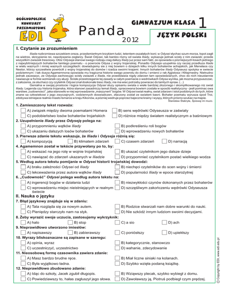 EDI PANDA 2012 - Język polski, kl. 1 Gimnazjum