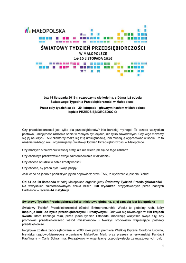 Już 14 listopada 2016 r. rozpoczyna się kolejna, siódma już edycja Światowego Tygodnia Przedsiębiorczości w Małopolsce! Przez cały tydzień aż do - 20 listopada - głównym hasłem w Małopolsce będzie PRZEDSIĘBIORCZOŚĆ ☺ Czy przedsiębiorczość jest tylko dla przedsiębiorców? Nic bardziej mylnego! To przede wszystkim postawa, umiejętność radzenia sobie w różnych sytuacjach, nie tylko zawodowych. Czy więc możemy się jej nauczyć? TAK! Niektórzy rodzą się z tą umiejętnością, inni muszą ją wypracować w sobie. Po to właśnie każdego roku organizujemy Światowy Tydzień Przedsiębiorczości w Małopolsce. Czy marzysz o założeniu własnej firmy, ale nie wiesz jak się do tego zabrać? Czy chciałbyś przekształcić swoje zainteresowania w działanie? Czy chcesz obudzić w sobie kreatywność? Czy chcesz, by praca była Twoją pasją? Jeśli choć na jedno z poniższych pytań odpowiedź brzmi TAK, to wydarzenie jest dla Ciebie! Od 14 do 20 listopada w całej Małopolsce organizujemy Światowy Tydzień Przedsiębiorczości. Na wszystkich zainteresowanych czeka blisko 300 wydarzeń przygotowanych przez naszych Partnerów – łącznie 44 instytucje. Światowy Tydzień Przedsiębiorczości to inicjatywa globalna, a jej częścią jest Małopolska Światowy Tydzień Przedsiębiorczości (Global Entrepreneurship Week) to globalny ruch, który inspiruje ludzi do bycia przedsiębiorczymi i kreatywnymi. Odbywa się równolegle w 160 krajach świata, które każdego roku, przez jeden tydzień listopada, mobilizują wszystkie swoje siły, aby promować przedsiębiorczość wśród mieszkańców i tworzyć środowisko wspierające postawy przedsiębiorcze. Inicjatywa została zapoczątkowana w 2008 roku przez premiera Wielkiej Brytanii Gordona Browna, brytyjską rządowo-biznesową organizację MakeYour Mark oraz prezesa amerykańskiej Fundacji Kauffmana – Carla Schramma. Początkowo w organizację przedsięwzięcia zaangażowanych było 1 37 krajów, dziś jest ich ponad czterokrotnie więcej, a gromadzą oni około 10 tys. partnerów. W wydarzeniach na całym świecie uczestniczy ok. 10 mln osób. Polska jest od początku zaangażowana w to wydarzenie, a nasz kraj organizuje jedno z największych przedsięwzięć na świecie. Wydarzenia w ramach Światowego Tygodnia Przedsiębiorczości (ŚTP) odbywają się we wszystkich 16 województwach. Blisko 2,5 tys. partnerów organizuje 2,4 tys. wydarzeń dla ok. 100 tys. uczestników. Dzięki tak dużemu zaangażowaniu w 2015 roku Polska została najlepszym organizatorem ŚTP na świecie, zyskując tytuł Country of the Year. Dodatkowo zostaliśmy nagrodzeni w kategorii największej ilości partnerów. Małopolska odgrywa w tym ogólnopolskim sukcesie kluczową rolę, bowiem ŚTP w Małopolsce organizowane jest na ogromną skalę. Dlaczego organizujemy w Małopolsce ŚTP? Małopolska włączyła się w organizację ŚTP w 2010 roku. Staliśmy się częścią tej światowej inicjatywy ponieważ: mamy kreatywnych mieszkańców ze świetnymi pomysłami, mamy dobre warunki do prowadzenia biznesu, co potwierdza przyznany Małopolsce tytuł Europejskiego Regionu Przedsiębiorczości 2016, wiele naszych firm tworzy rozwiązania na światowym poziomie, a ich przykład może być inspiracją dla innych deklarujemy, że jesteśmy przedsiębiorczy, a – jak pokazują liczne raporty – wciąż obawa przed porażką jest kluczową barierą przed założeniem własnej działalności gospodarczej. Dzięki zaangażowaniu Urzędu Marszałkowskiego Województwa Małopolskiego, który podjął się koordynacji całego przedsięwzięcia, a także naszych partnerów – instytucji wspierających na co dzień przedsiębiorczość, stworzyliśmy niepowtarzalne wydarzenie, którego celem jest promowanie przedsiębiorczości, tworzenie środowiska, które aktywnie wspiera przedsiębiorcze postawy i kreatywne inicjatywy młodych ludzi. W organizację 1. edycji ŚTP w 2010 r. włączyło się 12 instytucji, a w przygotowanych wydarzeniach uczestniczyło 2,6 tys. osób. Ta pilotażowa edycja i ogromne zainteresowanie ze strony mieszkańców uświadomiło nam, że to przedsięwzięcie jest potrzebne i warto je kontynuować. Dodatkowo nasze wydarzenia, odbywające się pod hasłem „Kreatywni na start!” zostało uznane za najlepszą polską inicjatywę w ramach Global Entrepreneurship Week. Każda kolejna edycja to coraz więcej partnerów, wydarzeń i uczestników. 2 Program tegorocznej edycji Światowego Tygodnia Przedsiębiorczości w Małopolsce to ok 300 różnorodnych wydarzeń, skierowanych zarówno do osób chcących założyć własną firmę, przedsiębiorców, którzy chcą zdobyć wiedzę jak rozwinąć swoją firmę, jak i osób nie mających jeszcze konkretnych planów zawodowych, którym udział w wydarzeniu pomoże w rozwoju kreatywności i zainspiruje do działania. Program przygotowało 44 Partnerów, głównie. małopolskie uczelnie, instytucje otoczenia biznesu, organizacje pozarządowe, firmy, urzędy pracy: 1. Urząd Marszałkowski Województwa Małopolskiego – Koordynator 2. Akademia Górniczo-Hutnicza im. St. Staszica w Krakowie 3. Akademickie Inkubatory Przedsiębiorczości AIP w Krakowie 4. BiznesTUBE Sp. z o.o. 5. Centrum Kształcenia Ustawicznego im. Jana Matejki w Krakowie 6. FRDL Małopolski Instytut Samorządu Terytorialnego i Administracji 7. Fundacja Laboratorium Innowacji i Kreatywności 8. Fundacja Rozwoju Regionów 9. Grodzki Urząd Pracy w Krakowie 10. Grupa Cluster Sp. z o.o. 11. Izba Przemysłowo-Handlowa w Krakowie 3 12. Kongregacja Kupiecka Zrzeszenie Handlu i Usług z siedzibą w Nowym Sączu 13. Krakowski Park Technologiczny Sp. z o.o. 14. Leance Sp. z o.o. 15. Małopolska Agencja Rozwoju Regionalnego S.A. 16. Małopolski Instytut Kultury 17. Miejska Biblioteka Publiczna im. J. Słowackiego w Tarnowie 18. Nowosądecki Inkubator Przedsiębiorczości 19. Państwowa Wyższa Szkoła Zawodowa w Nowym 
