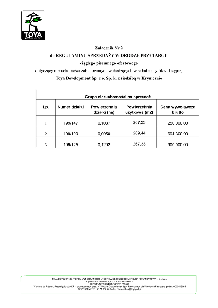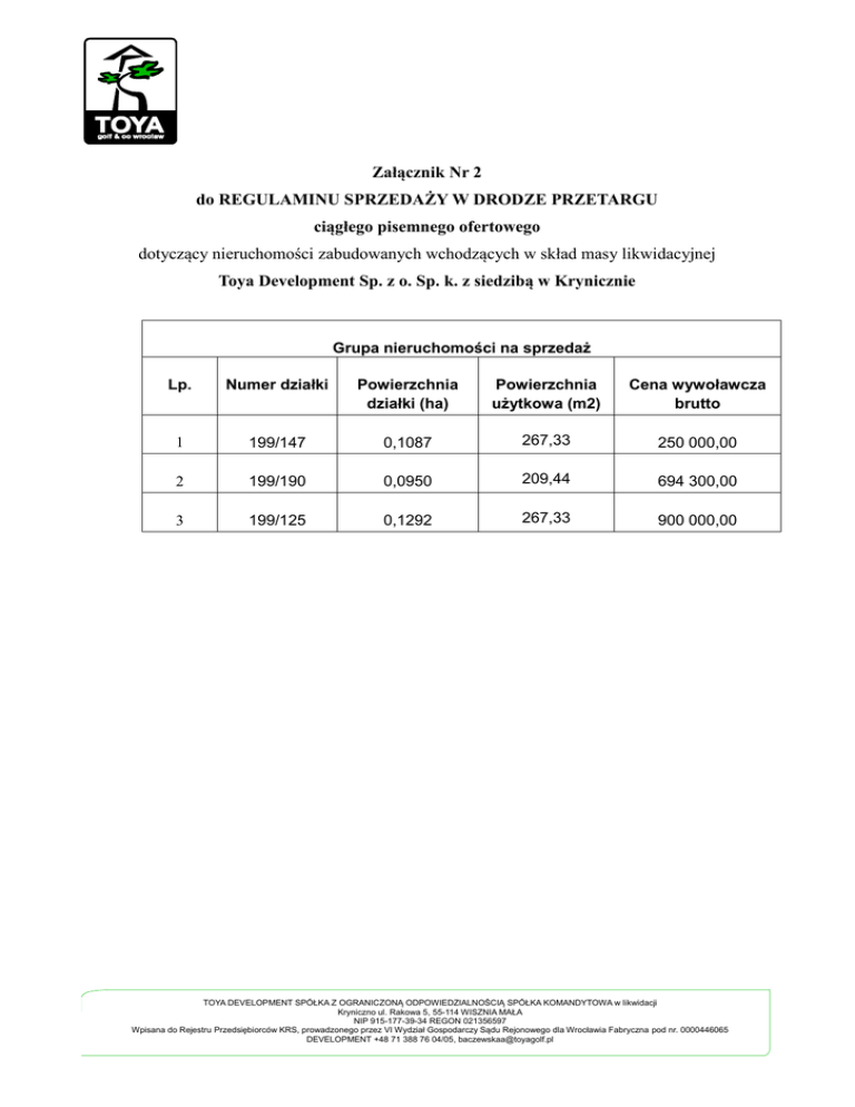 Załącznik Nr 2 do REGULAMINU SPRZEDAŻY W DRODZE PRZETARGU ciągłego pisemnego ofertowego dotyczący nieruchomości zabudowanych wchodzących w skład masy likwidacyjnej Toya Development Sp. z o. Sp. k. z siedzibą w Krynicznie Grupa nieruchomości na sprzedaż Lp. Numer działki Powierzchnia działki (ha) Powierzchnia użytkowa (m2) Cena wywoławcza brutto 1 199/147 0,1087 267,33 250 000,00 2 199/190 0,0950 209,44 694 300,00 3 199/125 0,1292 267,33 900 000,00 TOYA DEVELOPMENT SPÓŁKA Z OGRANICZONĄ ODPOWIEDZIALNOŚCIĄ SPÓŁKA KOMANDYTOWA w likwidacji Kryniczno ul. Rakowa 5, 55-114 WISZNIA MAŁA NIP 915-177-39-34 REGON 021356597 Wpisana do Rejestru Przedsiębiorców KRS, prowadzonego przez VI Wydział Gospodarczy Sądu Rejonowego dla Wrocławia Fabryczna pod nr. 0000446065 DEVELOPMENT +48 71 388 76 04/05, [email protected]