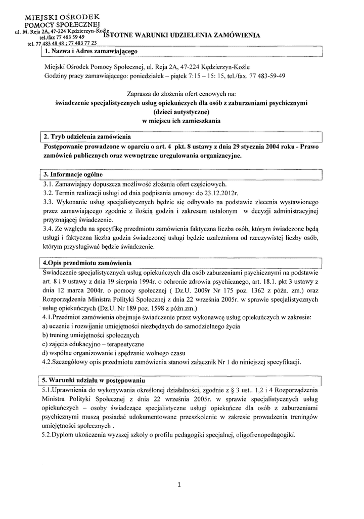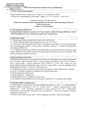 MIEJSKI OŚRODEK POMOCY ,SPOŁECZNEJ ul. M. Reja 2A, 47-224 Kędzierzyn-KoYśTOTNE WARUNKI UDZIELENIA ZAMÓWIENIA tel.rfax 77 483 59 49 tel. 77 483 48 48 ; 77 483 77 23 /1. Nazwa i Adres zamawiającego Miejski Ośrodek Pomocy Społecznej, ul. Reja 2A, 47-224 Kędzierzyn-Koźle Godziny pracy zamawiającego: poniedziałek - piątek 7:15 - 15: 15, tel./fax. 77 483-59-49 Zaprasza do złożenia ofert cenowych na: świadczenie specjalistycznych usług opiekuńczych dla osób z zaburzeniami psychicznymi (dzieci autystyczne) w miejscu ich zamieszkania I 2. Tryb udzielenia zamówienia Postępowanie I prowadzone w oparciu o art. 4 pkt. 8 ustawy z dnia 29 stycznia 2004 roku - Prawo oraz wewnętrzne uregulowania organizacyjne. zamówień publicznych l 3. Informacje ogólne I 3.1. Zamawiający dopuszcza możliwość złożenia ofert częściowych. 3.2. Termin realizacji usługi od dnia podpisania umowy: do 23.12.2012r. 3.3. Wykonanie usług specjalistycznych będzie się odbywało na podstawie zlecenia wystawionego przez zamawiającego zgodnie z ilością godzin i zakresem ustalonym w decyzji administracyjnej przyznającej świadczenie. 3.4. Ze względu na specyfikę przedmiotu zamówienia faktyczna liczba osób, którym świadczone będą usługi i faktyczna liczba godzin świadczonej usługi będzie uzależniona od rzeczywistej liczby osób, którym przysługiwać będzie świadczenie. I 4.0pis przedmiotu zamówienia I Świadczenie specjalistycznych usług opiekuńczych dla osób zaburzeniami psychicznymi na podstawie art. 8 i 9 ustawy z dnia 19 sierpnia 1994r. o ochronie zdrowia psychicznego, art. 18.1. pkt 3 ustawy z dnia 12 marca 2004r. o pomocy społecznej ( Dz.U. 2009r Nr 175 poz. 1362 z późno zm.) oraz Rozporządzenia Ministra Polityki Społecznej z dnia 22 września 2005r. w sprawie specjalistycznych usług opiekuńczych (Dz.U. Nr 189 poz. 1598 z późn.zm.) 4.1.Przedmiot zamówienia obejmuje świadczenie przez wykonawcę usług opiekuńczych w zakresie: a) uczenie i rozwijanie umiejętności niezbędnych do samodzielnego życia b) trening umiejętności społecznych c) zajęcia edukacyjno - terapeutyczne d) wspólne organizowanie i spędzanie wolnego czasu 4.2.Szczegółowy opis przedmiotu zamówienia stanowi załącznik Nr l do niniejszej specyfikacji. ( 5. Warunki udziału w postępowaniu I 5.l.Uprawnienia do wykonywania określonej działalności, zgodnie z § 3 ust.. 1,2 i 4 Rozporządzenia Ministra Polityki Społecznej z dnia 22 września 2005r. w sprawie specjalistycznych usług opiekuńczych - osoby świadczące specjalistyczne usługi opiekuńcze dla osób z zaburzeniami psychicznymi muszą posiadać udokumentowane przeszkolenie w zakresie prowadzenia treningów umiejętności społecznych. 5.2.Dyplom ukończenia wyższej szkoły o profilu pedagogiki specjalnej, oligofrenopedagogiki. 1 I 6. Dokumenty wymagane od wykonawców 6.1.Zamawiający wymaga, by każda oferta zawierał wypełniony i podpisany przez Wykonawcę: a) formularz ofertowo-cenowy stanowiący załącznik Nr 2 do IWUZ b) dokumenty potwierdzające warunki udziału postępowania zawarte w pkt. 5 specyfikacji lWUZ. 6.2.Postępowanie prowadzone jest w języku polskim. 7. Informacja o sposobie porozumiewania się zamawiającego z wykonawcami oraz przekazywania dokumentacji ofertowej. Wszelkie oświadczenia, wnioski, zawiadomienia oraz informacje Zamawiający i Wykonawcy mogą przekazywać pisemnie lub za pomocą faksu. 8. Osoby po stronie zamawiającego uprawnione do porozumiewania się z wykonawcami 8.1. Osobą uprawniona do kontaktowania się z Wykonawcami i udzielania informacji dotyczących postępowania w sprawach proceduralnych i merytorycznych jest Pani Beata Greguła, tel. 77/483-48-48 wew. 52. 8.2.Wykonawca może zwrócić się do zamawiającego o wyjaśnienie Istotnych Warunków Udzielenia Zamówienia. 9. Miejsce itermin składania i rozpatrzenia ofert 9.1.0fertę cenową w formie pisemnej należy złożyć w siedzibie Zamawiającego: Miejski Ośrodek Pomocy Społecznej, ul. Reja 2A, 47-224 Kędzierzyn-Koźle w Sekretariacie ~ I piętro, pokój 2 - w terminie do dnia 03.02.2012r. do godziny 15:00 9.2. Zamawiający dopuszcza składanie ofert faksem pod nr 77/483-49-49. 9.3.Zamawiający dokona rozpatrzenia ofert niezwłocznie po upływie terminu w pkt.9.1. 110. Kryteria oceny ofert Zamawiający będzie się kierował następującymi I kryteriami: Cena - 80% Doświadczenie - 200/0 111. Pozostałe informacje I 11.1.0 wyborze oferty Zamawiający zawiadomi niezwłocznie wykonawców, którzy ubiegali się o udzielenie zamówienia. 11.2. Jeżeli wykonawca uchyli się od realizacji zamówienia Zamawiający wybierze ofertę najkorzystniej szą wśród pozostałych ofert, bez przeprowadzania ich ponownej oceny. 11.3. Do prowadzonego postępowania nie przysługują wykonawcom środki ochrony prawnej (skargi, odwołanie) określone odpowiednio przepisach ustawy Prawo zamówień publicznych. 12. Załączniki do IWUZ 12.1 Szczegółowy opis przedmiotu zamówienia - załącznik Nr 1 12.2. Formularz cenowo-ofertowy - załącznik Nr 2 Kędzierzyn-Koźle, dnia 25.01.2012r. 2 I MIEJSKI OŚRODEK POMOCY SPOŁECZNEJ ul. M. Reja 2A, 47-224 Kędzierzyn-Koźle tel./fax 77 483 59 49 tel. 774834848; 77 483 77 23 Załącznik Nr Szczegółowy l do lWUZ opis przedmiotu zamówienia 1. Przedmiotem postępowania jest świadczenie specjalistycznych usług opiekuńczych dla osób z zaburzeniami psychicznymi ( dzieci autystyczne) w miejscu ich zamieszkania w zakresie: a)uczenie i rozwijanie umiejętności niezbędnych do samodzielnego życia b)trening umiejętności społecznych c)zajęcia edukacyjno-terapeutyczne d)wspólne organizowanie i spędzanie wolnego czasu. 2. Ilość świadczonych miesięcznie godzin specjalistycznych usług opiekuńczych uzależniona jest od ilości złożonych wniosków na te usługi oraz od przyznanych przez Urząd Wojewódzki środków finansowych na realizację zadania. 3.Zleceniodawca zastrzega sobie zmianę ilości 