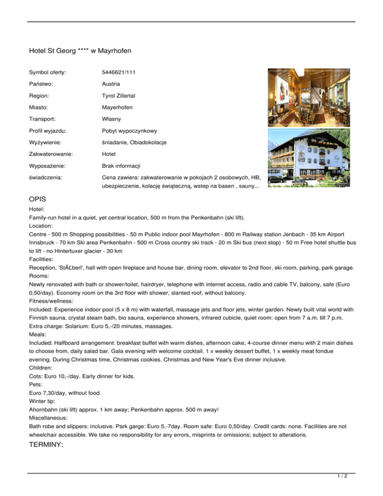 Hotel St Georg **** w Mayrhofen Symbol oferty: 5446621/111 Państwo: Austria Region: Tyrol Zillertal Miasto: Mayerhofen Transport: Własny Profil wyjazdu: Pobyt wypoczynkowy Wyżywienie: śniadanie, Obiadokolacje Zakwaterowanie: Hotel Wyposażenie: Brak informacji świadczenia: Cena zawiera: zakwaterowanie w pokojach 2 osobowych, HB, ubezpieczenie, kolację świąteczną, wstep na basen , sauny... OPIS Hotel: Family-run hotel in a quiet, yet central location, 500 m from the Penkenbahn (ski lift). Location: Centre - 500 m Shopping possibilities - 50 m Public indoor pool Mayrhofen - 800 m Railway station Jenbach - 35 km Airport Innsbruck - 70 km Ski area Penkenbahn - 500 m Cross country ski track - 20 m Ski bus (next stop) - 50 m Free hotel shuttle bus to lift - no Hintertuxer glacier - 30 km Facilities: Reception, 'StĂĽberl', hall with open fireplace and house bar, dining room, elevator to 2nd floor, ski room, parking, park garage. Rooms: Newly renovated with bath or shower/toilet, hairdryer, telephone with internet access, radio and cable TV, balcony, safe (Euro 0,50/day). Economy room on the 3rd floor with shower, slanted roof, without balcony. Fitness/wellness: Included: Experience indoor pool (5 x 8 m) with waterfall, massage jets and floor jets, winter garden. Newly built vital world with Finnish sauna, crystal steam bath, bio sauna, experience showers, infrared cubicle, quiet room: open from 7 a.m. till 7 p.m. Extra charge: Solarium: Euro 5,-/20 minutes, massages. Meals: Included: Halfboard arrangement: breakfast buffet with warm dishes, afternoon cake, 4-course dinner menu with 2 main dishes to choose from, daily salad bar. Gala evening with welcome cocktail. 1 x weekly dessert buffet, 1 x weekly meat fondue evening. During Christmas time, Christmas cookies. Christmas and New Year's Eve dinner inclusive. Children: Cots: Euro 10,-/day. Early dinner for kids. Pets: Euro 7,30/day, without food. Winter tip: Ahornbahn (ski lift) approx. 1 km away; Penkenbahn approx. 500 m away! Miscellaneous: Bath robe and slippers: inclusive. Park garge: Euro 5,-7day. Room safe: Euro 0,50/day. Credit cards: none. Facilities are not wheelchair accessible. We take no responsibility for any errors, misprints or omissions; subject to alterations. TERMINY: 1/2 od: 2017-12-09 do: 2017-12-16 (8 dni), miejsca: zamów cena od: 3069 PLN = 707 EUR CENNIK: Długość pobytu: 8 dni Grupa cenowa: A Inne (opcjonalne) (*) pakiet w/g świadczeń Rodzaj osoby (do wyboru) (*) osoba dorosła dziecko 2-6 lat z rodzicami w łóżku drugie dziecko na dostwce 6-12 lat dziecko 0-2 lat bez świadczeń (-) 707 -353.5 -212.1 -707 Waluta: EUR Aktualne ceny z systemu S.A.R.T. (-) - cena usługi, podatku kalkulowana przy osobie lub gratis (*) - kwota wliczona w cenę standardową 2/2