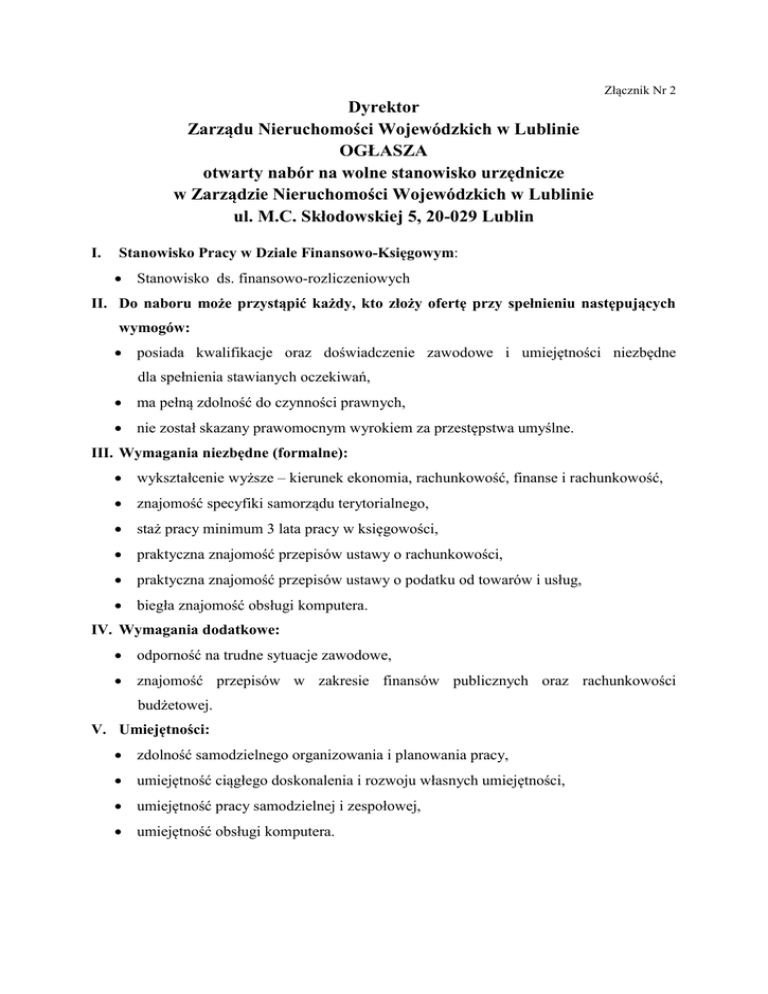 Złącznik Nr 2 Dyrektor Zarządu Nieruchomości Wojewódzkich w Lublinie OGŁASZA otwarty nabór na wolne stanowisko urzędnicze w Zarządzie Nieruchomości Wojewódzkich w Lublinie ul. M.C. Skłodowskiej 5, 20-029 Lublin I. Stanowisko Pracy w Dziale Finansowo-Księgowym: Stanowisko ds. finansowo-rozliczeniowych II. Do naboru może przystąpić każdy, kto złoży ofertę przy spełnieniu następujących wymogów: posiada kwalifikacje oraz doświadczenie zawodowe i umiejętności niezbędne dla spełnienia stawianych oczekiwań, ma pełną zdolność do czynności prawnych, nie został skazany prawomocnym wyrokiem za przestępstwa umyślne. III. Wymagania niezbędne (formalne): wykształcenie wyższe – kierunek ekonomia, rachunkowość, finanse i rachunkowość, znajomość specyfiki samorządu terytorialnego, staż pracy minimum 3 lata pracy w księgowości, praktyczna znajomość przepisów ustawy o rachunkowości, praktyczna znajomość przepisów ustawy o podatku od towarów i usług, biegła znajomość obsługi komputera. IV. Wymagania dodatkowe: odporność na trudne sytuacje zawodowe, znajomość przepisów w zakresie finansów publicznych oraz rachunkowości budżetowej. V. Umiejętności: zdolność samodzielnego organizowania i planowania pracy, umiejętność ciągłego doskonalenia i rozwoju własnych umiejętności, umiejętność pracy samodzielnej i zespołowej, umiejętność obsługi komputera. VI. Zakres wykonywanych zadań na stanowisku: wystawianie faktur sprzedaży na podstawie umów najmu, dzierżawy oraz porozumień zgodnie z obowiązującymi przepisami podatkowymi oraz ustawą o rachunkowości, naliczanie odsetek za zwłokę, wystawianie oraz księgowanie not odsetkowych, dekretowanie dokumentów księgowych, dekretowanie wpłat oraz wprowadzanie do programu finansowo-księgowego wyciągów bankowych, prowadzenie ewidencji rozrachunków, prowadzenie rejestrów umów z najemcami i dostawcami, sporządzanie wezwań do zapłaty, prowadzenie korespondencji i rozmów z najemcami w zakresie zaległości oraz nadpłat, sprawdzanie pod względem formalnym i rachunkowym dokumentów sprzedaży, współpraca z osobą zajmującą się windykacją należności, sporządzanie i księgowanie poleceń księgowania, bieżące uzgadnianie zapisów prowadzonych kont analitycznych i syntetycznych, terminowe przekazywanie informacji niezbędnych do sporządzania sprawozdawczości, w zastępstwie prowadzenie ewidencji księgowej spraw sądowych oraz przygotowywanie dokumentów niezbędnych do skierowania pozwu do sądu. VII. Informacja o warunkach pracy: miejsce świadczenia pracy: Lublin, wymiar czasu pracy: pełny wymiar godzin – 40h/tydzień (pełny etat), praca przy komputerze, okres pracy: 6 miesięcy od podpisania umowy z możliwością jej przedłużenia. VIII. Wskaźnik zatrudnienia osób niepełnosprawnych w jednostce: wskaźnik zatrudnienia osób niepełnosprawnych w Zarządzie Nieruchomości Wojewódzkich w Lublinie w miesiącu czerwcu 2012 r. w rozumieniu przepisów o rehabilitacji zawodowej i społecznej oraz zatrudnieniu osób niepełnosprawnych, jest mniejszy niż 6%. IX. Wymagane dokumenty: list motywacyjny, życiorys, 2 kserokopie dokumentów potwierdzających wykształcenie, kserokopie dokumentów potwierdzających doświadczenie zawodowe, kserokopie zaświadczeń o ukończonych kursach, szkoleniach, inne dodatkowe dokumenty potwierdzające posiadane kwalifikacje lub umiejętności np. referencje, podpisane oświadczenie kandydata o korzystaniu z pełni praw publicznych oraz nie skazaniu prawomocnym wyrokiem sądu za umyślne przestępstwo ścigane z oskarżenia publicznego lub umyślne przestępstwa skarbowe, podpisane oświadczenie kandydata o wyrażeniu zgody na przetwarzanie danych osobowych do celów rekrutacji. kopia dokumentu potwierdzającego niepełnosprawność kandydata, który zamierza skorzystać z uprawnienia, o którym mowa w art. 13a ust. 2 ustawy z dnia 21 listopada 2008 r. o pracownikach samorządowych (dz. u. nr 223, poz. 1458 z późn. zm.). O stanowisko mogą ubiegać się obywatele Unii Europejskiej oraz obywatele innych państw, którym na podstawie umów międzynarodowych lub przepisów prawa wspólnotowego przysługuje prawo do podjęcia zatrudnienia na terytorium Rzeczypospolitej Polskiej, jeżeli posiadają znajomość języka polskiego potwierdzoną dokumentem określonym w przepisach o służbie cywilnej. Wymagane dokumenty aplikacyjne należy składać osobiście w siedzibie Zarządu Nieruchomości Wojewódzkich w Lublinie ul. M.C. Skłodowskiej 5, 20-029 Lublin w godzinach: od 730 – do 1530 pokój nr 177 lub pocztą na adres Zarządu Nieruchomości Wojewódzkich. Dokumenty aplikacyjne należy składać w zaklejonej i opisanej kopercie (imię i nazwisko, adres) z dopiskiem „dotyczy: naboru na stanowisko urzędnicze”, w terminie do 16 lipca 2012 r. Decyduje data faktycznego wpływu do ZNW w Lublinie. Aplikacje, które wpłyną do ZNW po wyżej określonym terminie, jak również nie spełniające wymogów formalnych nie będą rozpatrywane. Informacja o wyniku naboru będzie umieszczona na stronie internetowej Informacji Publicznej /www.znwlublin.bip.lublin.pl/ oraz na tablicy Biuletynu informacyjnej przy ul. M. C. Skłodowskiej 5 w Lublinie. X. Inne informacje: Rekrutacja odbędzie się dwuetapowo - sprawdzenie wiedzy z zakresu znajomości przepisów ustawy o rachunkowości oraz ustawy o podatku od towarów i usług w formie pisemnej, 3 - rozmowa kwalifikacyjna. Na sprawdzenie wiedzy w formie pisemnej oraz rozmowę kwalifikacyjną będą telefonicznie zapraszani kandydaci, którzy: spełniają wymagania niezbędne/formalne określone w ogłoszeniu o naborze, osoby, których oferty zostaną odrzucone nie będą powiadamiane, informacja o wyniku naboru będzie umieszczona na stronie internetowej BIP /www.znwlublin.bip.lublin.pl/ oraz na tablicy informacyjnej w ZNW przy ul. M.C. Skłodowskiej 5 w Lublinie. Podpisał p.o. Dyrektor