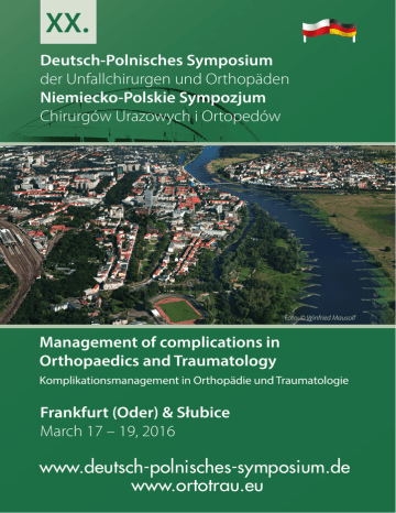 XX. Deutsch-Polnisches Symposium der Unfallchirurgen und Orthopäden Niemiecko-Polskie Sympozjum Chirurgów Urazowych i Ortopedów Foto: © Winfried Mausolf Management of complications in Orthopaedics and Traumatology Komplikationsmanagement in Orthopädie und Traumatologie Frankfurt (Oder) & Słubice March 17 – 19, 2016 www.deutsch-polnisches-symposium.de www.ortotrau.eu Einladung Liebe Kolleginnen und Kollegen, wir freuen uns, Sie zu der XX. gemeinsamen Tagung der Unfallchirurgen und Orthopäden aus Deutschland und Polen 2016 einladen zu können. Um allen Teilnehmern ein interessantes und aktuelles Programm anbieten zu können, werden wir uns mit den Herausforderungen des Komplikationsmanagements befassen. Die zunehmende Vielfalt moderner Verfahren in Orthopädie und Traumatologie, die Alterszunahme und Komorbidität unserer Patienten und Voroperationen führen zunehmend zu Komplikationen und neuen operativen Herausforderungen. Um den entsprechend hohen Erwartungen unserer Patienten gerecht werden zu können, bedarf es nicht nur der Kenntnis neuer Implantate und Operationen, sondern auch einer optimierten interkollegialen und interdisziplinären Zusammenarbeit. Ziel der Veranstaltung ist es, bewährte und auch neue Methoden bei der Beherrschung perioperativer, aber auch spät auftretender Komplikationen mit einem internationalen und fachkundigen Publikum zu diskutieren. Ein wesentliches Ziel soll es sein, Möglichkeiten zur adäquaten Therapie und Prophylaxe relevanter Komplikationen aufzuzeigen. Wir hoffen, dass wir sowohl mit der Auswahl des Themas, als auch mit dem bewährten grenzübergreifenden Charakter unseres Symposiums Ihr Interesse geweckt haben und freuen uns, Sie als Teilnehmer begrüßen zu dürfen. Ihre Frank Jacek HoffmannKaczmarczyk 2 Andrzej Wasilewski Zaproszenie Szanowni Państwo, z ogromną radością już dziś zapraszamy Państwa do udziału w XX spotkaniu chirurgów urazowych i ortopedów z Niemiec i Polski w roku 2016. Tegoroczne spotkanie będzie poświęcone bardzo aktualnej tematyce leczenia powikłań. Coraz większa różnorodność dostępnych terapii w ortopedii i traumatologii, coraz bardziej zaawansowany wiek pacjentów, współistniejące choroby i poprzednie zabiegi operacyjne w wywiadzie to czynniki, które przekładają się na rosnące wskaźniki powikłań i nowe wyzwania chirurgiczne. Aby sprostać rosnącym oczekiwaniom pacjentów, lekarze powinni rozwijać nie tylko ściśle medyczną wiedzę w zakresie protez i chirurgii, lecz również interkolegialną i interdyscyplinarną współpracę. Sprawdzone i nowe metody postępowania z okołooperacyjnymi i późnymi powikłaniami zostaną zaprezentowane w międzynarodowym i profesjonalnym gronie ekspertów. Celem naszego spotkania jest też wskazanie adekwatnych możliwości terapii i profilaktyki istotnych powikłań. Mamy nadzieję, że zainteresuje Państwa zarówno wybór tematów, jak i ponadnarodowy charakter naszego sympozjum. Z przyjemnością powitamy Państwa w gronie uczestników. Z poważaniem, Frank Hoffmann Jacek Kaczmarczyk Andrzej Wasilewski 3 www.congress-compact.de Congress Compact 2C GmbH · Joachimsthaler Straße 10 · 10719 Berlin Telefon +49 30 32708233 · E-Mail [email protected] Table of Contents Einladung 2 Zaproszenie 3 Program Friday, March 18, 2016 Saturday, March 19, 2016 6 11 Faculty 13 Sponsors 18 General Information 20 Registration 23 5 Friday | March 18, 2016 09:00 Registration 10:00 Welcome Presidency: Gernot Felmet, Frank Hoffmann, Jacek Kaczmarczyk, Leszek Romanowski, Steffen Ruchholt, Andrzej Bohatyrewicz, Jarosław Deszczyński, Andrzej Wasilewski 10:20 Opening lecture Presidency: Wolfgang Senst Jarosław Bielawsk, , Andrzej Wall 11:00-13:40 Session – Hip, Femur Presidency: François Kelberine Hermann-Josef Bail Andrzej Bohatyrewicz, Leszek Romanowski 8’ Reconstruction of post traumatic deformities of the legs Hermann-Josef Bail 15’ Surgical approaches in THA – indications and complications Jacek Kaczmarczyk 10’ How to avoid complications in Total Joint Replacement Burkhard Wippermann 8’ Treatment of periprosthetic fracture of the femur using cable and plate system Jacek Kaczmarczyk, Z. Piślewski, W. Strzyżewski 10’ Periimplant fractures after osteosynthesis – and now? Ludwig Schütz 8’ Current trends and challenges in hip joint replacement Jacek Kaczmarczyk 8’ Ceramic fracture in cases of hip endoprosthesis with ceramicsliding combination Thilo Hennecke, A. Krainz, R. Peer 6 Friday | March 18, 2016 8’ Normal gait pattern disorder after primary total hip replacement Łukasz Czarnocki, Artur Stolarczyk, Magda Stolarczyk, Jarosław Deszczyński, Jarosław Michał Deszczyński 8’ Quality of life in patients with ectopic bone after primary total hip replacement Artur Stolarczyk, Magda Stolarczyk, Jarosław Deszczyński, Jarosław Michał Deszczyński 8’ Periprosthetic distal fractures of femur – management and therapy Ludwig Schütz 8’ Realloplasty after periprosthetic infection of the hip Jerzy Białecki, Maciej Kogut, Wojciech Marczyński, M. Obrębski, M. Szyszka 8’ Implant failure at the hip and femur – is it the implant? Stephan Arens, Michal Jagielski 8’ Prevention of complications in bone nailing Dominik Pelc, D. Stube, A. Szmania, Andrzej Wasilewski 8’ Prophylaxis of complications in bone nailing Andrzej Wasilewski, D. Stube, Dominik Pelc, A. Szmania 8’ “Imperfect hips” as a problem at an older age. Early and late prophylactic management before arthrosis J. Karski, T. Karski 13:40-14:30 Lunch and industrial exhibition 7 Friday | March 18, 2016 13:00-14:30 Special Course – Physiotherapy Session in German and Polish with simultaneous translation Presidency: Fred Villbrandt Artur Stolarczyk, Ewa Latour 8’ Education in physiotherapy – comparison Tom Richter 8’ Myofascial trigger points release as a treatment in postamputation pain Małgorzata Chochowska 8’ Education in physiotherapy – comparison Ewa Lat