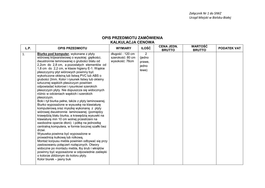 Załącznik Nr 1 do SIWZ Urząd Miejski w Bielsku-Białej OPIS PRZEDMIOTU ZAMÓWIENIA KALKULACJA CENOWA L.P. 1. OPIS PRZEDMIOTU WYMIARY Biurko pod komputer, wykonane z płyty wiórowej trójwarstwowej o wysokiej giętkości, dwustronnie laminowanej o grubości blatu od 2,2cm do 2,8 cm, a pozostałych elementów od 1,8 cm do 2,2 cm, w klasie higieny E-1. Wąskie płaszczyzny płyt wiórowych powinny być wykończone okleiną lub listwą PVC lub ABS o grubości 2mm. Kolor i rysunek listwy lub okleiny sztucznej wąskich płaszczyzn powinien odpowiadać kolorowi i rysunkowi szerokich płaszczyzn płyty. Nie dopuszcza się widocznych róŜnic w odcieniach wąskich i szerokich płaszczyzn. Boki i tył biurka pełne, takŜe z płyty laminowanej. Biurko wyposaŜone w wysuwkę na klawiaturę komputerową oraz myszkę wykonaną z płyty wiórowej dwustronnie laminowanej (pomiędzy krawędzią blatu biurka, a krawędzią wysuwki na klawiaturę min 10 cm wolnej przestrzeni na swobodne oparcie dłoni) i półkę na jednostkę centralną komputera, w formie bocznej szafki bez drzwi. Wysuwka powinna być wyposaŜone w prowadnicę kulkową lub rolkową. MontaŜ korpusu mebla powinien odbywać się przy zastosowaniu połączeń rozłącznych. Otwory widoczne po montaŜu mebla, łby śrub i wkrętów powinny być wyposaŜone w odpowiednie zaślepki o kolorze zbliŜonym do koloru płyty. Kolor biurek – jasny buk długość : 120 cm szerokość: 80 cm wysokość: 76cm ILOŚĆ 2 (jedno prawe, jedno lewe) CENA JEDN. BRUTTO WARTOŚĆ BRUTTO PODATEK VAT Załącznik Nr 1 do SIWZ Urząd Miejski w Bielsku-Białej 2. Szafka pod drukarkę, wykonana z płyty wiórowej trójwarstwowej o wysokiej giętkości, dwustronnie laminowanej o grubości blatu od 2,2cm do 2,8 cm i pozostałych elementów od 1,8 cm do 2,2, cm w klasie higieny E-1. Wąskie płaszczyzny płyt wiórowych powinny być wykończone okleiną lub listwą PVC lub ABS o grubości 2mm. Kolor i rysunek listwy lub okleiny sztucznej wąskich płaszczyzn powinien odpowiadać kolorowi i rysunkowi szerokich płaszczyzn płyty. Nie dopuszcza się widocznych róŜnic w odcieniach wąskich i szerokich płaszczyzn. Plecy szafki wykonane z płyty HDF o grubości min. 3 mm, wpuszczone we frezowane boki szafki, zabezpieczone przed wypadnięciem. Szafka musi posiadać 3 półki o grubości 1,8 cm z moŜliwością regulacji odległości między półkami. Drzwi szafki dwuskrzydłowe z zawiasami metalowymi i uchwytami metalowymi. MontaŜ korpusu mebla powinien odbywać się przy zastosowaniu połączeń rozłącznych. Otwory widoczne po montaŜu mebla, łby śrub i wkrętów powinny być wyposaŜone w odpowiednie zaślepki o kolorze zbliŜonym do koloru płyty. Kolor szafki – jasny buk. szerokość: 80 cm Głębokość: 40 cm Wysokość: 80 cm 1 3. Biurko naroŜne, wykonane z płyty wiórowej trójwarstwowej o wysokiej giętkości dwustronnie laminowanej o grubości od 1,8 cm do 2,2cm , w klasie higieny E-1. Wąskie płaszczyzny płyt wiórowych powinny być wykończone okleiną lub listwą PVC lub ABS o grubości 2mm. Kolor i rysunek listwy lub okleiny sztucznej wąskich płaszczyzn powinien odpowiadać Długość: 150cm x 150cm Szerokość:60cm x 60cm Wysokość: 76cm 1 Załącznik Nr 1 do SIWZ Urząd Miejski w Bielsku-Białej kolorowi i rysunkowi szerokich płaszczyzn płyty. Nie dopuszcza się widocznych róŜnic w odcieniach wąskich i szerokich płaszczyzn. Boki i tył biurka pełne, takŜe z płyty laminowanej. Blat biurka z płyty wiórowej trójwarstwowej o wysokiej giętkości dwustronnie laminowanej o grubości od 2,2cm do 2,8 cm, naroŜnik wewnętrzny blatu zaokrąglony. Biurko wyposaŜone w szufladę na klawiaturę. MontaŜ korpusu mebla powinien odbywać się przy zastosowaniu połączeń rozłącznych. Otwory widoczne po montaŜu mebla, łby śrub i wkrętów powinny być wyposaŜone w odpowiednie zaślepki o kolorze zbliŜonym do koloru płyty. Kolor biurka – jasny buk. 4. Kontener czteroszufladowy, wykonany z płyty wiórowej trójwarstwowej o wysokiej giętkości dwustronnie laminowanej o grubości od 1,8cm do 2,2cm, w klasie higieny E-1. Wąskie płaszczyzny płyt wiórowych powinny być wykończone okleiną lub listwą PVC lub ABS o grubości 2mm. Kolor i rysunek listwy lub okleiny sztucznej wąskich płaszczyzn powinien odpowiadać kolorowi i rysunkowi szerokich płaszczyzn płyty. Nie dopuszcza się widocznych róŜnic w odcieniach wąskich i szerokich płaszczyzn. Kontener powinien być wyposaŜony w piórnik oraz zamek centralny. Szuflady oraz wysuwki powinny być wyposaŜone w prowadnice kulkowe. Kontener musi być wyposaŜony w kółka umoŜliwiające łatwe przesuwanie po twardym/miękkim podłoŜu. MontaŜ korpusu mebla powinien odbywać się przy Szerokość: 40cm Głębokość :45cm Wysokość : 60cm 4 Załącznik Nr 1 do SIWZ Urząd Miejski w Bielsku-Białej zastosowaniu połączeń rozłącznych. Otwory widoczne po montaŜu mebla, łby śrub i wkrętów powinny być wyposaŜone w odpowiednie zaślepki o kolorze zbliŜonym do koloru płyty. Kolor kontenera – jasny buk. 5. Biurko naroŜne, wykonane z płyty wiórowej trójwarstwowej o wysokiej giętkości dwustronnie laminowanej o grubości od 1,8 cm do 2,2cm , w klasie higieny E-1. Wąskie płaszczyzny płyt wiórowych powinny być wykończone okleiną lub listwą PVC lub ABS o grubości 2mm. Kolor i rysunek listwy lub okleiny sztucznej wąskich płaszczyzn powinien odpowiadać kolorowi i rysunkowi szerokich płaszczyzn płyty. Nie dopuszcza się widocznych róŜnic w odcieniach wąskich i szerokich płaszczyzn. Boki i tył biurka pełne, takŜe z płyty laminowanej. Blat biurka z płyty wiórowej trójwarstwowej o wysokiej giętkości dwustronnie laminowanej o grubości od 2,2cm do 2,8 cm, naroŜnik wewnętrzny blatu zaokrąglony. Biurko wyposaŜone w szufladę na klawiaturę. MontaŜ korpusu mebla powinien odbywać się przy zastosowaniu połączeń rozłącznych. Otwory widoczne po