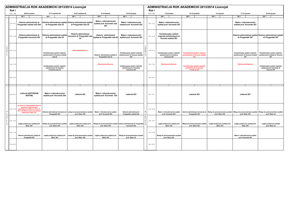 ADMINISTRACJA ROK AKADEMICKI 2013/2014 Licencjat 1 2 3 4 5 Rok I 6 7 8 9 10 Godz. / data 28-29 wrzesień 12-13 październik 26-27 październik 9-10 listopad 23-24 listopad Godz. / data 7-8 grudzień 14-15 grudzień 4-5 styczeń 11-12 styczeń 25-26 styczeń GR 1 8.00 - 10.15 10.30 - 12.45 S O B O T A ADMINISTRACJA ROK AKADEMICKI 2013/2014 Licencjat Rok I GR 1 GR 1 GR 1 Makro i mikroekonomia Historia administracji dr Historia administracji wykład Historia administracji wykład wykład prof. Kurowski sala Przygodzki wykład sala 203 dr Przygodzki sala 22 dr Przygodzki sala 22 203 Historia administracji dr Przygodzki ćwiczenia 203 Historia administracji Historia administracji wykład Historia administracji ćwiczenia dr Przygodzki sala dr Przygodzki sala 22 wykład dr Przygodzki sala 22 22 GR 1 Makro i mikroekonomia wykład prof. Kurowski 203 8.00 - 10.15 Makro i mikroekonomia wykład prof. Kurowski 207 Makro i mikroekonomia wykład prof. Kurowski 203 10.30 - 12.45 Konstytucyjny system organów państwowych dr Kuczma wyklad 207 Wychowanie fizyczne 13.00 - 15.15 Konstytucyjny system organów państwowych dr Kuczma wykład sala 22 Historia administracji wykład dr Przygodzki sala 22 GR 1 Konstytucyjny system organów państwowych dr Kuczma wykład 203 S O B O T A Wychowanie fizyczne 15.30 - 17.45 konstytucyjny system organów państwowych dr Kuczma ćwiczenia sala 22 GR 1 GR 1 Makro i mikroekonomia wykład prof. Kurowski 207 Historia administracji wykład Historia administracji wykład dr Przygodzki 207 dr Przygodzki 207 konstytucyjny system organów państwowych dr Kuczma ćwiczenia 207 15.30 - 17.45 Konstytucyjny system organów państwowych dr Kuczma wykład 207 Konstytucyjny system organów państwowych dr Kuczma wykład 207 Wychowanie fizyczne Konstytucyjny system organów państwowych wykład dr Kuczma 207 Wychowanie fizyczne konstytucyjny system organów państwowych dr Kuczma ćwiczenia 207 konstytucyjny system organów państwowych ćwiczenia dr Kuczma 207 18.00 - 20.15 8.00 - 10.15 Lektorat (ADITORIUM NOVUM) 10.30 - 12.45 od 10.30-11.15 Wychowanie fizyczne (spotkanie organizacyjne obowiązkowe Auditorium Nowum) OD 11.20 Wstep dp prawoznawstwa wykład prof. Bator 207 Makro i mikroekonomia wykład prof. Kurowski 203 Lektorat 203 Makro i mikroekonomia wykład prof. Kurowski 203 Lektorat 203 Makro i mikroekonomia wykład prof. Kurowski 203 Historia administracji dr Przygodzki wykład 203 Lektorat 203 8.00 - 10.15 Lektorat 207 10.30 - 12.45 Historia administracji ćwiczenia dr wstep do prawoznawstawa wykład Przygodzki 203 prof. Bator 203 13.00 - 15.15 Logika praktyczna wykład prof. Bator 207 Wstęp do prawoznawstwa wykład prof. Bator 203 Logika praktyczna wykład prof. Bator 203 Historia administracji wykład dr Przygodzki 207 Logika praktyczna wykład prof. Bator 203 wstep do prawoznawstawa wykład prof. Bator 203 Wstęp do prawoznawstwa wykład historia administracji dr Przygodzki prof. Bator 203 ćwiczenia 203 15.30 - 17.45 18.00 - 20.15 GR 1 13.00 - 15.15 konstytucyjny system organów państwowych dr Kuczma ćwiczenia 203 18.00 - 20.15 N I E D Z I E L A GR 1 N I E D Z I E L A Makro i mikroekonomia wykład prof. Kurowski 203 historia administracji ćwiczenia dr Przygodzki 203 Wstęp do prawoznawstwa wykład prof. Bator 203 Wstęp do prawoznawstwa wykład prof. Bator 207 Wstęp do prawoznawstwa wykład prof. Bator 22 Logika praktyczna wykład prof. Bator 203 Wstęp do prawoznawstwa wykład prof. Bator 203 Logika praktyczna wykład prof. Bator 203 Logika praktyczna wykład prof. Bator 207 Logika praktyczna wykład prof..Bator 22 13.00 - 15.15 15.30 - 17.45 Logika praktyczna wykład prof. Bator 203 Wstęp do prawoznawstwa wykład prof. Bator 22 Wstęp do prawoznawstwa wykład prof. Bator 203 18.00 - 20.15 Makro i mikroekonomia wykład prof. Kurowski 207