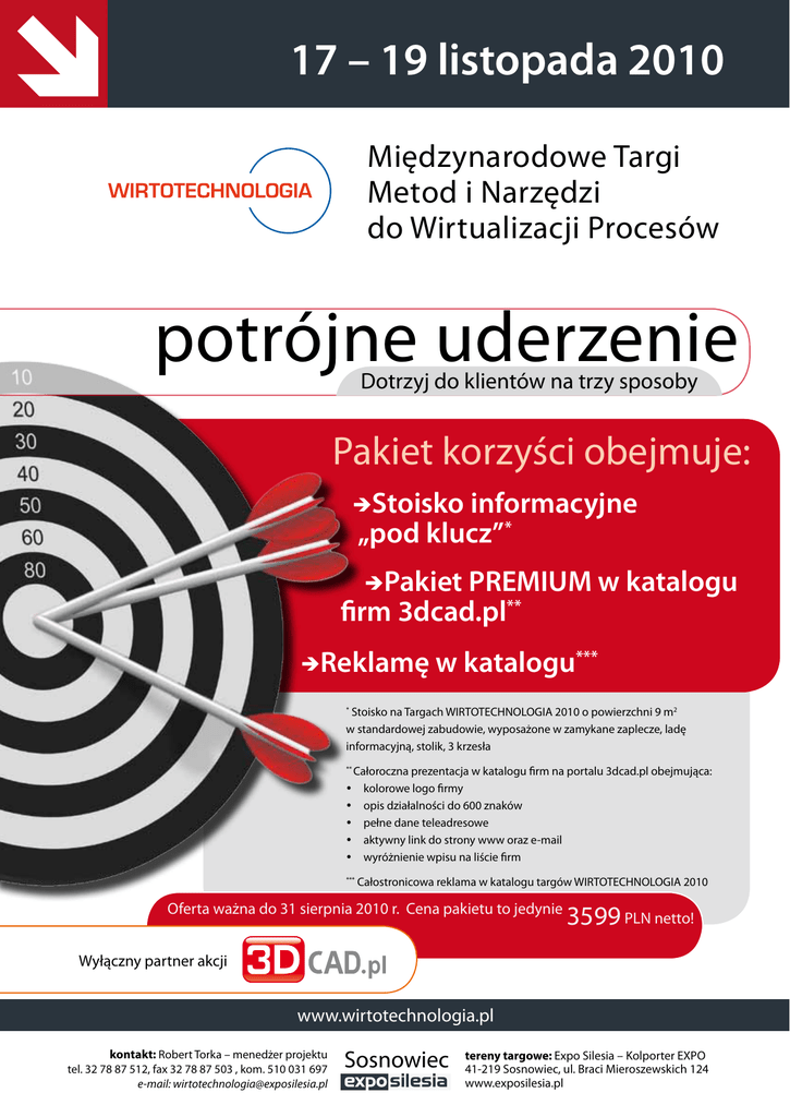 17 – 19 listopada 2010 Międzynarodowe Targi Metod i Narzędzi do Wirtualizacji Procesów potrójne uderzenie Dotrzyj do klientów na trzy sposoby Pakiet korzyści obejmuje: Stoisko informacyjne „pod klucz”* Pakiet PREMIUM w katalogu firm 3dcad.pl** Reklamę w katalogu*** Stoisko na Targach WIRTOTECHNOLOGIA 2010 o powierzchni 9 m2 w standardowej zabudowie, wyposażone w zamykane zaplecze, ladę informacyjną, stolik, 3 krzesła * ** Całoroczna prezentacja w katalogu firm na portalu 3dcad.pl obejmująca: kolorowe logo firmy opis działalności do 600 znaków pełne dane teleadresowe aktywny link do strony www oraz e-mail wyróżnienie wpisu na liście firm *** Całostronicowa reklama w katalogu targów WIRTOTECHNOLOGIA 2010 Oferta ważna do 31 sierpnia 2010 r. Cena pakietu to jedynie 3599 PLN netto! Wyłączny partner akcji www.wirtotechnologia.pl kontakt: Robert Torka – menedżer projektu tel. 32 78 87 512, fax 32 78 87 503 , kom. 510 031 697 e-mail: [email protected] Sosnowiec tereny targowe: Expo Silesia – Kolporter EXPO 41-219 Sosnowiec, ul. Braci Mieroszewskich 124 www.exposilesia.pl