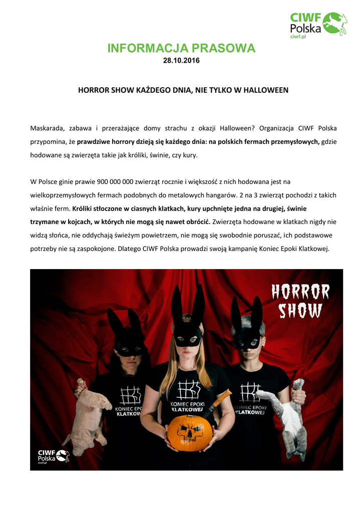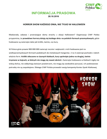 INFORMACJA PRASOWA 28.10.2016 HORROR SHOW KAŻDEGO DNIA, NIE TYLKO W HALLOWEEN Maskarada, zabawa i przerażające domy strachu z okazji Halloween? Organizacja CIWF Polska przypomina, że prawdziwe horrory dzieją się każdego dnia: na polskich fermach przemysłowych, gdzie hodowane są zwierzęta takie jak króliki, świnie, czy kury. W Polsce ginie prawie 900 000 000 zwierząt rocznie i większość z nich hodowana jest na wielkoprzemysłowych fermach podobnych do metalowych hangarów. 2 na 3 zwierząt pochodzi z takich właśnie ferm. Króliki stłoczone w ciasnych klatkach, kury upchnięte jedna na drugiej, świnie trzymane w kojcach, w których nie mogą się nawet obrócić. Zwierzęta hodowane w klatkach nigdy nie widzą słońca, nie oddychają świeżym powietrzem, nie mogą się swobodnie poruszać, ich podstawowe potrzeby nie są zaspokojone. Dlatego CIWF Polska prowadzi swoją kampanię Koniec Epoki Klatkowej. NAPRAWDĘ PRZERAŻAJĄCE FAKTY: W Polsce zabijanych jest rocznie 900 000 000 zwierząt; 99% królików hodowanych w Polsce na mięso zamyka się w klatkach, w których nie mogą skakać, swobodnie się poruszać, kopać, ani schować się w ustronnym miejscu; Na jednego królika w klatce przypada powierzchnia zbliżona do wielkości kartki A4; Około 90% kur w Polsce spędza swoje życie w klatkach; Kury z powodu stresu wzajemnie się okaleczają, wydziobują sobie pióra; W Polsce hoduje się około 11 milionów świń, z czego większość w gospodarstwach przemysłowych; Samice świń unieruchomione są przez wiele tygodni w kojcach porodowych, w których nie mogą nawet się obrócić, zamknięcie w małej przestrzeni powoduje bardzo duży stres u tych towarzyskich zwierząt; Prosiętom przycina się ogonki, kastruje i przycina zęby, zwykle bez żadnego znieczulenia, co powoduje ogromny ból; Małgorzata Szadkowska, dyrektor CIWF Polska, komentuje: „Zwierzęta hodowane w klatkach trzymane są w ogromnym ścisku, nie mają możliwości zaspokojenie swoich podstawowych i naturalnych potrzeb. To niewyobrażalne, maszynowe wręcz produkowanie naszego jedzenia i często nawet nie zdajemy sobie sprawy, jak to wygląda. A wygląda to źle: mówimy o zwierzętach, które mogą odczuwać ból, stres i strach, a żyją w zamknięciu, stłoczone z innymi osobnikami, bez dostępu do światła, trawy czy pastwiska i są poddawane różnym okrutnym praktykom. ” Co można więc zrobić, żeby pomóc zwierzętom hodowlanym? CIWF Polska namawia do dokonywania codziennych, mądrych wyborów konsumenckich i wybierania produktów, które pochodzą z mniejszych hodowli, zamiast tych z megaferm. W przypadku jajek system jest prosty i dobrze znany Polakom: należy wybierać jajka z numerem 0 lub 1. W przypadku mięsa, np. z kurczaka: warto zapłacić więcej za tego z małej hodowli, zjeść go rzadziej, ale lepszej jakości (badania pokazują, że takie mięso zawiera nawet 50% tłuszczu mniej i więcej kwasów omega-3). Warto też zmniejszyć ilość mięsa i produktów pochodzących od zwierząt w swojej diecie, a jeść więcej warzyw, strączków i kasz. Pomóż nam zakończyć ten codzienny horror zwierząt, wejdź na stronę: http://www.ciwf.pl/kim-jestesmy/jakmozesz-pomoc/ Więcej informacji o kampanii: http://www.ciwf.pl/kampanie/epoka-klatkowa/