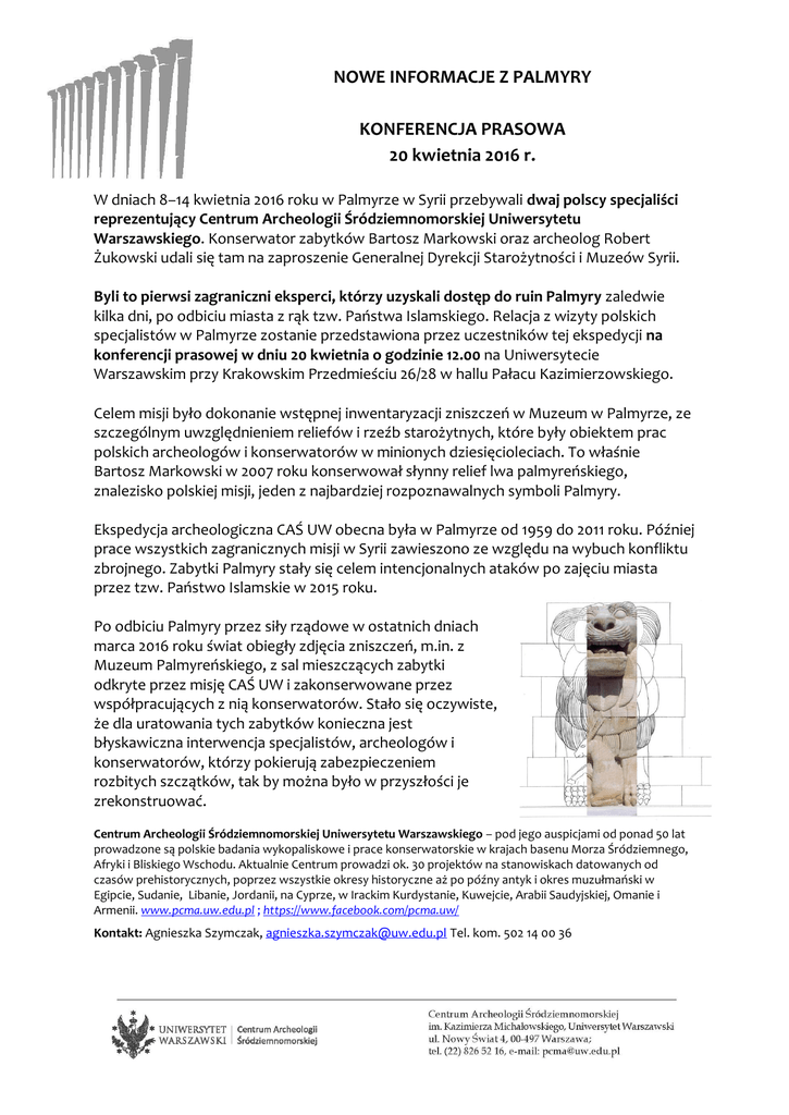 NOWE INFORMACJE Z PALMYRY KONFERENCJA PRASOWA 20 kwietnia 2016 r. W dniach 8–14 kwietnia 2016 roku w Palmyrze w Syrii przebywali dwaj polscy specjaliści reprezentujący Centrum Archeologii Śródziemnomorskiej Uniwersytetu Warszawskiego. Konserwator zabytków Bartosz Markowski oraz archeolog Robert Żukowski udali się tam na zaproszenie Generalnej Dyrekcji Starożytności i Muzeów Syrii. Byli to pierwsi zagraniczni eksperci, którzy uzyskali dostęp do ruin Palmyry zaledwie kilka dni, po odbiciu miasta z rąk tzw. Państwa Islamskiego. Relacja z wizyty polskich specjalistów w Palmyrze zostanie przedstawiona przez uczestników tej ekspedycji na konferencji prasowej w dniu 20 kwietnia o godzinie 12.00 na Uniwersytecie Warszawskim przy Krakowskim Przedmieściu 26/28 w hallu Pałacu Kazimierzowskiego. Celem misji było dokonanie wstępnej inwentaryzacji zniszczeń w Muzeum w Palmyrze, ze szczególnym uwzględnieniem reliefów i rzeźb starożytnych, które były obiektem prac polskich archeologów i konserwatorów w minionych dziesięcioleciach. To właśnie Bartosz Markowski w 2007 roku konserwował słynny relief lwa palmyreńskiego, znalezisko polskiej misji, jeden z najbardziej rozpoznawalnych symboli Palmyry. Ekspedycja archeologiczna CAŚ UW obecna była w Palmyrze od 1959 do 2011 roku. Później prace wszystkich zagranicznych misji w Syrii zawieszono ze względu na wybuch konfliktu zbrojnego. Zabytki Palmyry stały się celem intencjonalnych ataków po zajęciu miasta przez tzw. Państwo Islamskie w 2015 roku. Po odbiciu Palmyry przez siły rządowe w ostatnich dniach marca 2016 roku świat obiegły zdjęcia zniszczeń, m.in. z Muzeum Palmyreńskiego, z sal mieszczących zabytki odkryte przez misję CAŚ UW i zakonserwowane przez współpracujących z nią konserwatorów. Stało się oczywiste, że dla uratowania tych zabytków konieczna jest błyskawiczna interwencja specjalistów, archeologów i konserwatorów, którzy pokierują zabezpieczeniem rozbitych szczątków, tak by można było w przyszłości je zrekonstruować. Centrum Archeologii Śródziemnomorskiej Uniwersytetu Warszawskiego – pod jego auspicjami od ponad 50 lat prowadzone są polskie badania wykopaliskowe i prace konserwatorskie w krajach basenu Morza Śródziemnego, Afryki i Bliskiego Wschodu. Aktualnie Centrum prowadzi ok. 30 projektów na stanowiskach datowanych od czasów prehistorycznych, poprzez wszystkie okresy historyczne aż po późny antyk i okres muzułmański w Egipcie, Sudanie, Libanie, Jordanii, na Cyprze, w Irackim Kurdystanie, Kuwejcie, Arabii Saudyjskiej, Omanie i Armenii. www.pcma.uw.edu.pl ; https://www.facebook.com/pcma.uw/ Kontakt: Agnieszka Szymczak, [email protected] Tel. kom. 502 14 00 36