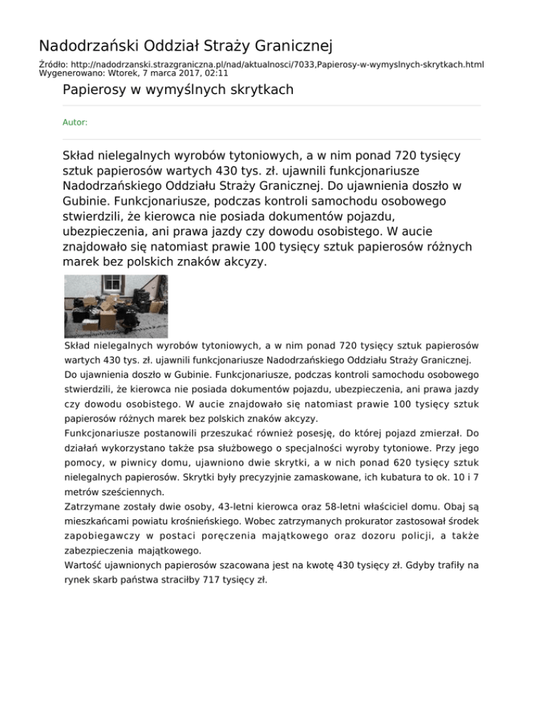 Nadodrzański Oddział Straży Granicznej Źródło: http://nadodrzanski.strazgraniczna.pl/nad/aktualnosci/7033,Papierosy-w-wymyslnych-skrytkach.html Wygenerowano: Wtorek, 7 marca 2017, 02:11 Papierosy w wymyślnych skrytkach Autor: Skład nielegalnych wyrobów tytoniowych, a w nim ponad 720 tysięcy sztuk papierosów wartych 430 tys. zł. ujawnili funkcjonariusze Nadodrzańskiego Oddziału Straży Granicznej. Do ujawnienia doszło w Gubinie. Funkcjonariusze, podczas kontroli samochodu osobowego stwierdzili, że kierowca nie posiada dokumentów pojazdu, ubezpieczenia, ani prawa jazdy czy dowodu osobistego. W aucie znajdowało się natomiast prawie 100 tysięcy sztuk papierosów różnych marek bez polskich znaków akcyzy. Skład nielegalnych wyrobów tytoniowych, a w nim ponad 720 tysięcy sztuk papierosów wartych 430 tys. zł. ujawnili funkcjonariusze Nadodrzańskiego Oddziału Straży Granicznej. Do ujawnienia doszło w Gubinie. Funkcjonariusze, podczas kontroli samochodu osobowego stwierdzili, że kierowca nie posiada dokumentów pojazdu, ubezpieczenia, ani prawa jazdy czy dowodu osobistego. W aucie znajdowało się natomiast prawie 100 tysięcy sztuk papierosów różnych marek bez polskich znaków akcyzy. Funkcjonariusze postanowili przeszukać również posesję, do której pojazd zmierzał. Do działań wykorzystano także psa służbowego o specjalności wyroby tytoniowe. Przy jego pomocy, w piwnicy domu, ujawniono dwie skrytki, a w nich ponad 620 tysięcy sztuk nielegalnych papierosów. Skrytki były precyzyjnie zamaskowane, ich kubatura to ok. 10 i 7 metrów sześciennych. Zatrzymane zostały dwie osoby, 43-letni kierowca oraz 58-letni właściciel domu. Obaj są mieszkańcami powiatu krośnieńskiego. Wobec zatrzymanych prokurator zastosował środek zapobiegawczy w postaci poręczenia majątkowego oraz dozoru policji, a także zabezpieczenia majątkowego. Wartość ujawnionych papierosów szacowana jest na kwotę 430 tysięcy zł. Gdyby trafiły na rynek skarb państwa straciłby 717 tysięcy zł.