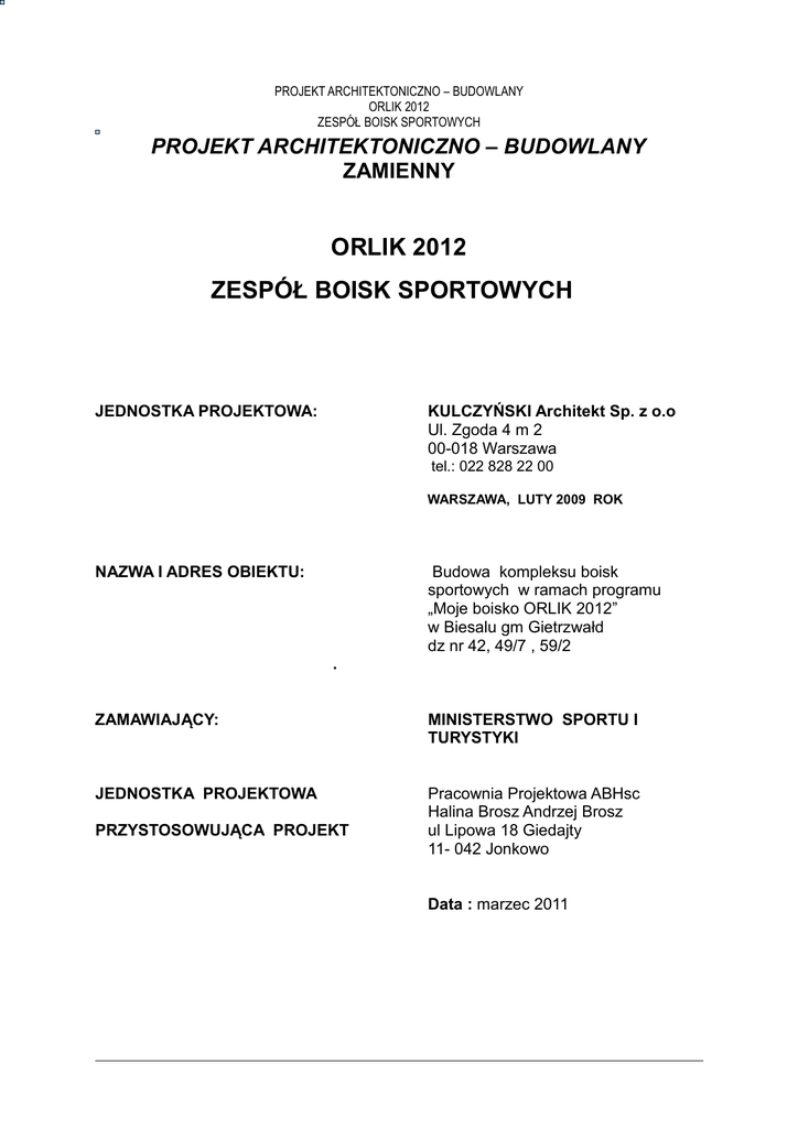 PROJEKT ARCHITEKTONICZNO – BUDOWLANY ORLIK 2012 ZESPÓŁ BOISK SPORTOWYCH PROJEKT ARCHITEKTONICZNO – BUDOWLANY ZAMIENNY ORLIK 2012 ZESPÓŁ BOISK SPORTOWYCH JEDNOSTKA PROJEKTOWA: KULCZYŃSKI Architekt Sp. z o.o Ul. Zgoda 4 m 2 00-018 Warszawa tel.: 022 828 22 00 WARSZAWA, LUTY 2009 ROK NAZWA I ADRES OBIEKTU: Budowa kompleksu boisk sportowych w ramach programu „Moje boisko ORLIK 2012” w Biesalu gm Gietrzwałd dz nr 42, 49/7 , 59/2 . ZAMAWIAJĄCY: MINISTERSTWO SPORTU I TURYSTYKI JEDNOSTKA PROJEKTOWA Pracownia Projektowa ABHsc Halina Brosz Andrzej Brosz ul Lipowa 18 Giedajty 11- 042 Jonkowo PRZYSTOSOWUJĄCA PROJEKT Data : marzec 2011 PROJEKT ARCHITEKTONICZNO – BUDOWLANY ORLIK 2012 ZESPÓŁ BOISK SPORTOWYCH PROJEKT ARCHITEKTONICZNO - BUDOWLANY ZAMIENNY ORLIK 2012 ZESPÓŁ BOISK SPORTOWYCH PROJEKT ARCHITEKTONICZNY PROJEKTANT: arch. Bogdan Kulczyński ST-290/82,MKiS25/AW/W/8,MA-1112 1. arch. Marek Michałowski MA/012/03, MA – 1480 SPRAWDZAJĄCY: arch. Maksymilian Ziółkowski Sw-11/2004, MA- - 1859 PROJEKT ARCHITEKTONICZNO – BUDOWLANY ORLIK 2012 ZESPÓŁ BOISK SPORTOWYCH LOKALIZACJA TERENU OBJĘTEGO OPRACOWANIEM Projekt zawiera zagospodarowanie terenu przeznaczonego pod zabudowę boiskami sportowymi wraz z zapleczem tych boisk. 1. Projektowany stan zagospodarowania terenu, niezbędny do realizacji inwestycji. Przedmiotem inwestycji jest projekt budowy dwóch boisk z budynkiem zaplecza boisk ORLIK 2012. Inwestycja przeznaczona jest do celów wypoczynku, i rekreacji. Zakres inwestycji obejmuje: - budowę – BOISKA DO PIŁKI NOŻNEJ – nawierzchnia trawa syntetyczna piłkarska z ogrodzeniem po obwodzie, - budowę – BOISKA DO KOSZYKÓWKI I SIATKÓWKI – nawierzchnia syntetyczna z ogrodzeniem po obwodzie boiska. - budowę zaplecza boisk - ORLIK 2012 - budowę ciągu komunikacyjnego - budowę oświetlenia boisk z naświetlaczami i instalacją odgromową –budowę – ogrodzenia terenu z bramą wjazdową –budowę ciągu pieszo jezdnego i parkingu –budowę wiaty na drewno / konstrukcja drewniana - budowę infrastruktury technicznej podziemnej – wg opracowania indywidualnego, zgodnie z decyzjami i warunkami miejscowymi Przewiduje się kompleksową realizację przedmiotu inwestycji. 1.1.Część rysunkowa - spis rysunków L.p Tytuł rysunku 1. Projekt zagospodarowania terenu 2. Przekrój P1 3. Elementy ogrodzenia 4. Bramka do piłki nożnej 5. Kosz do koszykówki 6. Słupki do siatkówki Nr rys AR-02-01 AR-03-02 AR-01-03 AR-05-04 AR-05-05 AR-05-06 skala 1:100 1:10 1:20 1:20 1:20 1:20, 1:100 2.DANE LICZBOWE L.p 1. nr 7. opis Powierzchnia objęta opracowaniem : 2. 3. 4. 5. Powierzchnia zabudowy budynku zaplecza boisk Powierzchnia boiska do piłki nożnej Powierzchnia boisk do koszykówki i siatkówki Powierzchnia utwardzona 6. Powierzchnia terenów zielonych obiekt BOISKO DO PIŁKI NOŻNEJ m2 Pow boisk i zaplecza - 4015 pow ciągu pieszo jezdnego , parkingu itd. - 1738 suma: - 5753 101,03 1860 613,11 Przy boiskach 450.oo poza boiskami 990.oo suma : 1440 Przy boiskach - ~745 poza boiskami - ~740 suma : 1485 opis Nawierzchnia z trawy syntetycznej piłkarskiej Powierzchnia całkowita Szerokość Długość Dane liczbowe 1860,00m2 26,00 m+2x2m wybiegi = 30m 56,00m+2x3m wybiegi = 62m PROJEKT ARCHITEKTONICZNO – BUDOWLANY ORLIK 2012 ZESPÓŁ BOISK SPORTOWYCH nr 8. obiekt BOISKO DO KOSZYKÓWKI I SIATKÓWKI opis Nawierzchnia syntetyczna poliuretan Powierzchnia całkowita Szerokość Długość Dane liczbowe 613,11m2 15,10m+2x2m wybiegi=19,10m 28,10m+2x2m wybiegi=32,10m Zagospodarowanie terenu, w tym urządzenia budowlane, układ komunikacyjny, sieci uzbrojenia terenu, z przeciwpożarowym zaopatrzeniem wodny, ukształtowanie terenu i zieleni. Układ komunikacyjny Projektowane ciągi komunikacyjne znajdują się na wewnętrznym terenie objętym opracowaniem, będą służyły jako dojazd i dojście do projektowanych obiektów. Dojazd i dojście do boisk usytuowane jest wzdłuż szkoły , tuż przed wjazdem na teren Orlika zlokalizowano parking dla samochodów osobowych / szczegóły w opracowaniu drogowym/ Sieci uzbrojenia terenu z przeciwpożarowym zaopatrzeniem wodnym Dla potrzeb budowy boisk sportowych wraz z zapleczem, jest podłączenie projektowanej inwestycji do podziemnej sieci uzbrojenia terenu - Sieć wodociągowa – budynek zaplecza sanitarno-szatniowego - Sieć kanalizacyjna sanitarna – budynek zaplecza sanitarno-szatniowego - Sieć elektroenergetyczna – budynek zaplecza sanitarno-szatniowego, oświetlenie boisk - Odwodnienie liniowe boisk Ukształtowanie terenu Teren wymaga makroniwelacji. Wszelkie spadki podłużne projektowane na ciągach komunikacyjnych nie przekraczają 5%, a spadki poprzeczne 2%. Spadki przewidziane w obszarze boisk zgodne są z wytycznymi dla obiektów sportowych. Wyniki badań geotechnicznych oraz kategoria geotechniczna wg opracowania f-my „geoserwis” DANE O ISTNIEJĄCYCH I PRZEWIDYWANYCH CECHACH ZAGROŻENIA DLA ŚRODOWISKA ORAZ HIGIENY I ZDROWIA UŻYTKOWNIKÓW Projektowany obiekt nie ma negatywnego wpływu na środowisko przyrodnicze. Sposób zaopatrzenia budynku w wodę – wg odrębnego opracowania Sposób odprowadzania ścieków – wg odrębnego opracowania Gromadzenie odpadków stałych w kontenerze przy bramie wjazdowej, na terenie opracowania. Sposób dostosowania do krajobrazu i otoczenia ( zabudowy) Zaprojektowany obiekt zaplecza boisk w pełni wpisuje się w istniejący kontekst urbanistyczny . Kolorystyka obiektu – dachówka rudo brązowa , deski elewacji odcienie brązu korzystnie wpisują się w otaczający krajobraz Informacje dotyczące higieny i zdrowia użytkowników Przewidziane jest zaplecze boisk przeznaczone do zabezpieczenia potrzeb higieniczno-sanitarnych użytkowników Informacje dotyczące bezpieczeństwa i zdrowia użytkowników Projektowany obiekt spełnia wymogi bezpieczeństwa i zdrowia użytkowników. Wykładzina syntetyczna i trawiasta boisk jest produktem przeciw urazowym, pod warunkiem użytkowania obiektu 
