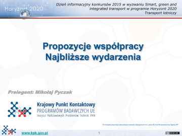 Dzień informacyjny konkursów 2015 w wyzwaniu Smart, green and integrated transport w programie Horyzont 2020 Transport lotniczy Propozycje współpracy Najbliższe wydarzenia Prelegent: Mikołaj Pyczak W niniejszej prezentacji wykorzystano materiały udostępnione m.in. przez KE i/lub Ministerstwa oraz Agendy RP www.kpk.gov.pl 1 Dzień informacyjny konkursów 2015 Spotkania brokerskie ETNA Plus Oficjalny dzień informacyjny KE dla konkursów 2015 w wyzwaniu Smart, Green and Integrated Transport + Spotkania brokerskie (prezentacje + spotkania F2F) organizowane przez sieć NCP Transport (www.transport-ncps.net) Data: 2 luty 2015 Miejsce: Bruksela, Belgia Rejestracja: otwarcie w najbliższych dniach Szczegółowe informacje zostaną przesłane przez KPK drogą emailową. www.kpk.gov.pl 2 Spotkania brokerskie ETNA Plus Wydarzenie odbyło się 13.12.2013 i dotyczyło konkursów 2014-2015 w obszarze Transport w H2020. Materiały są nadal dostępne: 73 prezentacje w sesji brokerskiej Ponad 200 profili instytucji zarejestrowanych na spotkania B2B (zawierają m.in. pomysły na projekty) Dostępne do pobrania ze strony http://www.transport-ncps.net/news/37news-1/presentations-and-b2b-catalogue-from-2014-2015-transport-info-dayand-brokerage-event.html Profile B2B znajdują się również na stronie http://www.b2match.eu/h2020transportcall2014-2015 www.kpk.gov.pl 3 Oferta projektu ETNA Plus Poszukiwanie partnerów Profile instytucji i propozycje projektów. Można składać własne: http://www.transportncps.net/services/partnersearch.html www.kpk.gov.pl 4 Oferta projektu ETNA Plus Baza uczestników projektów Active Participant Identification tool. Baza uczestników projektów PR. www.kpk.gov.pl 5 Oferta projektu ETNA Plus Baza instrumentów finansowych Funding Map Database. Wyszukiwarka instrumentów finansowania współpracy międzynarodowej. www.kpk.gov.pl 6 Oferta projektu ETNA Plus Akademia ETNA Plus • Szkolenia dla koordynatorów projektów z krajów EU13 • Wsparcie w przygotowaniu wniosków projektowych • Szkolenia dla małych grup • Pierwsza Akademia – 14.11.2014 w Bratysławie (20 uczestników w tym 6 z Polski) • Druga akademia – planowana na czerwiec 2015 Informacje dot. terminu i miejsca zostaną opublikowane przez KPK w przyszłym roku. www.kpk.gov.pl 7 Dziękuję za uwagę Pytania? Osoby do kontaktu: Mikołaj Pyczak e-mail: [email protected] ul. Krzywickiego 34 02-078 Warszawa tel: +4822 828 74 83 fax: +4822 828 53 70 e-mail: [email protected] www.kpk.gov.pl 8