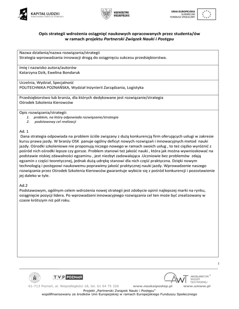 Opis strategii wdrożenia osiągnięć naukowych opracowanych przez studenta/ów w ramach projektu Partnerski Związek Nauki i Postępu Nazwa działania/nazwa rozwiązania/strategii Strategia wprowadzania innowacji drogą do osiągnięciu sukcesu przedsiębiorstwa. Imię i nazwisko autora/autorów Katarzyna Dzik, Ewelina Bondaruk Uczelnia, Wydział, Specjalnośd POLITECHNIKA POZNAŃSKA, Wydział Inżynierii Zarządzania, Logistyka Przedsiębiorstwo lub branża, dla których dedykowane jest rozwiązanie/strategia Ośrodek Szkolenia Kierowców Opis rozwiązania/strategii: 1. 2. problem, na który odpowiada rozwiązanie/strategia podstawowy cel realizacji Ad. 1 Dana strategia odpowiada na problem ściśle związany z dużą konkurencją firm oferujących usługi w zakresie kursu prawa jazdy. W branży OSK panuje ogólny deficyt nowych rozwiązao i innowacyjnych metod nauki jazdy. Ośrodki szkoleniowe nie proponują niczego nowego w ramach swoich usług , to też ciężko wyróżnid z pośród nich ośrodki lepsze czy gorsze. Problem stanowi też jakośd nauki , która jak można wywnioskowad na podstawie niskiej zdawalności egzaminu , jest niezbyt zadowalająca .Uczniowie bez problemów zdają egzamin z części teoretycznej, jednak dużą udrękę stanowi dla nich częśd praktyczna. Dzięki nowym technologią i postępowi naukowemu poprawimy jakośd praktycznej nauki jazdy. Wprowadzenie naszego rozwiązania przez Ośrodek Szkolenia Kierowców gwarantuje wybicie się z pośród konkurencji i pozostawienie jej daleko w tyle. Ad.2 Podstawowym, ogólnym celem wdrożenia nowej strategii jest zdobycie opinii najlepszej marki na rynku, osiągnięcie pozycji lidera. Po wprowadzeni innowacyjnego rozwiązania cel ten może byd zrealizowany w czasie krótszym niż pół roku. 1 61-713 Poznań, al. Niepodległości 18, tel. 61 64 75 326 www.naukaipostep.pl www.umww.pl Projekt „Partnerski Związek Nauki i Postępu” współfinansowany ze środków Unii Europejskiej w ramach Europejskiego Funduszu Społecznego Elementy innowacyjne rozwiązania/strategii (jeśli istnieją) Rozwiązanie, które proponujemy stanowi całkowitą innowację na rynku danej branży. Naszą propozycją są sale, w których odbywad się będą praktyczne lekcje nauki jazdy, nie wymagające instruktora, pojazdu ani infrastruktury drogowej. Nauka odbywa się na zasadzie symulacji jazdy w wirtualnym świecie, wiernie odwzorowującym warunki panujące na drodze. Kursant wchodzi do specjalnie zaprogramowanego auta, które znajduje sie na środku sali i „rusza w podróż”. Samochód jest specjalnie zintegrowany ze ścianami sal, które odzwierciedlają realne otoczenie ruchu drogowego i konsekwencje działao kursanta w pojeździe. Osoba odbywająca kurs może w ten sposób uczyd się zachowao na drodze w praktyce, bez nerwów i stresów wywołanych obecnością instruktora i także obawą spowodowania wypadku. Jest to całkowicie innowacyjna metoda nauki jazdy. Nikt do tej pory nie zaproponował podobnego pomysłu, odnoszącego się do praktycznej nauki jazdy. Na rynku możemy znaleźd wiele rozwiązao dotyczących teoretycznej nauki jazdy w formie programu komputerowych. Jednak to praktyczna umiejętnośd nauki jazdy jest najważniejsza dla przyszłego kierowcy. Spodziewane korzyści dla przedsiębiorstwa wdrażającego rozwiązanie/strategię Wdrożenie danej innowacji w program usług nauki jazdy gwarantuje odniesienie sukcesu. Jest to bardzo atrakcyjna oferta dla klienta, gdyż monotonna konkurencja nie jest wstanie zapewnid nic ciekawszego. Przedsiębiorstwo, które wykorzysta nasz pomysł na pewno może pretendowad do roli lidera na rynku, jako groźny konkurent, posiadający atrakcyjną ofertę dla klienta. Wysoka pozycja marki pozwoli na szybkie i znaczne zwiększenie zysków przedsiębiorstwa, a dzięki temu możliwośd wdrażania kolejnych nowinek technicznych i poprawę jakości usług. Taki łaocuch przyczynowoskutkowy nie pozwoli konkurencji na próbę wali o pozycje lidera. Wysoki procent zdawalności uzyskany wdrożeniu innowacyjnej strategii stanie się reklamą marki, która przyciągnie nowych klientów. 2 61-713 Poznań, al. Niepodległości 18, tel. 61 64 75 326 www.naukaipostep.pl www.umww.pl Projekt „Partnerski Związek Nauki i Postępu” współfinansowany ze środków Unii Europejskiej w ramach Europejskiego Funduszu Społecznego