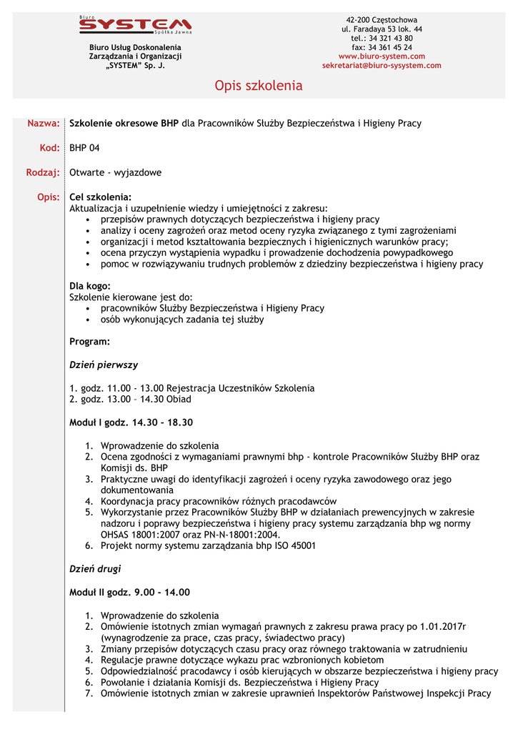 42-200 Częstochowa ul. Faradaya 53 lok. 44 tel.: 34 321 43 80 fax: 34 361 45 24 www.biuro-system.com [email protected] Biuro Usług Doskonalenia Zarządzania i Organizacji „SYSTEM” Sp. J. Opis szkolenia Nazwa: Szkolenie okresowe BHP dla Pracowników Służby Bezpieczeństwa i Higieny Pracy Kod: BHP 04 Rodzaj: Otwarte - wyjazdowe Opis: Cel szkolenia: Aktualizacja i uzupełnienie wiedzy i umiejętności z zakresu: • przepisów prawnych dotyczących bezpieczeństwa i higieny pracy • analizy i oceny zagrożeń oraz metod oceny ryzyka związanego z tymi zagrożeniami • organizacji i metod kształtowania bezpiecznych i higienicznych warunków pracy; • ocena przyczyn wystąpienia wypadku i prowadzenie dochodzenia powypadkowego • pomoc w rozwiązywaniu trudnych problemów z dziedziny bezpieczeństwa i higieny pracy Dla kogo: Szkolenie kierowane jest do: • pracowników Służby Bezpieczeństwa i Higieny Pracy • osób wykonujących zadania tej służby Program: Dzień pierwszy 1. godz. 11.00 - 13.00 Rejestracja Uczestników Szkolenia 2. godz. 13.00 – 14.30 Obiad Moduł I godz. 14.30 - 18.30 1. Wprowadzenie do szkolenia 2. Ocena zgodności z wymaganiami prawnymi bhp - kontrole Pracowników Służby BHP oraz Komisji ds. BHP 3. Praktyczne uwagi do identyfikacji zagrożeń i oceny ryzyka zawodowego oraz jego dokumentowania 4. Koordynacja pracy pracowników różnych pracodawców 5. Wykorzystanie przez Pracowników Służby BHP w działaniach prewencyjnych w zakresie nadzoru i poprawy bezpieczeństwa i higieny pracy systemu zarządzania bhp wg normy OHSAS 18001:2007 oraz PN-N-18001:2004. 6. Projekt normy systemu zarządzania bhp ISO 45001 Dzień drugi Moduł II godz. 9.00 - 14.00 1. Wprowadzenie do szkolenia 2. Omówienie istotnych zmian wymagań prawnych z zakresu prawa pracy po 1.01.2017r (wynagrodzenie za prace, czas pracy, świadectwo pracy) 3. Zmiany przepisów dotyczących czasu pracy oraz równego traktowania w zatrudnieniu 4. Regulacje prawne dotyczące wykazu prac wzbronionych kobietom 5. Odpowiedzialność pracodawcy i osób kierujących w obszarze bezpieczeństwa i higieny pracy 6. Powołanie i działania Komisji ds. Bezpieczeństwa i Higieny Pracy 7. Omówienie istotnych zmian w zakresie uprawnień Inspektorów Państwowej Inspekcji Pracy Moduł III godz. 15.00 - 18.30 1. Gaszenie pożarów i ewakuacja pracowników. - Podstawy prawne ochrony ppoż, sposoby alarmowania, ostrzegania i postępowania przy zaistnieniu pożaru lub innych zagrożeń. Zasady bezpiecznej ewakuacji i drogi ewakuacyjne, 2. Zasady postępowania w razie wypadku w czasie pracy i w sytuacjach zagrożeń – udzielenie pierwszej pomocy pracy 3. Organizacja i metodyka szkolenia w zakresie bezpieczeństwa i higieny pracy Dzień trzeci Moduł IV godz. 9.00 - 12.00 1. Zmiany przepisów branżowych na dzień 01.01.2017 dotyczących bezpieczeństwa i higieny 2. Ogólne wymagania bhp dla stanowisk, obiektów, maszyn i urządzeń - kontrola zagadnień bezpieczeństwa i higieny pracy 3. Prace szczególnie niebezpiecznych. 4. Substancje chemiczne, ich mieszaniny, czynniki lub procesy technologiczne o działaniu rakotwórczym lub mutagennym w środowisku pracy Moduł V godz. 12.00 - 14.30 1. Badanie i ustalanie okoliczności i przyczyn wypadków przy pracy: 1. Wypadek ciężki, zbiorowy, śmiertelny – definicje 2. Obowiązki pracodawcy po zaistnieniu wypadków ciężkich, zbiorowych lub śmiertelnych 3. Obowiązki zespołów powypadkowych Dzień czwarty Moduł V c.d. godz. 8.30 - 13.30 1. Omówienie przykładowych wypadków przy pracy wraz z analizą ich przyczyn i okoliczności (studium przypadków - ćwiczenia) 2. Przedstawienie najczęściej powtarzanych błędów w prowadzeniu dokumentacji powypadkowej 3. Działania prewencyjne w zakresie ograniczania wypadków przy pracy 4. Nowoczesne rozwiązania techniczno-organizacyjne wpływające na poprawę bezpieczeństwa i higieny pracy – dobór środków organizacyjnych i ochronnych Egzamin Godz. 13.30 Obiad i WYJAZD Uwaga : Organizator zastrzega możliwość zmiany kolejności wykładów w programie szkolenia Zalecenia: Aktualne uprawnienia Technika Bezpieczeństwa, Inspektora i/lub Specjalisty BHP Trenerzy: Jarosław Uhornicki - nadinspektor pracy – koordynator zespołu samodzielnych stanowisk ds. nadzoru i kontroli, Państwowej Inspekcji Pracy – Okręgowego Inspektoratu Pracy we Wrocławiu. Wykładowca Ośrodka Szkolenia Państwowej Inspekcji Pracy we Wrocławiu w zakresie prawa pracy w tym bezpieczeństwa i higieny pracy oraz wypadków przy pracy. Od 2005 roku wykładowca Biura Usług Doskonalenia Zarządzania i Organizacji SYSTEM Sp.J. w zakresie prawa pracy, zadań i obowiązków pracowników Służby BHP i SIP, wypadków przy pracy w tym wypadków ciężkich i śmiertelnych. Pelagia Piega - wykładowca i doradca w zakresie Prawa Pracy w Wyższej Szkole Zarządzania Marketingowego i Języków Obcych w Katowicach oraz Wyższej Szkole "HUMANITAS" w Sosnowcu. Ławnik Sądu Rejonowego - Sądu Pracy w Sosnowcu. Do 2005 r. inspektor pracy - główny specjalista Państwowej Inspekcji Pracy -Okręgowego Inspektoratu Pracy w Katowicach. Dariusz Okraska – Specjalista ds. bhp, wykładowca i praktyk z zakresu bezpieczeństwa i higieny pracy, Członek Zarządu Oddziału w Częstochowie Ogólnopolskiego Stowarzyszenia Pracowników Służby BHP. Auditor jednostki certyfikującej DAS Certification Ltd. i DAS Polska. Konsultant i trener w zakresie systemu zarządzania BHP wg norm OHSAS 18001 i PN-N 18001, systemu zarządzania jakością wg normy ISO 9001 oraz systemu zarządzania środowiskowego wg normy ISO 14001. Uczestnik programu Komisji Europejskiej LEONARDO DA VINCI dot. projektu "Zarządzanie bezpieczeństwem pracy w aspekcie integracji polskiego i europejskiego hutnictwa" oraz Strategicznego Programu Rządowego pt. "Bezpieczeństwo i ochrona zdrowia człowieka w środowisku pracy". Współautor publikacji Verlag Dashoffer Seria ISO - nowoczesne zarządzanie f