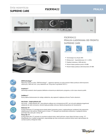linia wzornicza SUPREME CARE FSCR90422 PRALKA FSCR90422 PRALKA ŁADOWANA OD FRONTU SUPREME CARE • • • • • Technologia 6-ty Zmysł: ZEN Efektywność - Superdeklaracja: A+++ (-20%) Prędkość obrotowa: 1400 obr/min Poziom hałasu podczas prania: 49 dBA Poziom hałasu podczas odwirowywania: 69 dBA ZENTechnology™ Najcichszy silnik na rynku. ZENTechnology™ - zapewnia najniższy na rynku poziom hałasu podczas odwirowywania nawet przy 1400 obr./min., przy załadunku do 10 kg (stan na grudzień 2014 r.). FreshCare™ Zachowuje świeżość ubrań poprzez delikatne wirowanie po zakończeniu programu, aż do czasu otwarcia pralki. SoftMove™ Ruchy bębna dostosowane do rodzaju załadunku, aby zapewnić najlepszą ochronę Twoim ubraniom. Hot Finish - Ciepłe płukanie 40° Hot Finish - Ciepłe płukanie 40°. Faza płukania odbywa się w temperaturze 40°C, po to by jak najlepiej przygotować załadunek do cyklu wirowania. Ubrania będą posiadały wówczas idealną temperaturę do rozwieszenia. Kolorowe 15° Funkcja Kolorowe 15° pomaga jeszcze lepiej dobrać parametry prania i zoptymalizować wydajność dla programów dedykowanych dla kolorów. Dzięki praniu w temp. 15° detergent jest doskonale wchłaniany, a wydajność prania pozostaje taka sama jak w temp. 40° Plamy Bio 15° Funkcja Plamy Bio 15° pozwala na usunięcie trudnych plam, takich jak krew, trawa, błoto lub kawa w temp. 15°. Współdziała ona z każdym programem, poprzedzając go fazą namaczania, podczas której nawet najtrudniejsze do usunięcia plamy znikają bez śladu. PRALKA linia wzornicza SUPREME CARE OZNACZENIE MODELU EAN FSCR90422 FSCR90422 8003437261152 12nc 859204049010 Linia wzornicza SUPREME CARE DANE TECHNICZNE Technologia 6-ty Zmysł Wyświetlacz ZEN TAK - dotykowy Sterowanie Opisy na panelu Elektroniczne Prędkość obrotowa Pojemność pralki 1400 obr/min Poziom hałasu podczas prania Poziom hałasu podczas odwirowywania Język polski 9 kg 49 dBA 69 dBA ENERGIA Klasa efektywności energetycznej Efektywność - Superdeklaracja Klasa efektywności prania Klasa efektywności odwirowania Szacunkowe roczne zużycie energii Szacunkowe roczne zużycie wody A+++ A+++ (-20%) A B 174 kWh / rok 10500 l/rok PRANIE Liczba programów Czas prania przy pełnym załadowaniu - 2010/30/EC 10 360 min Bawełniane Syntetyczne • Wełniane Mieszane • Delikatne ECO Szybki 30 Super szybki 15 • • • eBawełniane • - CECHY SZCZEGÓLNE 6th Sense Live Intuicyjny panel - • Precision Clean Precision Dose - System zarządzania detergentem Opóźnienie startu • Soft Move Zabezpieczenie przed zalaniem • Fresh Care Rodzaj silnika • DIRECT DRIVE Eco Monitor Kolorowe 15 • Plamy BIO WYMIARY - • - - • Wysokość produktu Szerokość produktu 850 mm Głębokość produktu Ciężar netto 640 mm 595 mm 85 kg
