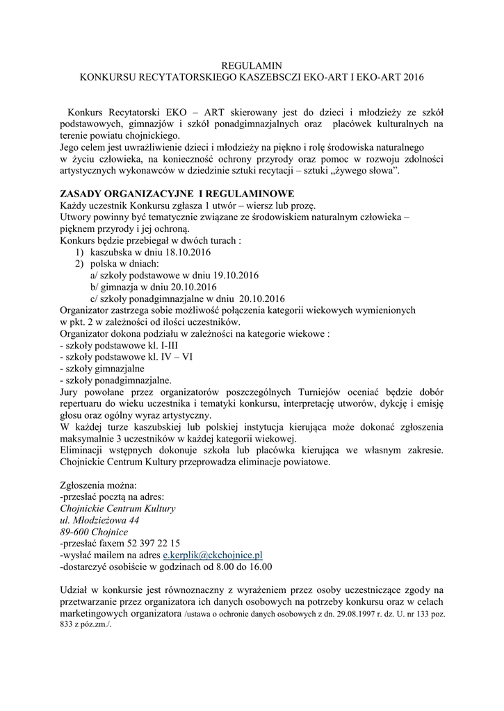 REGULAMIN KONKURSU RECYTATORSKIEGO KASZEBSCZI EKO-ART I EKO-ART 2016 Konkurs Recytatorski EKO – ART skierowany jest do dzieci i młodzieży ze szkół podstawowych, gimnazjów i szkół ponadgimnazjalnych oraz placówek kulturalnych na terenie powiatu chojnickiego. Jego celem jest uwrażliwienie dzieci i młodzieży na piękno i rolę środowiska naturalnego w życiu człowieka, na konieczność ochrony przyrody oraz pomoc w rozwoju zdolności artystycznych wykonawców w dziedzinie sztuki recytacji – sztuki „żywego słowa”. ZASADY ORGANIZACYJNE I REGULAMINOWE Każdy uczestnik Konkursu zgłasza 1 utwór – wiersz lub prozę. Utwory powinny być tematycznie związane ze środowiskiem naturalnym człowieka – pięknem przyrody i jej ochroną. Konkurs będzie przebiegał w dwóch turach : 1) kaszubska w dniu 18.10.2016 2) polska w dniach: a/ szkoły podstawowe w dniu 19.10.2016 b/ gimnazja w dniu 20.10.2016 c/ szkoły ponadgimnazjalne w dniu 20.10.2016 Organizator zastrzega sobie możliwość połączenia kategorii wiekowych wymienionych w pkt. 2 w zależności od ilości uczestników. Organizator dokona podziału w zależności na kategorie wiekowe : - szkoły podstawowe kl. I-III - szkoły podstawowe kl. IV – VI - szkoły gimnazjalne - szkoły ponadgimnazjalne. Jury powołane przez organizatorów poszczególnych Turniejów oceniać będzie dobór repertuaru do wieku uczestnika i tematyki konkursu, interpretację utworów, dykcję i emisję głosu oraz ogólny wyraz artystyczny. W każdej turze kaszubskiej lub polskiej instytucja kierująca może dokonać zgłoszenia maksymalnie 3 uczestników w każdej kategorii wiekowej. Eliminacji wstępnych dokonuje szkoła lub placówka kierująca we własnym zakresie. Chojnickie Centrum Kultury przeprowadza eliminacje powiatowe. Zgłoszenia można: -przesłać pocztą na adres: Chojnickie Centrum Kultury ul. Młodzieżowa 44 89-600 Chojnice -przesłać faxem 52 397 22 15 -wysłać mailem na adres [email protected] -dostarczyć osobiście w godzinach od 8.00 do 16.00 Udział w konkursie jest równoznaczny z wyrażeniem przez osoby uczestniczące zgody na przetwarzanie przez organizatora ich danych osobowych na potrzeby konkursu oraz w celach marketingowych organizatora /ustawa o ochronie danych osobowych z dn. 29.08.1997 r. dz. U. nr 133 poz. 833 z póz.zm./. Organizatorzy : - Chojnickie Centrum Kultury - Urząd Miejski w Chojnicach - Zrzeszenie Kaszubsko – Pomorskie Oddział Chojnice