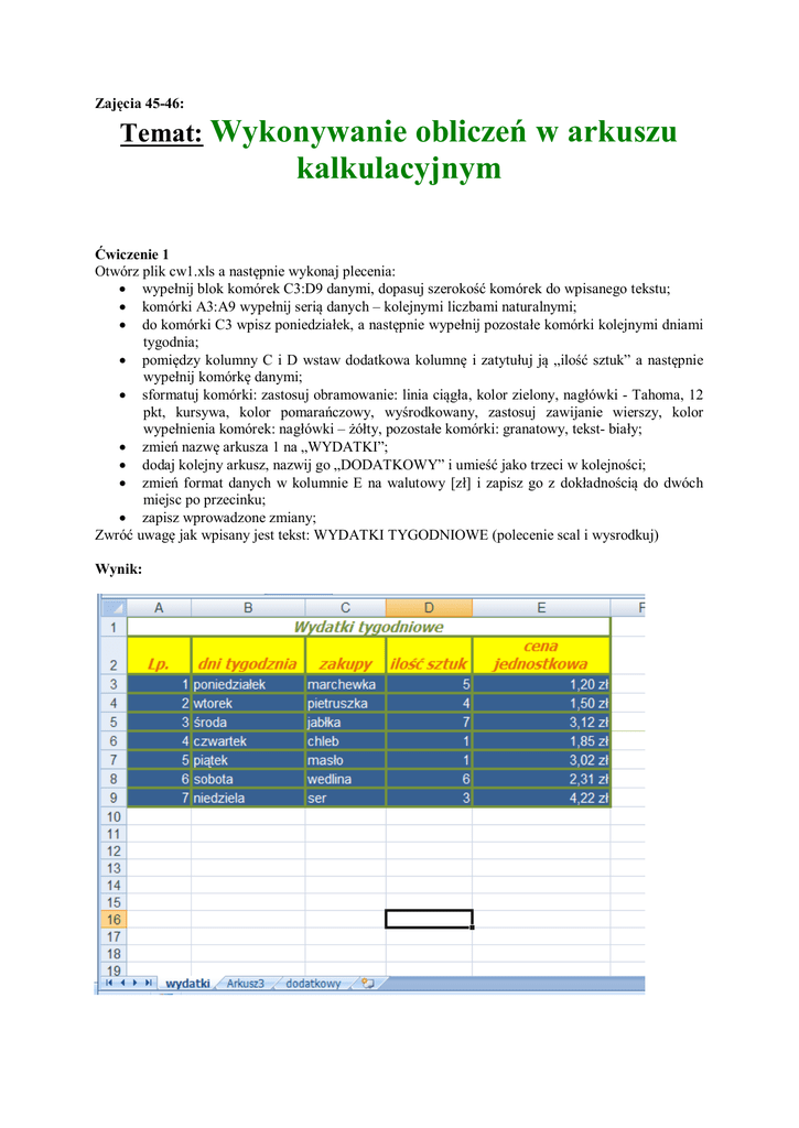 Zajęcia 45-46: Temat: Wykonywanie obliczeń w arkuszu kalkulacyjnym Ćwiczenie 1 Otwórz plik cw1.xls a następnie wykonaj plecenia: • wypełnij blok komórek C3:D9 danymi, dopasuj szerokość komórek do wpisanego tekstu; • komórki A3:A9 wypełnij serią danych – kolejnymi liczbami naturalnymi; • do komórki C3 wpisz poniedziałek, a następnie wypełnij pozostałe komórki kolejnymi dniami tygodnia; • pomiędzy kolumny C i D wstaw dodatkowa kolumnę i zatytułuj ją „ilość sztuk” a następnie wypełnij komórkę danymi; • sformatuj komórki: zastosuj obramowanie: linia ciągła, kolor zielony, nagłówki - Tahoma, 12 pkt, kursywa, kolor pomarańczowy, wyśrodkowany, zastosuj zawijanie wierszy, kolor wypełnienia komórek: nagłówki – żółty, pozostałe komórki: granatowy, tekst- biały; • zmień nazwę arkusza 1 na „WYDATKI”; • dodaj kolejny arkusz, nazwij go „DODATKOWY” i umieść jako trzeci w kolejności; • zmień format danych w kolumnie E na walutowy [zł] i zapisz go z dokładnością do dwóch miejsc po przecinku; • zapisz wprowadzone zmiany; Zwróć uwagę jak wpisany jest tekst: WYDATKI TYGODNIOWE (polecenie scal i wysrodkuj) Wynik: Ćwiczenie 2 Utwórz następujący arkusz: W polach C2: G2 wpisz formuły realizujące odpowiednie działania na podstawie argumentów z komórek A2 i B2. Ćwiczenie 3 W komórce F2 wpisz: „WYDATKI OGÓŁEM”. Stosując adresowanie względne, w komórkach F3, F4, F5...F10, oblicz wartość (cena jednostkowa * ilość sztuk) kolejnych produktów. Zachowaj zmiany. Ćwiczenie 4 Sprawdź w internecie ile wynosi kurs euro i wpisz wartość do komórki B12. W komórkach G3:G9 policz wartość towaru w euro, stosując adresowanie bezwzględne. Zmień kurs euro i zaobserwuj co się stało? Ćwiczenie 5 Otwórz plik cw2.xls a następnie wykonaj plecenia: 1. W komórce E2 wpisz „ Cena Sprzedaży”, a następnie oblicz cenę sprzedaży dla każdego towaru: cena sprzedaży jest o 15% wyższa od ceny zakupu; 2. W komórce F2 wpisz „ Wartość”, a następnie oblicz wartość towarów w cenie zakupu: wartość to cena sprzedaży * ilość; 3. Obliczyć wartość towarów w cenie sprzedaży; 4. W komórce G2 wpisz „ Zysk”, a następnie obliczyć zysk jaki właściciel sklepu osiągnie po sprzedaży wszystkich towarów: suma=(wartość –(ilość *cena)) 5. Obliczyć średnią cenę sprzedaży towarów w hurtowni;