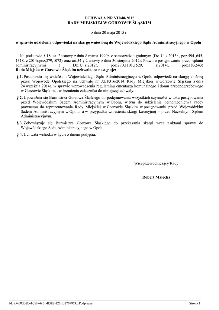 UCHWAŁA NR VII/48/2015 RADY MIEJSKIEJ W GORZOWIE ŚLĄSKIM z dnia 20 maja 2015 r. w sprawie udzielenia odpowiedzi na skargę wniesioną do Wojewódzkiego Sądu Administracyjnego w Opolu Na podstawie § 18 ust. 2 ustawy z dnia 8 marca 1990r. o samorządzie gminnym (Dz. U. z 2013r., poz.594.,645, 1318, z 2014r.poz.379,1072) oraz art.54 § 2 ustawy z dnia 30 sierpnia 2012r. Prawo o postępowaniu przed sądami administracyjnymi ( Dz. U. z 2012r. poz.270,1101,1529, z 2014r. poz.183,543) Rada Miejska w Gorzowie Śląskim uchwala, co następuje: § 1. Postanawia się wnieść do Wojewódzkiego Sądu Administracyjnego w Opolu odpowiedź na skargę złożoną przez Wojewodę Opolskiego na uchwałę nr XLI/316/2014 Rady Miejskiej w Gorzowie Śląskim z dnia 24 września 2014r. w sprawie wprowadzenia regulaminu cmentarza komunalnego i domu przedpogrzebowego w Gorzowie Śląskim, , w brzmieniu załącznika do niniejszej uchwały. § 2. Upoważnia się Burmistrza Gorzowa Śląskiego do podejmowania wszystkich czynności w toku postępowania przed Wojewódzkim Sądem Administracyjnym w Opolu, w tym do udzielenia pełnomocnictwa radcy prawnemu do reprezentowania Rady Miejskiej w Gorzowie Śląskim w postępowaniu przed Wojewódzkim Sadem Administracyjnym w Opolu, a w przypadku wniesienia skargi kasacyjnej – przed Naczelnym Sądem Administracyjnym. § 3. Zobowiązuje się Burmistrza Gorzowa Śląskiego do przekazania skargi wraz z aktami sprawy do Wojewódzkiego Sadu Administracyjnego w Opolu. § 4. Uchwała wchodzi w życie z dniem podjęcia. Wiceprzewodniczący Rady Robert Malecha Id: 954DCD2D-1C8F-4961-B3E8-126FB27098CC. Podpisany Strona 1 Załącznik do Uchwały Nr VII/48/2015 Rady Miejskiej w Gorzowie Śląskim z dnia 20 maja 2015 r. Wojewódzki Sąd Administracyjny w Opolu ul. Kośnego 70 45-372 Opole Odpowiedź na skargę UZASADNIENIE Skarżący: Wojewoda Opolski, ul .Piastowska 14, 45-082 Opole Strona przeciwna : Gmina Gorzów Śląski, ul Wojska Polskiego 15 46-310 Gorzów Śląski Odpowiedź na skargę W odpowiedzi na skargę Wojewody Opolskiego, doręczoną Gminie Gorzów Śląski w dniu 15 maja 2015r. na nieważność uchwały nr XLI/316/2014 Rady Miejskiej w Gorzowie Śląskim z dnia 24 września 2014r. w sprawie wprowadzenia regulaminu cmentarza komunalnego i domu przedpogrzebowego w Gorzowie Śląskim w części dotyczącej § 4 ust.1 i 2, § 5 ust.1 i § 10 ust.3 i 6, strona przeciwna działając na podstawie art. 54 § 2 i art.151 ustawy z dnia 30 sierpnia 2002r. Prawo przed sądami administracyjnymi ( Dz. U. z 2012r. poz. 270 z późn. zmianami) wnosi o oddalenie skargi jako bezzasadnej. UZASADNIENIE Rozstrzygnięciem nadzorczym z dnia 31 października 2014r.Wojewoda Opolski stwierdził nieważność zapisów uchwały nr XLI/316/2014 Rady Miejskiej w Gorzowie Śląskim z dnia 24 września 2014r. w sprawie wprowadzenia regulaminu cmentarza komunalnego i domu przedpogrzebowego w Gorzowie Śląskim w części dotyczącej § 4. ust.1i ust.2, § 5 ust.1 i § 10 ust.3 i 6 Na powyższe rozstrzygnięcie nadzorcze Gmina Gorzów Śląski złożyła skargę do Wojewódzkiego Sądu Administracyjnego w Opolu, w wyniku której, na mocy wydanego wyroku w dniu 19 stycznia 2015r. rozstrzygnięcie nadzorcze zostało uchylone przez NSA z powodu istotnej wady o charakterze formalno-prawnym (Sygn. akt II SA/Op 623/14). Ustosunkowując się merytorycznie do podniesionych zarzutów w skardze Wojewody Opolskiego, nie sposób zgodzić się z argumentacją organu nadzoru, iż Gmina Gorzów Śląski nie jest uprawniona do wprowadzenia uregulowań w regulaminie w zakresie odpowiedzialności m.in. za szkody na grobach, za rzeczy pozostawione bez nadzoru § 4 ust.1 jak również przenosić odpowiedzialność za utrzymanie w należytym stanie technicznym grobów, przestrzeni między nimi, oraz miejsc rezerwowanych odpowiednio na rzecz rodziny zmarłego, innego opiekuna grobu lub osoby, która dokonała rezerwacji miejsca. ust.2 Zarzut, iż § 5 ust.1 Na terenie cmentarza zabrania się : 1) zakłócania ciszy, porządku i powagi miejsca; 2) zaśmiecania oraz wysypywania odpadów( w tym liści i odpadów zielonych, poza pojemnikami i miejscami do tego przeznaczonymi; 3) niszczenia zieleni i urządzeń cmentarnych, nagrobków itp.; 4) przebywania w stanie nietrzeźwym i spożywania alkoholi; 5) wprowadzania zwierząt; Id: 954DCD2D-1C8F-4961-B3E8-126FB27098CC. Podpisany Strona 1 6) prowadzenia akwizycji i reklamy, rozkładania wizytówek na grobach itp.; 7) prowadzenia działalności handlowej,; 8) wysypywania soli ( NaCL, CaCl,i tp.) przy grobach, przejściach i alejach jest powtórzeniem treści art.145 kodeksu wykroczeń, również nie znajduje uzasadnienia cyt:” kto zanieczyszcza lub zaśmieca miejsca dostępne dla publiczności, a w szczególności drogę, ulicę, plac, ogród, trawnik lub zieleniec, podlega karze grzywny do 500 zł albo karze nagany.” Cmentarz to miejsce szczególne – cmentarz to przestrzeń publiczna, najczęściej ogrodzona, gdzie odwiedzających groby trudno nazwać publicznością. § 10. ust.3 Regulaminu cmentarza zakwestionowany przez organ nadzoru ,iż ustawienie nagrobka odbywa się na podstawie zezwolenia wydanego przez Administratora na wniosek zainteresowanych, złożony na co najmniej dwa dni robocze przed planowanym terminem ustawiania nagrobka, trudno nazwać istotnym naruszeniem prawa. Intencją uchwałodawcy było wprowadzenie takich zapisów w regulaminie w celu uregulowania spraw związanych z budową nagrobków na istniejących mogiłach i tym samym wyeliminowania samowoli oraz nieprawidłowości w tym zakresie. Uregulowania te w żaden sposób nie ograniczają prawa do wykupionego miejsca grzebalnego, lecz jedynie porządkują sposób ich zagospodarowania . Brak takich uregulowań w przeszłości skutkował odpowiedzialnością cywilną i w konsekwencji wypłatą odszkodowania za brak nadzoru nad prawidłowym ustawieniem nagrobka.( sygn. akt. (wyrok sądu Okręgowego w