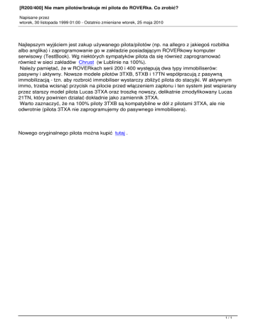 [R200/400] Nie mam pilotów/brakuje mi pilota do ROVERka. Co zrobić? Napisane przez wtorek, 30 listopada 1999 01:00 - Ostatnio zmieniane wtorek, 25 maja 2010 Najlepszym wyjściem jest zakup używanego pilota/pilotów (np. na allegro z jakiegoś rozbitka albo anglika) i zaprogramowanie go w zakładzie posiadającym ROVERkowy komputer serwisowy (TestBook). Wg niektórych sympatyków pilota da się również zaprogramować również w sieci zakładów Chrust (w Lublinie na 100%). Należy pamiętać, że w ROVERkach serii 200 i 400 występują dwa typy immobiliserów: pasywny i aktywny. Nowsze modele pilotów 3TXB, 5TXB i 17TN współpracują z pasywną immobilizacją - tzn. aby rozbroić immobiliser wystarczy zbliżyć pilota do stacyjki. W aktywnym immo, trzeba wcisnąć przycisk na pilocie przed włączeniem zapłonu i ten system jest wspierany przez starszy model pilota Lucas 3TXA oraz troszkę nowszy, delikatnie zmodyfikowany Lucas 21TN, który powinien działać dokładnie jako zamiennik 3TXA. Warto zaznaczyć, że na 100% piloty 3TXB są kompatybilne w dół z pilotami 3TXA, ale nie odwrotnie (pilota 3TXA nie zaprogramujemy do pasywnego immobilisera). Nowego oryginalnego pilota można kupić tutaj . 1/1