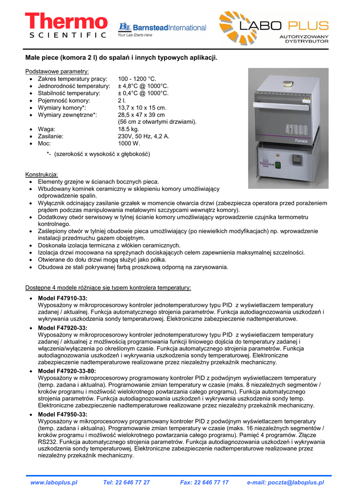 Małe piece (komora 2 l) do spalań i innych typowych aplikacji. Podstawowe parametry: Zakres temperatury pracy: Jednorodność temperatury: Stabilność temperatury: Pojemność komory: Wymiary komory*: Wymiary zewnętrzne*: Waga: Zasilanie: Moc: 100 - 1200 °C. ± 4,8°C @ 1000°C. ± 0,4°C @ 1000°C. 2 l. 13,7 x 10 x 15 cm. 28,5 x 47 x 39 cm (56 cm z otwartymi drzwiami). 18.5 kg. 230V, 50 Hz, 4,2 A. 1000 W. *- (szerokość x wysokość x głębokość) Konstrukcja: Elementy grzejne w ścianach bocznych pieca. Wbudowany kominek ceramiczny w sklepieniu komory umożliwiający odprowadzenie spalin. Wyłącznik odcinający zasilanie grzałek w momencie otwarcia drzwi (zabezpiecza operatora przed porażeniem prądem podczas manipulowania metalowymi szczypcami wewnątrz komory). Dodatkowy otwór serwisowy w tylnej ścianie komory umożliwiający wprowadzenie czujnika termometru kontrolnego. Zaślepiony otwór w tylniej obudowie pieca umożliwiający (po niewielkich modyfikacjach) np. wprowadzenie instalacji przedmuchu gazem obojętnym. Doskonała izolacja termiczna z włókien ceramicznych. Izolacja drzwi mocowana na sprężynach dociskających celem zapewnienia maksymalnej szczelności. Otwierane do dołu drzwi mogą służyć jako półka. Obudowa ze stali pokrywanej farbą proszkową odporną na zarysowania. Dostępne 4 modele różniące się typem kontrolera temperatury: Model F47910-33: Wyposażony w mikroprocesorowy kontroler jednotemperaturowy typu PID z wyświetlaczem temperatury zadanej / aktualnej. Funkcja automatycznego strojenia parametrów. Funkcja autodiagnozowania uszkodzeń i wykrywania uszkodzenia sondy temperaturowej. Elektroniczne zabezpieczenie nadtemperaturowe. Model F47920-33: Wyposażony w mikroprocesorowy kontroler jednotemperaturowy typu PID z wyświetlaczem temperatury zadanej / aktualnej z możliwością programowania funkcji liniowego dojścia do temperatury zadanej i włączenia/wyłączenia po określonym czasie. Funkcja automatycznego strojenia parametrów. Funkcja autodiagnozowania uszkodzeń i wykrywania uszkodzenia sondy temperaturowej. Elektroniczne zabezpieczenie nadtemperaturowe realizowane przez niezależny przekaźnik mechaniczny. Model F47920-33-80: Wyposażony w mikroprocesorowy programowany kontroler PID z podwójnym wyświetlaczem temperatury (temp. zadana i aktualna). Programowanie zmian temperatury w czasie (maks. 8 niezależnych segmentów / kroków programu i możliwość wielokrotnego powtarzania całego programu). Funkcja automatycznego strojenia parametrów. Funkcja autodiagnozowania uszkodzeń i wykrywania uszkodzenia sondy temp. Elektroniczne zabezpieczenie nadtemperaturowe realizowane przez niezależny przekaźnik mechaniczny. Model F47950-33: Wyposażony w mikroprocesorowy programowany kontroler PID z podwójnym wyświetlaczem temperatury (temp. zadana i aktualna). Programowanie zmian temperatury w czasie (maks. 16 niezależnych segmentów / kroków programu i możliwość wielokrotnego powtarzania całego programu). Pamięć 4 programów. Złącze RS232. Funkcja automatycznego strojenia parametrów. Funkcja autodiagnozowania uszkodzeń i wykrywania uszkodzenia sondy temperaturowej. Elektroniczne zabezpieczenie nadtemperaturowe realizowane przez niezależny przekaźnik mechaniczny. www.laboplus.pl Tel: 22 646 77 27 Fax: 22 646 77 17 e-mail: [email protected]