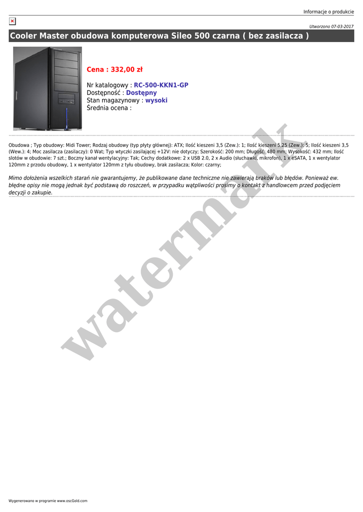 Informacje o produkcie Utworzono 07-03-2017 Cooler Master obudowa komputerowa Sileo 500 czarna ( bez zasilacza ) Cena : 332,00 zł Nr katalogowy : RC-500-KKN1-GP Dostępność : Dostępny Stan magazynowy : wysoki Średnia ocena : er m ar k Obudowa ; Typ obudowy: Midi Tower; Rodzaj obudowy (typ płyty głównej): ATX; Ilość kieszeni 3,5 (Zew.): 1; Ilość kieszeni 5,25 (Zew.): 5; Ilość kieszeni 3,5 (Wew.): 4; Moc zasilacza (zasilaczy): 0 Wat; Typ wtyczki zasilającej +12V: nie dotyczy; Szerokość: 200 mm; Długość: 480 mm; Wysokość: 432 mm; Ilość slotów w obudowie: 7 szt.; Boczny kanał wentylacyjny: Tak; Cechy dodatkowe: 2 x USB 2.0, 2 x Audio (słuchawki, mikrofon), 1 x eSATA, 1 x wentylator 120mm z przodu obudowy, 1 x wentylator 120mm z tyłu obudowy, brak zasilacza; Kolor: czarny; w at Mimo dołożenia wszelkich starań nie gwarantujemy, że publikowane dane techniczne nie zawierają braków lub błędów. Ponieważ ew. błędne opisy nie mogą jednak być podstawą do roszczeń, w przypadku wątpliwości prosimy o kontakt z handlowcem przed podjęciem decyzji o zakupie. Wygenerowano w programie www.oscGold.com