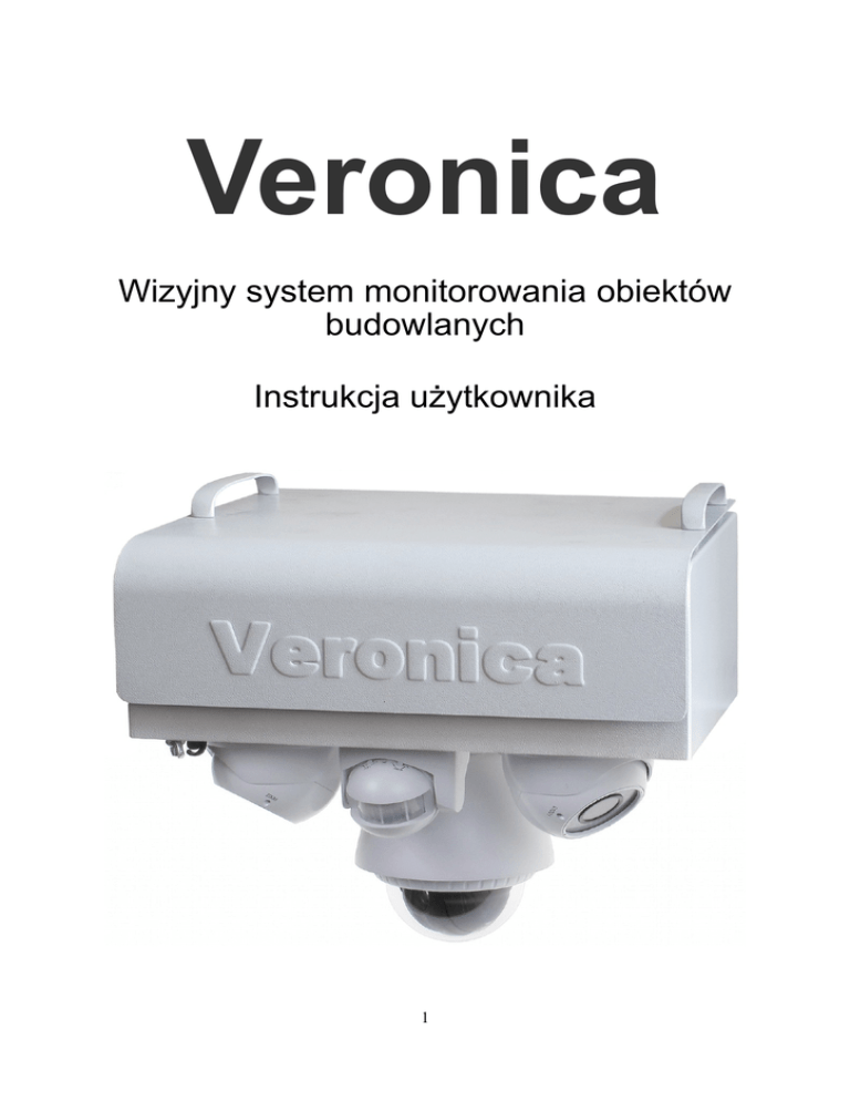 Veronica Wizyjny system monitorowania obiektów budowlanych Instrukcja użytkownika 1 Spis treści 1. System Veronica...............................................................................................................................3 1.1. Zalety wykorzystania systemu monitoringu.............................................................................3 1.2. Charakterystyka systemu..........................................................................................................4 1.3. Dane techniczne........................................................................................................................4 2. Instalacja systemu.............................................................................................................................6 2.1. Podłączenie zasilania................................................................................................................6 2.2. Regulacja kamer z oświetlaczami.............................................................................................6 2.3. Nawiązanie połączenia przez WIFI, LAN, lub WAN...............................................................7 3. Złącza wewnątrz systemu Veronica..................................................................................................8 3.1. Złącza Ethernet LAN i WAN....................................................................................................8 3.2. Złącza wejść/wyjść...................................................................................................................9 3.3. Złącza zasilania 12V dla urządzeń użytkownika....................................................................10 4. Aplikacja do konfiguracji i nadzoru systemu Veronica..................................................................11 4.1. Okno główne aplikacji............................................................................................................11 4.2. Edycja parametrów dostępowych...........................................................................................12 4.3. Zakładka „Konfiguracja”........................................................................................................13 4.4. Zakładka „Podgląd”................................................................................................................14 4.5. Zakładka „Archiwum”............................................................................................................15 4.6. Zakładka „Synchronizacja”....................................................................................................16 4.7. Zakładka „Rejestrator”...........................................................................................................17 4.8. Zakładka „System”.................................................................................................................18 4.9. Zakładka „Ruter”....................................................................................................................19 4.10. Okno sterowania kamerą obrotową......................................................................................20 5. Szczegóły konfiguracji systemu.....................................................................................................21 5.1. Zakładka „Moduł GSM”.........................................................................................................21 5.2. Zakładka „Zdarzenia”.............................................................................................................22 5.3. Zakładka „Zdjęcia”.................................................................................................................23 5.4. Zakładka „Wejścia”................................................................................................................24 5.5. Zakładka „Wyjścia”................................................................................................................25 5.6. Zakładka „Kamera obrotowa”................................................................................................26 5.7. Zakładka „Inne”......................................................................................................................27 2 1. System Veronica System przeznaczony jest do zdalnego monitorowania obiektów budowlanych. Dzięki niemu inwestor może zdalnie monitorować, archiwizować oraz przeglądać zapisy archiwów. Urządzenie wyposażone jest m.in. w jedną szybkoobrotową kamerę z 10 krotnym zoomem optycznym, dwie kamery z oświetlaczami podczerwieni, kamerę kontrolną, czujnik ruchu, dysk twardy 1 TB (przeznaczony do zapisu na żywo) oraz moduły: GSM, WLAN, RS-485, I/O. Dodatkowo na wyposażeniu znajduje się karta micro SD 16GB na którą urządzenie zapisuje zrzuty obrazu w odstępach czasu zdefiniowanych przez użytkownika tworząc dziennik budowy. Dostęp do wszystkich funkcji systemu Veronica jest możliwy za pośrednictwem aplikacji pracującej pod kontrolą systemu Windows. Oprogramowanie umożliwia zmianę ustawień systemu, poklatkowy podgląd w trybie real-time, sterowanie kamerą obrotową, a także archiwizację i przeglądanie zapisów obrazu znajdujących się w pamięci urządzenia. Kamera z oświetlaczem podczerwieni Wlot układu chłodzenia z filtrem Kamera szybkoobrotowa Czujka ruchu Przepusty kablowe Kamera kontrolna Kamera z oświetlaczem podczerwieni Wylot układu chłodzenia 1.1. Zalety wykorzystania systemu monitoringu Zastosowanie systemu monitoringu na placu budowy jest bardzo istotne ze względu na dużą wartość tego typu inwestycji i ryzyko strat wynikających np. z kradzieży materiału. Straty wynikłe w takich sytuacjach mogą zdecydowanie przekraczać koszt monitorowania. Do najważniejszych zalet systemu Veronica możemy zaliczyć: • archiwizacja wizyjna procesów zacho