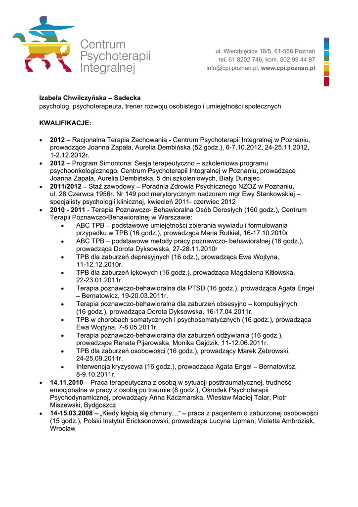 ul. Wierzbi cice 18/5, 61-568 Pozna tel. 61 8202 746, kom. 502 99 44 97 [email protected], www.cpi.poznan.pl Izabela Chwilczy ska Sadecka psycholog, psychoterapeuta, trener rozwoju osobistego i umiej tno ci spo ecznych KWALIFIKACJE: 2012 Racjonalna Terapia Zachowania - Centrum Psychoterapii Integralnej w Poznaniu, prowadz ce Joanna Zapa a, Aurelia Dembi ska (52 godz.), 6-7.10.2012, 24-25.11.2012, 1-2.12.2012r. 2012 Program Simontona: Sesja terapeutyczno szkoleniowa programu psychoonkologicznego, Centrum Psychoterapii Integralnej w Poznaniu, prowadz ce Joanna Zapa a, Aurelia Dembi ska, 5 dni szkoleniowych, Bia y Dunajec 2011/2012 Sta zawodowy Poradnia Zdrowia Psychicznego NZOZ w Poznaniu, ul. 28 Czerwca 1956r. Nr 149 pod merytorycznym nadzorem mgr Ewy Stankowskiej specjalisty psychologii klinicznej, kwiecie 2011- czerwiec 2012 2010 - 2011 - Terapia Poznawczo- Behawioralna Osób Doros ych (160 godz.), Centrum Terapii Poznawczo-Behawioralnej w Warszawie: ABC TPB podstawowe umiej tno ci zbierania wywiadu i formu owania przypadku w TPB (16 godz.), prowadz ca Maria Rotkiel, 16-17.10.2010r ABC TPB podstawowe metody pracy poznawczo- behawioralnej (16 godz.), prowadz ca Dorota Dyksowska, 27-28.11.2010r TPB dla zaburze depresyjnych (16 odz.), prowadz ca Ewa Wojtyna, 11-12.12.2010r. TPB dla zaburze l kowych (16 godz.), prowadz ca Magdalena Kit owska, 22-23.01.2011r. Terapia poznawczo-behawioralna dla PTSD (16 godz.), prowadz ca Agata Engel Bernatowicz, 19-20.03.2011r. Terapia poznawczo-behawioralna dla zaburze obsesyjno kompulsyjnych (16 godz.), prowadz ca Dorota Dyksowska, 16-17.04.2011r. TPB w chorobach somatycznych i psychosomatycznych (16 godz.), prowadz ca Ewa Wojtyna, 7-8.05.2011r. Terapia poznawczo-behawioralna dla zaburze od ywiania (16 godz.), prowadz ce Renata Pijarowska, Monika Gajdzik, 11-12.06.2011r. TPB dla zaburze osobowo ci (16 godz.), prowadz cy Marek ebrowski, 24-25.09.2011r. Interwencja kryzysowa (16 godz.), prowadz ca Agata Engel Bernatowicz, 8-9.10.2011r. 14.11.2010 Praca terapeutyczna z osob w sytuacji posttraumatycznej, trudno emocjonalna w pracy z osob po traumie (8 godz.), O rodek Psychoterapii Psychodynamicznej, prowadz cy Anna Kaczmarska, Wies aw Maciej Talar, Piotr Miszewski, Bydgoszcz 14-15.03.2008 Kiedy k bi si chmury praca z pacjentem o zaburzonej osobowo ci (15 godz.), Polski Instytut Ericksonowski, prowadz ce Lucyna Lipman, Violetta Ambroziak, Wroc aw ul. Wierzbi cice 18/5, 61-568 Pozna tel. 61 8202 746, kom. 502 99 44 97 [email protected], www.cpi.poznan.pl 2007 2009 Szko a Trenerów Psychologicznego Treningu Grupowego pod nadzorem merytorycznym Polskiego Towarzystwa Psychologicznego (220 godz.), Stowarzyszenie Doro li Dzieciom NPDN, prowadz ce ucja Sokorska Maj, Ma gorzata Wojnowska, Danuta Daszkiewicz 1998 2004 Akademia Bydgoska im. Kazimierza Wielkiego w Bydgoszczy - Studia magisterskie: psychologia obrona pracy magisterskiej w 2004 r. z wynikiem bardzo dobrym Dotychczasowe do wiadczenia zawodowe: Od 2011 - Centrum Psychoterapii Integralnej psycholog, psychoterapeuta, prowadzenie warsztatów w ramach CPI Training Od 2011 - Akademia Walki z Rakiem psycholog, psychoterapeuta, prowadzenie warsztatów z zakresu komunikacji, umiej tno ci spo ecznych dla osób chorych onkologicznie, wolontariuszy i osób wspieraj cych Od 2011 Dzienne Domy Pomocy Spo ecznej psycholog, trener umiej tno ci spo ecznych, prowadzenie diagnozy i treningu funkcji poznawczych 2011-2012 Poradnia Zdrowia Psychicznego NZOZ sta zawodowy: prowadzenie diagnozy, poradnictwa psychologicznego i psychoterapii 2011 koordynator, psycholog, trener w projekcie Polskiego Komitetu Pomocy Spo ecznej i UM Poznania - Wysoka jako ycia Seniora Od 2008 Festiwal Progressteron psycholog, trener, prowadzenie warsztatów rozwoju osobistego 2004-2011 rodowiskowy Dom Samopomocy dla Osób z Zaburzeniami Psychicznymi psycholog, trener, prowadzenie psychoterapii indywidualnej i grupowej, treningów umiej tno ci spo ecznych, diagnoza, wspó praca z instytucjami pomocy spo ecznej 2006 psycholog, trener w projektach aktywizacji zawodowej osób zagro onych wykluczeniem spo ecznym (projekty ze rodków EFS).