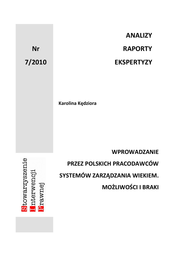 ANALIZY Nr RAPORTY 7/2010 EKSPERTYZY Karolina Kędziora WPROWADZANIE PRZEZ POLSKICH PRACODAWCÓW SYSTEMÓW ZARZĄDZANIA WIEKIEM. MOŻLIWOŚCI I BRAKI 2 Wprowadzanie przez polskich pracodawców systemów zarządzania wiekiem. Możliwości i braki SPIS TREŚCI 1. Wstęp 3 2. Ochrona prawna przed dyskryminacją w Polsce 4 3. Problem dyskryminacji osób starszych w zatrudnieniu w praktyce 6 4. Czym są systemy zarządzania wiekiem? 10 5. Przepisy krajowe a możliwość wdrażania systemów zarządzania wiekiem przez 15 pracodawców 6. Propozycje zmian systemowych 18 7. Podsumowanie 21 Stowarzyszenie Interwencji Prawnej Analizy, Raporty, Ekspertyzy 7/2010 Wprowadzanie przez polskich pracodawców systemów zarządzania wiekiem. Możliwości i braki 3 1. Wstęp Przeciętna długość życia w Unii Europejskiej stale rośnie. Spodziewana długość osób ludzi urodzonych w 1960 roku wynosiła około 67 lat dla mężczyzn i 73 lata dla kobiet. Dla nowo narodzonych Europejczyków (rocznik 2004) wynosi ona już blisko 76 lat wśród mężczyzn i prawie 82 lata wśród kobiet. Co więcej, w 1960 roku większość Europejek miała przynajmniej dwoje dzieci. Statystycznie na jedną kobietę przypadało wówczas 2,5 dziecka. Do roku 2004 ogólna stopa przyrostu naturalnego spadła do około 1,5 dziecka na kobietę. Najwyższy wskaźnik płodności (nieco poniżej dwojga dzieci na kobietę) mają Francja i Irlandia. Najniższe natomiast (wynoszące poniżej 1,25) wskaźniki notują Czechy, Łotwa, Słowacja i Polska. Im mniejszy przyrost naturalny, tym bardziej kurczy się liczba pracowników, którzy utrzymują coraz liczniejszych emerytów1. Za niecałe 20 lat na polskim rynku pracy osoby po 45 roku życia będą stanowiły prawie połowę populacji w wieku produkcyjnym, natomiast prawie 25% mieszkańców Polski będzie miało powyżej 65 lat2. W związku z powyższym pracodawcy w Polsce mają ostatnią szansę na przystosowanie istniejących systemów zarządzania firmą, w taki sposób, by byli zdolni pozyskać bądź zatrzymać osoby starsze jako pracowników. Nie bez znaczenia jest fakt, że wraz z postępem technicznym, wiele zawodów stało się zdecydowanie mniej wymagających pod względem fizycznym niż w minionych latach, stąd ten aspekt nie jest już tak istotny. Na pierwszy plan wysuwa się potencjał intelektualny w postaci doświadczenia oraz przywiązania do firmy pracowników starszych wiekiem. Oczywiście problem jest złożony. Z jednej strony, wciąż pokutują stare nawyki dojrzałych pracowników, którzy zaprzestając rozwoju w pracy poprzez samokształcenie, np. w zakresie nowych rozwiązań technologicznych, pozwalają, by ich umiejętności się dezaktualizowały. Odpowiedzialność leży jednak również po stronie pracodawców, którzy zbyt małą wagę przywiązują do potrzeby ciągłego szkolenia i doskonalenia umiejętności pracowników. Ponadto zwraca uwagę brak polityki państwa, która miałaby na celu promowanie potrzeby ciągłego doskonalenia zawodowego w obliczu nowych wyzwań rynku pracy starzejącego się społeczeństwa. Do tego dochodzą stereotypy na temat starszych pracowników. Zdarzają się oczywiście tacy, którzy swoim zachowaniem wpisują się w stereotyp osoby starszej, zaprzestającej nauki w pracy (przez co jej umiejętności pozostają w tyle w porównaniu do umiejętności młodszych współpracowników), której nastawienie do pracy jest pozbawione motywacji i która ze względu na zły stan zdrowia często korzysta ze zwolnień lekarskich. Przez to, że skutki takiej postawy są dotkliwie odczuwane przez pracodawców, niechętnie zatrudnia się osoby starsze. Zapomina się tym samym o rzeszy aktywnych osób w wieku 45+, których nie postrzega się przez pryzmat ich doświadczenia i kwalifikacji, niezważając na wiek. Problem stereotypizacji tej grupy pracowników, często prowadzi do zakazanej prawem dyskryminacji, która w praktyce wyklucza osoby starsze z rynku pracy. Przedmiotem niniejszej publikacji będzie przede wszystkim przedstawienie konkretnych systemów zarządzania wiekiem, ukierunkowanych na zwiększenie zaangażowania osób starszych w pracę, jak również 1 2 http://epp.eurostat.ec.europa.eu Prognoza demograficzna na lata 2003-2030, GUS 2004. Stowarzyszenie Interwencji Prawnej Analizy, Raporty, Ekspertyzy 7/2010 Wprowadzanie przez polskich pracodawców systemów zarządzania wiekiem. Możliwości i braki 4 prawnego umocowania zastosowania powyższych rozwiązań przez pracodawców. Celem wprowadzenia do tematu oraz lepszego zrozumienia obecnej sytuacji osób starszych na rynku pracy, publikacja obejmie również analizę przepisów antydyskryminacyjnych oraz opis przypadków dyskryminacji ze względu na wiek najczęściej rozpatrywanych przez powszechne sądy krajowe oraz Europejski Trybunał Sprawiedliwości (instytucja sądownicza Unii Europejskiej). 2. Ochrona prawna przed dyskryminacją w Polsce Zakaz dyskryminacji zawarty jest w art. 32 Konstytucji RP, zgodnie z którym „Wszyscy są wobec prawa równi. Wszyscy mają prawo do równego traktowania przez władze publiczne. Nikt nie może być dyskryminowany w życiu politycznym, społecznym lub gospodarczym z jakiejkolwiek przyczyny“. W sposób szczegółowy zakaz dyskryminacji został uregulowany w rozdziale II a kodeksu pracy (dalej: k.p.). Art. 183a § 1 k.p. stanowi, że wszyscy pracownicy powinni być równo traktowani w zakresie nawiązania i rozwiązania stosunku pracy, warunków zatrudnienia, awansowania oraz dostępu do szkolenia w celu podnoszenia kwalifikacji zawodowych, w szczególności bez względu na płeć, wiek, niepełnosprawność, rasę, religię, narodowość, przekonania polityczne, przynależność związkową, pochodzenie etniczne, wyznanie, orientację seksualną, a także bez względu na zatrudnienie na czas określony lub nieokreślony albo w pełnym lub w niepełnym wymiarze czasu pracy. Kodeks pracy zawiera również definicje poszczególny