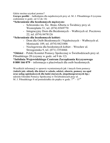 Gdzie moŜna uzyskać pomoc? Gorące posiłki – Jadłodajnia dla najuboŜszych przy ul. M. J. Piłsudskiego 8 (czynna codziennie w godz. od 12 do 14) *Schronienie dla bezdomnych męŜczyzn: - Schronisko im. Św. Brata Alberta w Świdnicy przy ul. Westerplatte 51, tel. (074) 8569770 - Integracyjny Dom dla Bezdomnych – Wałbrzych ul. Pocztowa 22, tel. (074) 8478126 *Schronienie dla bezdomnych kobiet: - Dom dla Osób Bezdomnych i NajuboŜszych – Wałbrzych ul. Moniuszki 109, tel. (074) 8421006 - Noclegownia dla bezdomnych kobiet – Wrocław ul. Strzegomska 9, tel. (071) 3554466 *OdzieŜ – Polski Komitet Pomocy Społecznej w Świebodzicach przy ul. Piłsudskiego 28 (czynny w godz. od 9 do 12) *Infolinia Wojewódzkiego Centrum Zarządzania Kryzysowego 0 800 166 079 – informacja o placówkach dla osób bezdomnych. Wszelkich informacji w sprawie wymienionych jak i innych form pomocy (takich jak: obiady dla dzieci w szkole, odzieŜ, obuwie, pomocy na opał oraz usług opiekuńczych dla ludzi starszych, niepełnosprawnych itp.) udziela Ośrodek Pomocy Społecznej w Świebodzicach przy ul. M. J. Piłsudskiego 8 od poniedziałku do piątku w godz. 730 – 1530