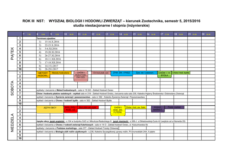 ROK III NST: NIEDZIELA SOBOTA PIĄTEK 7 ROK I 1 2 3 4 5 6 7 8 9 10 1 2 3 4 5 6 7 8 9 10 1 2 3 4 5 6 7 8 9 10 7.30 8 8.30 WYDZIAŁ BIOLOGII I HODOWLI ZWIERZĄT – kierunek Zootechnika, semestr 5, 2015/2016 studia niestacjonarne I stopnia (inżynierskie) 9 9.30 10 11 10.30 11.30 12 12.30 13 13.30 14 14.30 15 15.30 16 16.30 17 18 17.30 18.30 19 Terminarz zjazdów: 1) 15-16.X.2016 2) 22-23.X.2016 3) 5-6.XI.2016 4) 19-20.XI.2016 5) 26-27.XI.2016 6) 10-11.XII.2016 7) 17-18.XII.2016 8) 14-15.I.2017 9) 28-29.I.2017 METODY HODOWL. Metody hodowlane CHÓW I HOD.PTAKÓW OZD. Ch.hod.ptak.ozd. ŻYW. ZW. I PASZ. Żyw. zw. i paszozn. CHÓW I H. BYDŁA Chów i hod. bydła wykłady i ćwiczenia z Metod hodowlanych - sala nr 15 GO - Zakład Hodowli Owiec Chów i hodowla ptaków ozdobnych - wykład sala nr 218 - Zakład Hodowli Drobiu, ćwiczenia sala sala 230, Katedra Higieny Środowiska i Dobrostanu Zwierząt wykład i ćwiczenia z Żywienia zwierząt i paszoznawstwa - sala nr 392 - Katedra Żywienia Zwierząt i Paszoznawstwa wykład i ćwiczenia z Chowu i hodowli bydła - sala nr 302 - Zakład Hodowli Bydła JĘZYK OBCY BIOL.ZIÓŁ I ROŚL.UŻ. Biol.ziółi rośl.użytk. CHÓW I HOD. ZW. FUTERK. Chów i hod. zw. futer. PODST. MARKET. Podst. market. Języka obcy: język angielski - s.104 w budynku SJO ul. Mikulicza-Radeckiego 6; język niemiecki - s.306-J ul.Składowskiej-Curie 42 (wejście od ul.Norwida 25) wykład i ćwiczenia z Chowu i hodowli zwierząt futerkowych - sala nr 14 O - Zakład hodowli Owiec, ul. Kożuchowska 5b wykłady i ćwiczenia z Podstaw marketingu - sala 377 - Zakład Hodowli Trzody Chlewnej wykład i ćwiczenia z Biologia ziółi roślin użytkowych - s.236, Katedra Szczegółowej uprawy roślin, Pl.Grunwaldzki 24A, II piętro Wydział BIOLOGII I HODOWLI ZWIERZĄT kierunek Zootechnika semestr 2 2004/2005 19.30 20 20.30