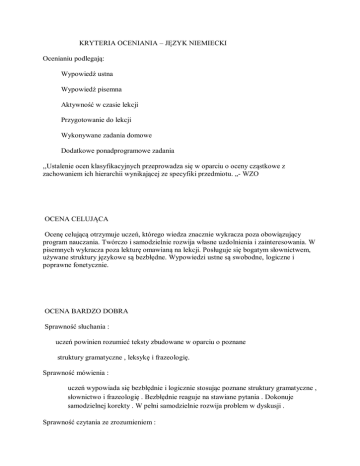 KRYTERIA OCENIANIA – JĘZYK NIEMIECKI Ocenianiu podlegają: Wypowiedź ustna Wypowiedź pisemna Aktywność w czasie lekcji Przygotowanie do lekcji Wykonywane zadania domowe Dodatkowe ponadprogramowe zadania ,,Ustalenie ocen klasyfikacyjnych przeprowadza się w oparciu o oceny cząstkowe z zachowaniem ich hierarchii wynikającej ze specyfiki przedmiotu. „- WZO OCENA CELUJĄCA Ocenę celującą otrzymuje uczeń, którego wiedza znacznie wykracza poza obowiązujący program nauczania. Twórczo i samodzielnie rozwija własne uzdolnienia i zainteresowania. W pisemnych wykracza poza lekturę omawianą na lekcji. Posługuje się bogatym słownictwem, używane struktury językowe są bezbłędne. Wypowiedzi ustne są swobodne, logiczne i poprawne fonetycznie. OCENA BARDZO DOBRA Sprawność słuchania : uczeń powinien rozumieć teksty zbudowane w oparciu o poznane struktury gramatyczne , leksykę i frazeologię. Sprawność mówienia : uczeń wypowiada się bezbłędnie i logicznie stosując poznane struktury gramatyczne , słownictwo i frazeologię . Bezbłędnie reaguje na stawiane pytania . Dokonuje samodzielnej korekty . W pełni samodzielnie rozwija problem w dyskusji . Sprawność czytania ze zrozumieniem : uczeń powinien poprawnie przeczytać głośno tekst zawierający znaną mu leksykę a także teksty z nieznaną mu leksyką ale o regularnej wymowie Sprawność pisania : uczeń powinien bezbłędnie przygotowywać zadania pisemne , uzupełniane teksty leksykalne. Samodzielnie redaguje krótkie i dłuższe logiczne wypowiedzi Stosunek do przedmiotu : uczeń zawsze przygotowany do lekcji , wykonuje polecenia nauczyciela , bierze aktywny udział w lekcji . OCENA DOBRA Sprawność słuchania : ocenę dobrą otrzymuje uczeń który opanował w dużym zakresie sprawność słuchania zawartą w podstawie programowej . Rozumie tekst , potrafi ze sporadyczną pomocą nauczyciela odczytać myśl główną , określić rodzaj tekstu , funkcję tekstu , styl i język Sprawność mówienia : uczeń potrafi wypowiadać się w oparciu o poznane treści . Uczeń stosuje zróżnicowane struktury leksykalne i gramatyczne z zachowaniem zasad wymowy i informacji . Popełnia nieliczne błędy w nieznacznym stopniu zakłócające komunikację Czytanie ze zrozumieniem : uczeń potrafi głośno czytać z drobnymi błędami językowymi . Rozumie tekst , potrafi wyciągnąć najważniejsze informacje . Oddaje treść tekstu ,pracuje zgodnie ze wskazaniami nauczyciela Sprawność pisania : uczeń potrafi konstruować różne formy wypowiedzi z użyciem odpowiednich środków językowych formułuje i uzasadnia własne opinie . Wypowiedź jest logiczna zgodna z tematem . Uczeń stosuje urozmaicone słownictwo, nieliczne błędy nie zakłócają znacznie komunikacji . Stosunek do przedmiotu : uczeń jest przygotowany do lekcji , zapytany reaguje poprawnie , stara się aktywnie uczestniczyć w lekcji. OCENA DOSTATECZNA Sprawność słuchania : ocenę dostateczną otrzymuje uczeń , który zadawalająco opanował sprawność słuchania , tzn. z pomocą nauczyciela potrafi odczytać najważniejszą informację z tekstu . Jest w stanie odpowiedzieć na krótkie pytania stawiane do tekstu Sprawność mówienia : uczeń przestrzega na ogół zasad poprawności w zakresie budowy zdań . Wypowiedzi są zgodne z tematem , ogólnikowe . Uczeń nie używa urozmaiconych struktur gramatycznych . W wypowiedziach występują uchybienia w doborze słownictwa, co zakłóca często komunikację Czytanie ze zrozumieniem: uczeń w miarę poprawnie czyta tekst. Jest w stanie przy pomocy nauczyciela przetłumaczyć go na język ojczysty, jednocześnie jest w stanie odpowiedzieć na proste pytania dotyczące tekstu Sprawność pisania: uczeń konstruuje wypowiedzi zgodnie z tematem ale temat ujęty jest jednostronnie, popełnia błędy gramatyczne, interpunkcyjne, które zakłócają swobodne rozumienie tekstu. Mało urozmaicone struktury składniowe na poziomie średniozaawansowanym. Stosunek do przedmiotu uczeń samodzielnie wykonuje prace domowe lecz popełnia błędy, nie pracuje systematycznie na lekcji. Często pytany, nie jest w stanie udzielić samodzielnie odpowiedzi poprawnej. Uczeń czasami zgłasza swój udział w konwersacjach, dyskusjach. OCENA DOPUSZCZAJĄCA Sprawność słuchania: ocenę dopuszczającą otrzymuje uczeń, którego wiedza i umiejętności dopiero przy pomocy nauczyciela pozwalają na wykonanie zadań o niewielkim stopniu trudności. Uczeń jest w stanie odpowiedzieć na najprostsze pytania do słuchanego tekstu. W trakcie wypowiedzi popełnia wiele błędów, które często uniemożliwiają prawidłową komunikację Sprawność mówienia: komunikacja z uczniem jest zachowana w ograniczonym zakresie. Uczeń dysponuje niewielkim zasobem słownictwa, który nie pozwala mu na pełną odpowiedź i wykazanie się właściwą dla sytuacji reakcją językową. Popełnia liczne błędy leksykalne i gramatyczne utrudniające porozumiewanie się oraz błędy w wymowie i intonacji zdania. Sprawność czytania ze zrozumieniem: technika cichego czytania ze zrozumieniem pozwala na ogólnikowe zrozumienie tekstu. Często popełnia błędy w wymowie uniemożliwiające komunikację. Sprawność pisania: uczeń poprawnie pisze wyrazy i grupy wyrazowe z zakresu podstawowego. Nie jest w stanie skonstruować tekstu dłuższego mimo wskazówek nauczyciela. Wypowiedź często nie pokrywa się w całości z tematem, jest niespójna, nielogiczna. Uczeń popełnia liczne błędy gramatyczne, ortograficzne i interpunkcyjne. Często używa powtórzeń. Stosunek do przedmiotu: prace domowe wykonane są bardzo często błędnie lub niesamodzielnie. Uczeń nie angażuje się w prace na lekcji. Często wolno reaguje na polecenia nauczyciela, potrzebuje wielu powtórzeń, stosuje język ojczysty. OCENA NIEDOSTATECZNA Ocenę niedostateczną otrzymuje uczeń, który: nie opanował techniki głośnego i cichego czytania w stopniu dopuszc