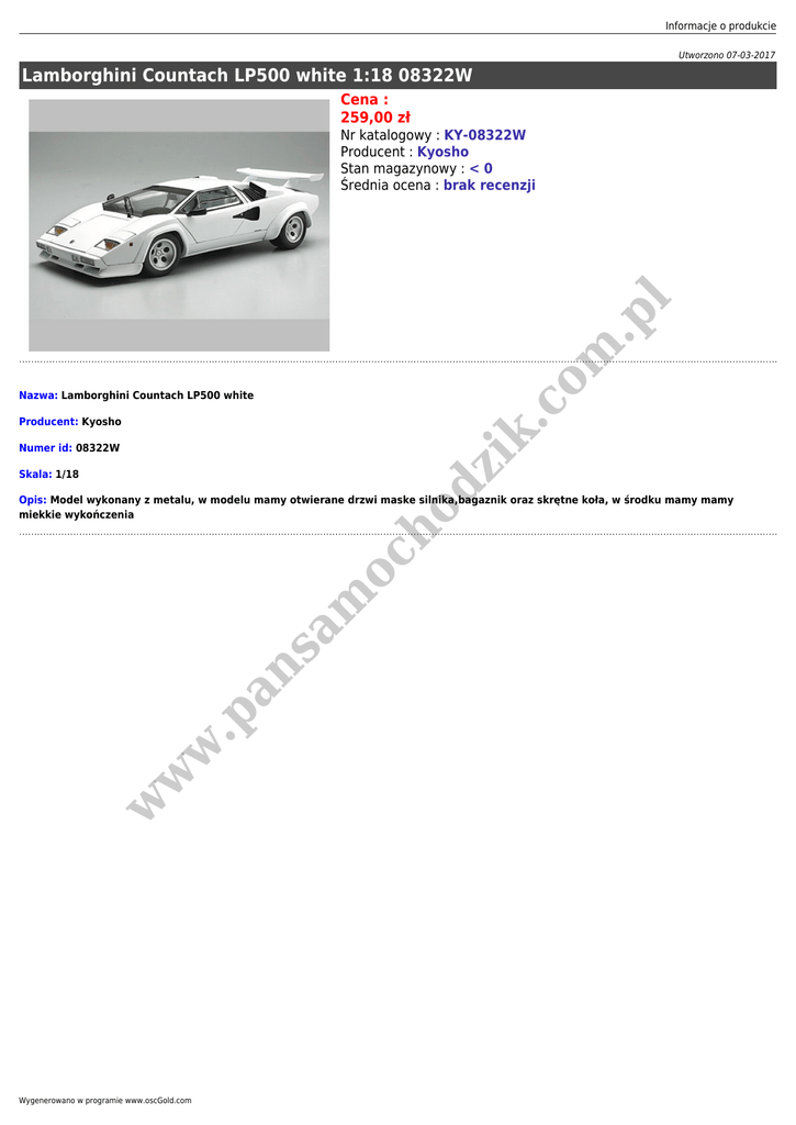 Informacje o produkcie Utworzono 07-03-2017 Lamborghini Countach LP500 white 1:18 08322W Cena : 259,00 zł om .p l Nr katalogowy : KY-08322W Producent : Kyosho Stan magazynowy : < 0 Średnia ocena : brak recenzji .c Nazwa: Lamborghini Countach LP500 white dz ik Producent: Kyosho Numer id: 08322W Skala: 1/18 w w w .p an sa m oc ho Opis: Model wykonany z metalu, w modelu mamy otwierane drzwi maske silnika,bagaznik oraz skrętne koła, w środku mamy mamy miekkie wykończenia Wygenerowano w programie www.oscGold.com